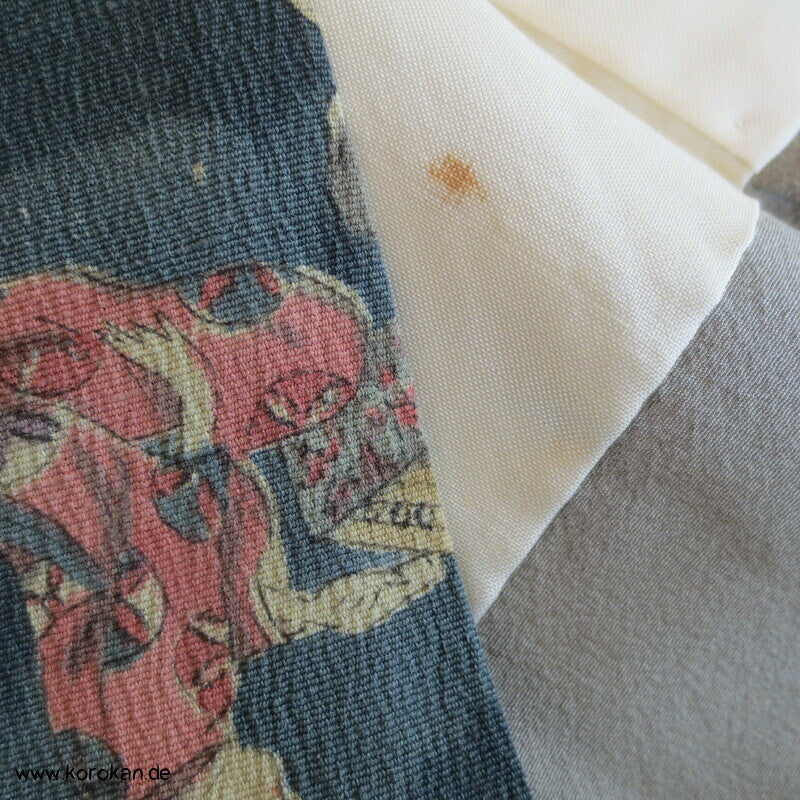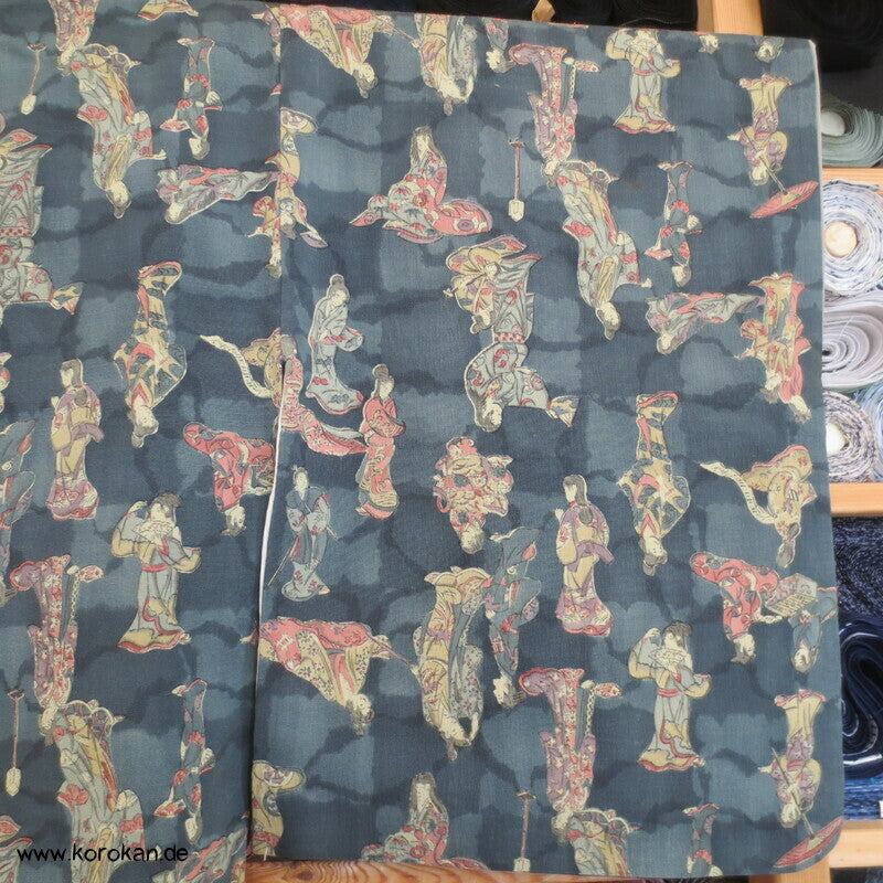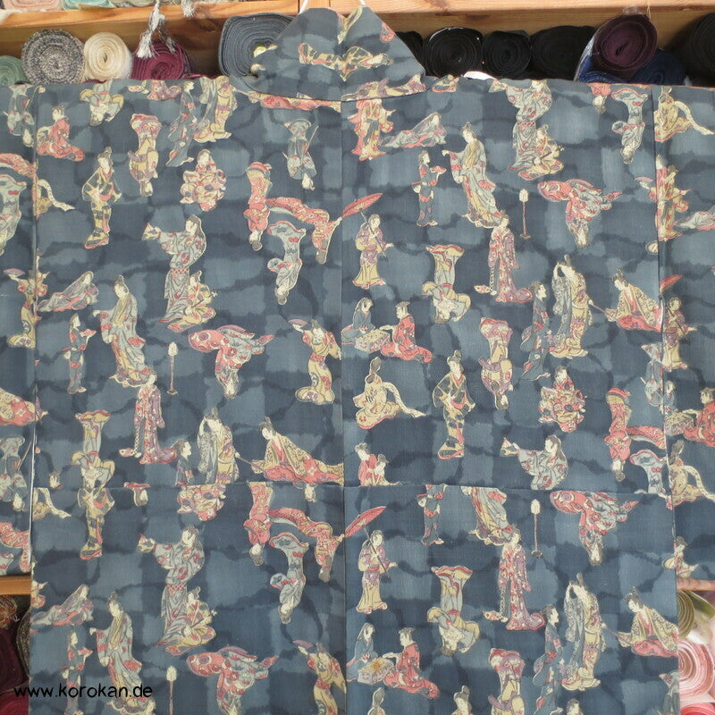 Vintage Tsumugi Seiden Komon Kimono spielende Geisha Druck auf indigo, oberes Futter helle Seide, unteres Hakkake Futter in grauer Honan Seide.