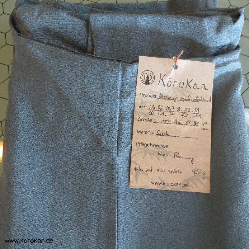 Vintage Homongi Kimono blaugrauer Seidencrepe, bemalt mit spielendem Kind und Drachen und Farbverlauf, feinem oberen hellen Seidenfutter und unterem Hakkake Seidenfutter mit lila Bokashi Verlaufsrand.