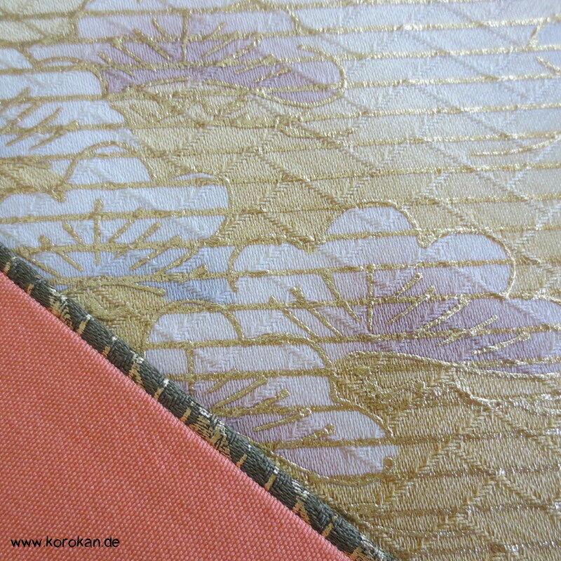 japanischer Vintage Furisode Higaki Flechtmuster Seidendamast Kimono Gartenlandschaft, Farbverlauf, Kraniche, lauter Details, viel Golddruck, oberes Futter helle Seide, unteres Hakkake Seidenfutter mit rosa Bokashi Verlaufsrand