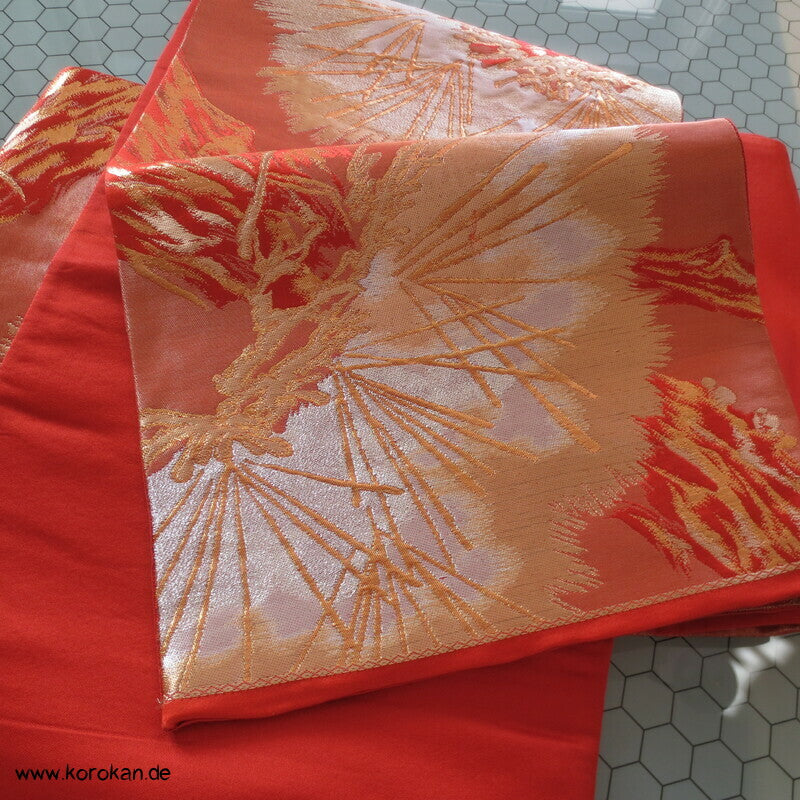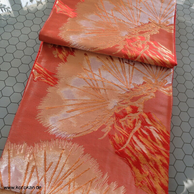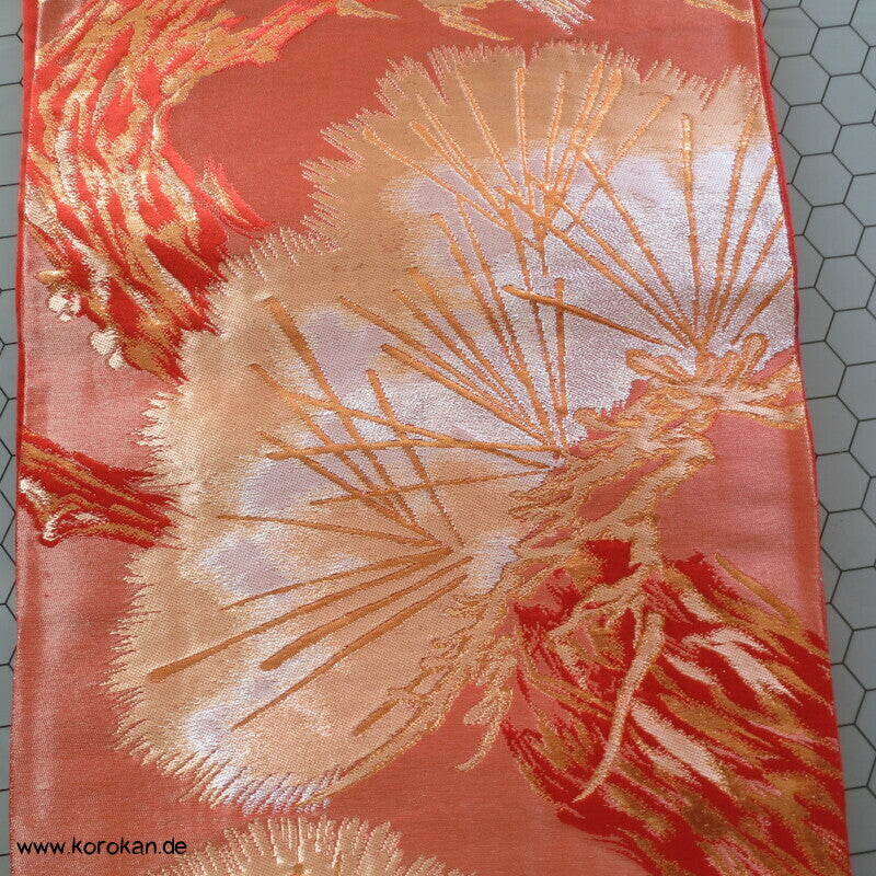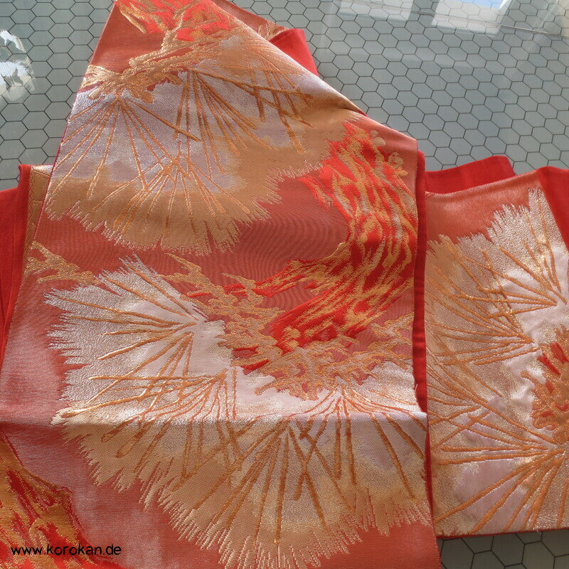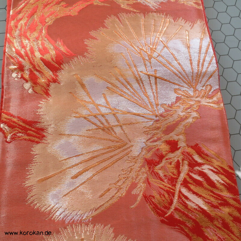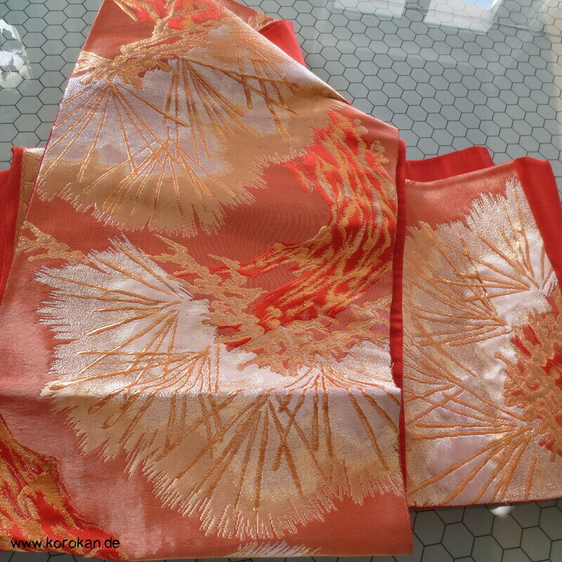 japanischer Vintage Fukuro Obi für Kimono Seidenbrokat stilisierte Kiefern in gold in hellrot