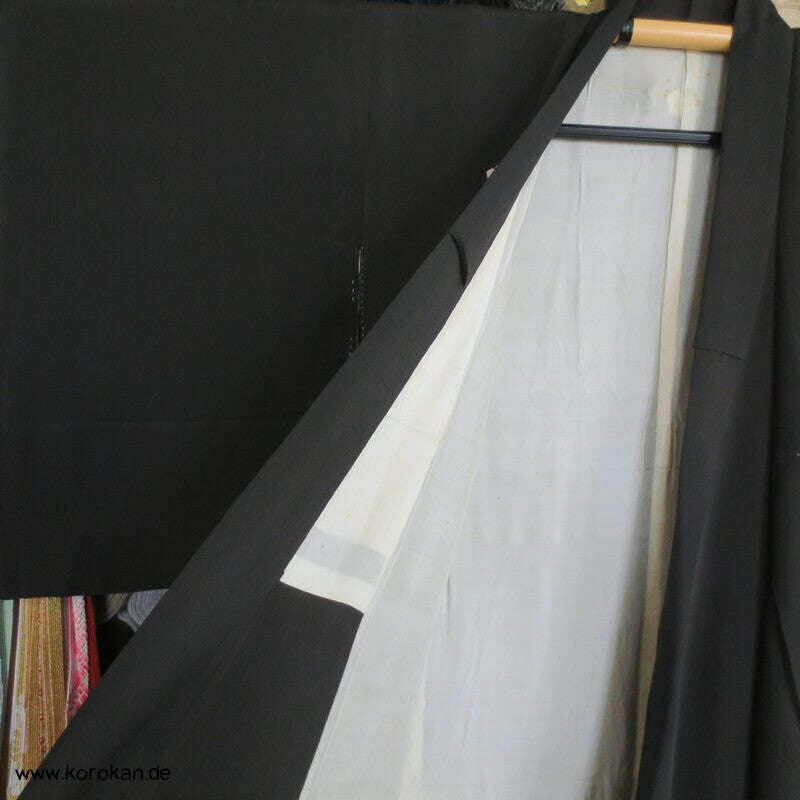 antiker Tomesode formeller Kimono aus schwarzem Seiden Crepe, bemalt mit symmetrischen Bambusstäben innen und aussen, teilbestickt, 5 Mon, oberes Futter hell, Hakkake unteres Futter Oberstoff mit Motiven.