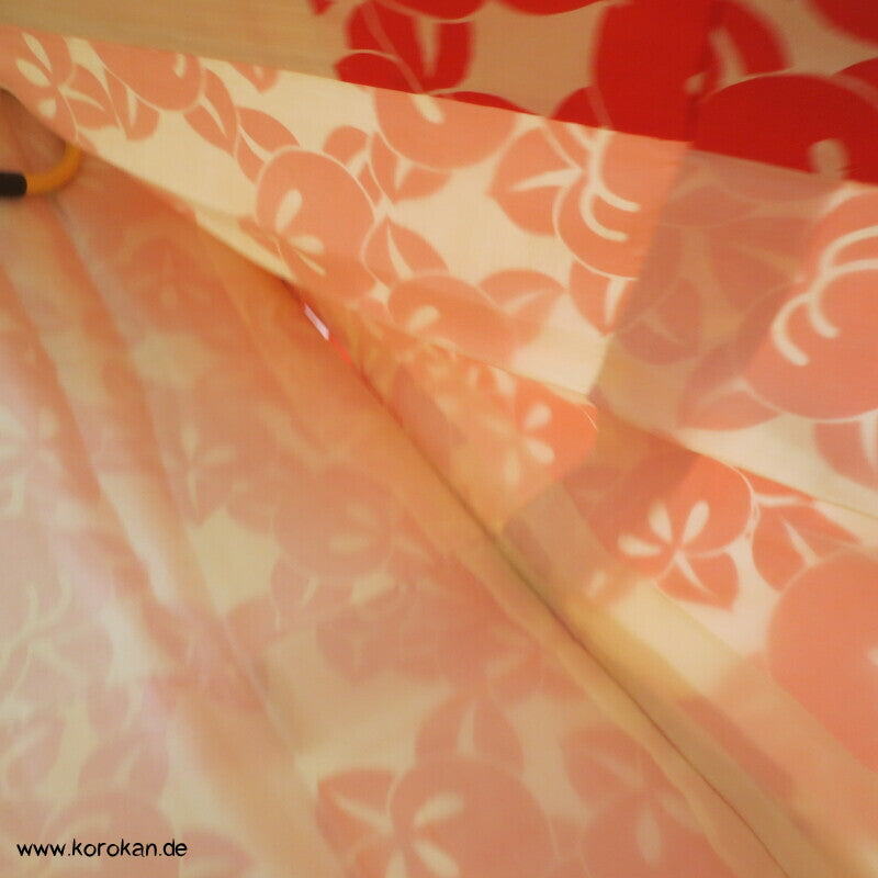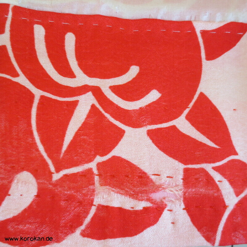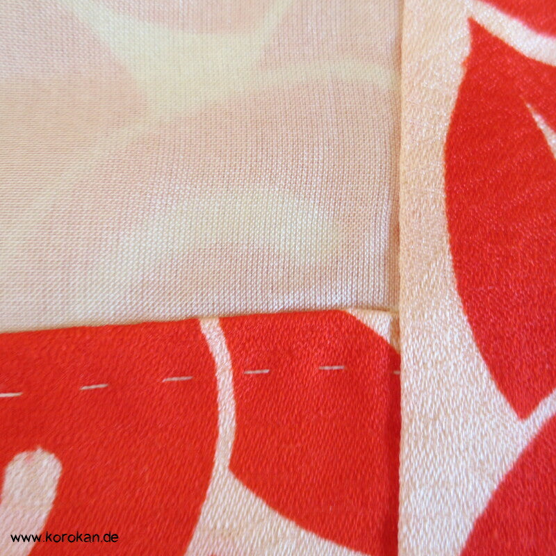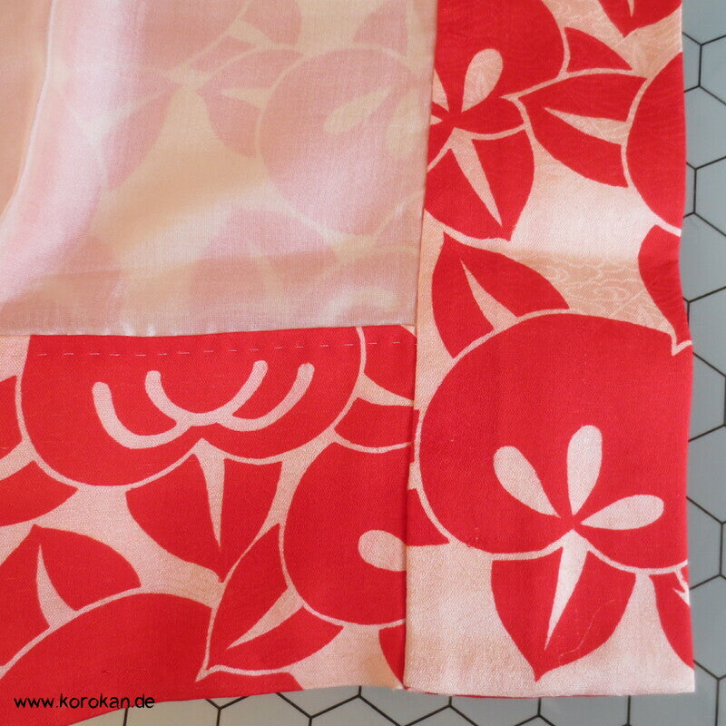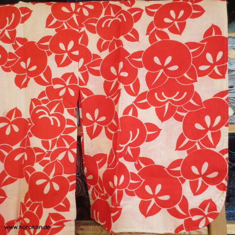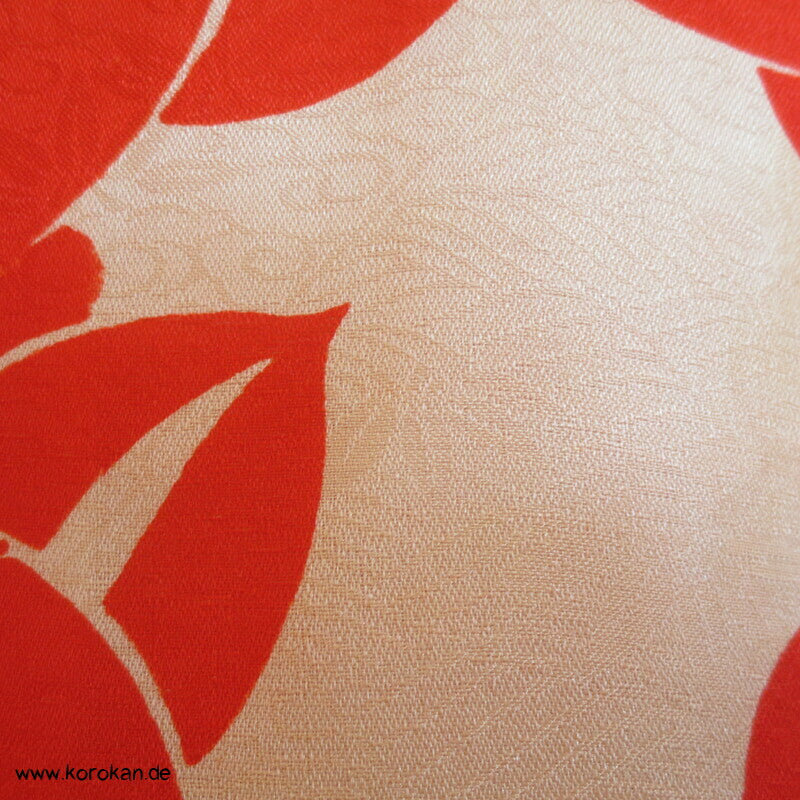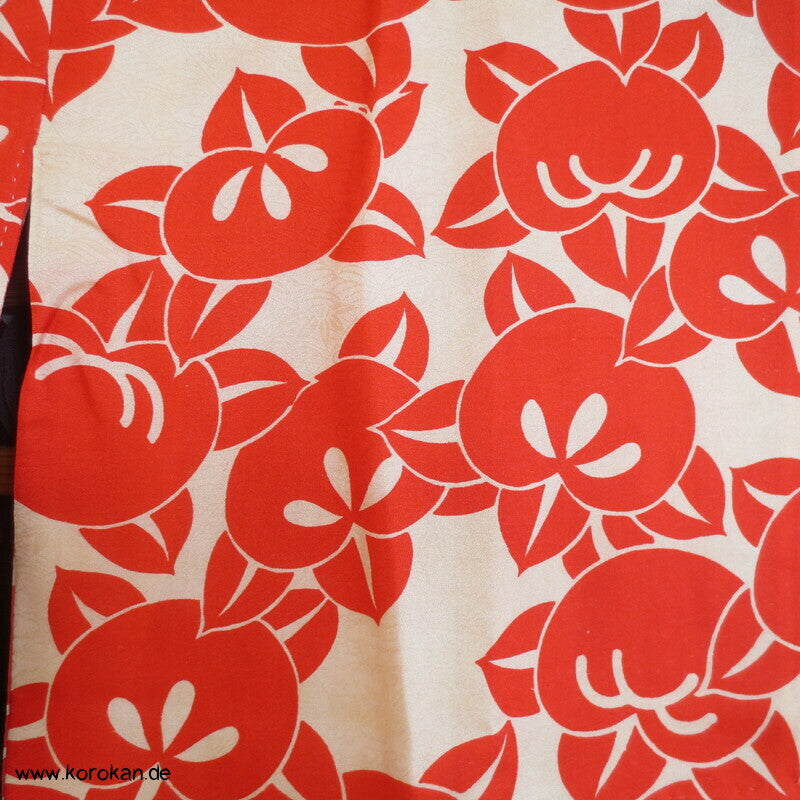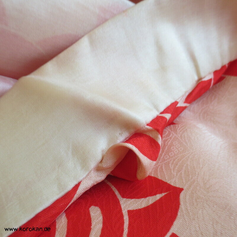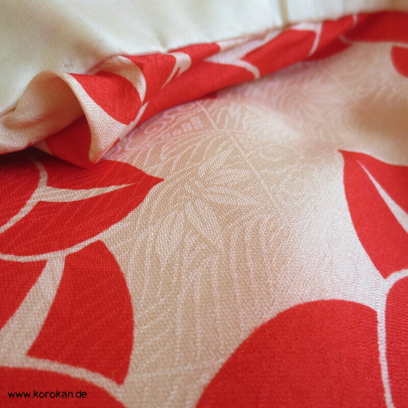 Vintage, eher antiker Juban Unter Kimono Seidendamast mit großem Tachibana Druck in rot, hellem Kragen