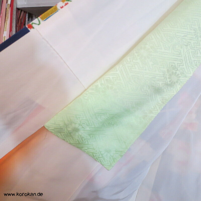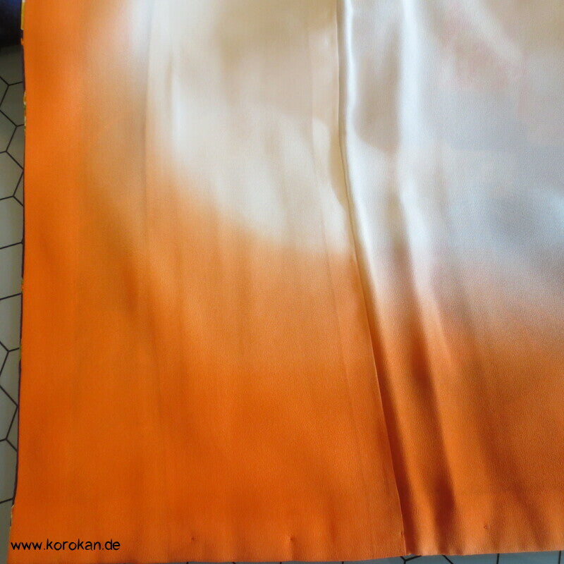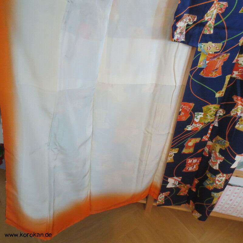 Vintage edler Komon Kimono aus schwerer Crepe Seide mit Kimono und Kimonoteilen und Flechtbändern Druck, oberes Futter helle Seide, unteres Hakkake orange Bokashi Verlaufsrand Crepe de Chine, mit jadegrünem Seiden Han Eri eingenäht