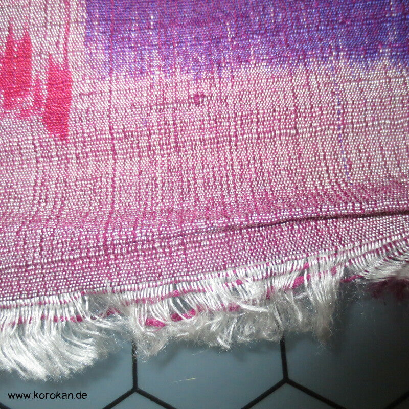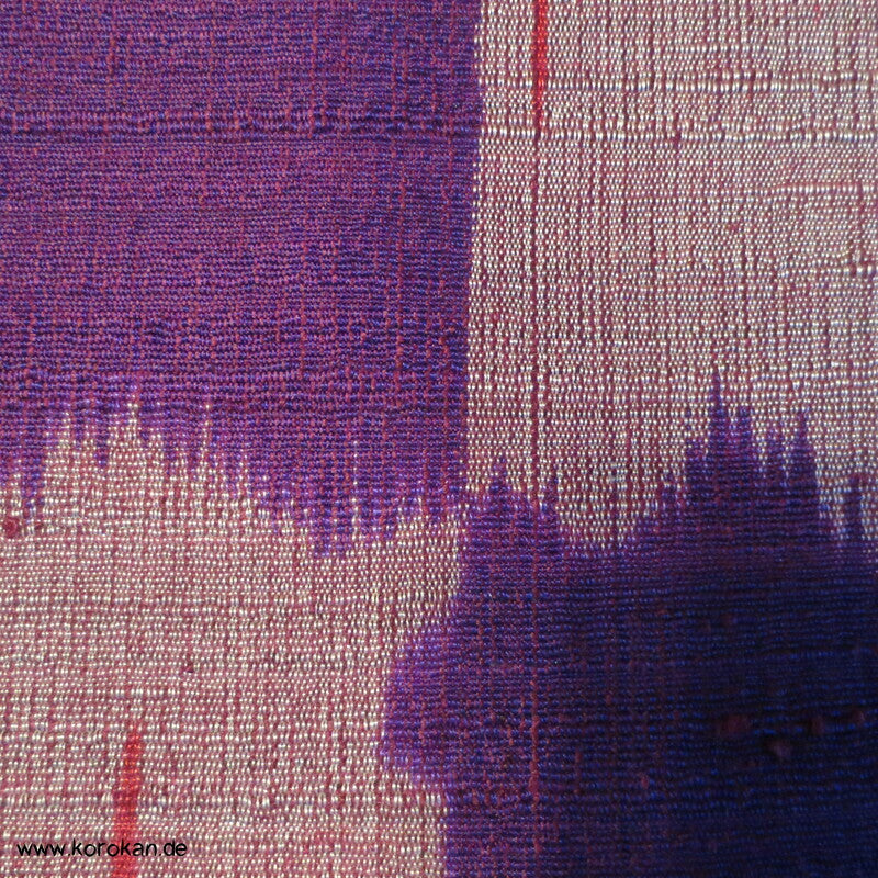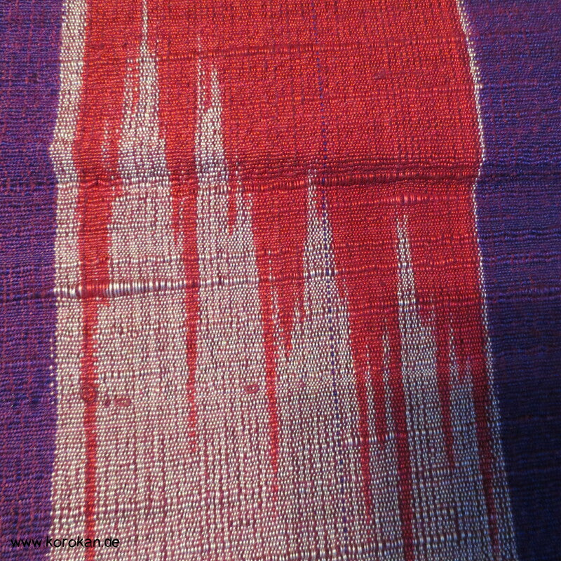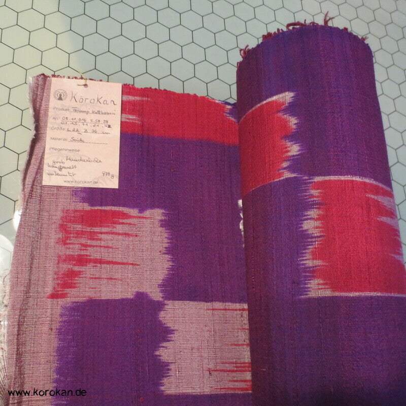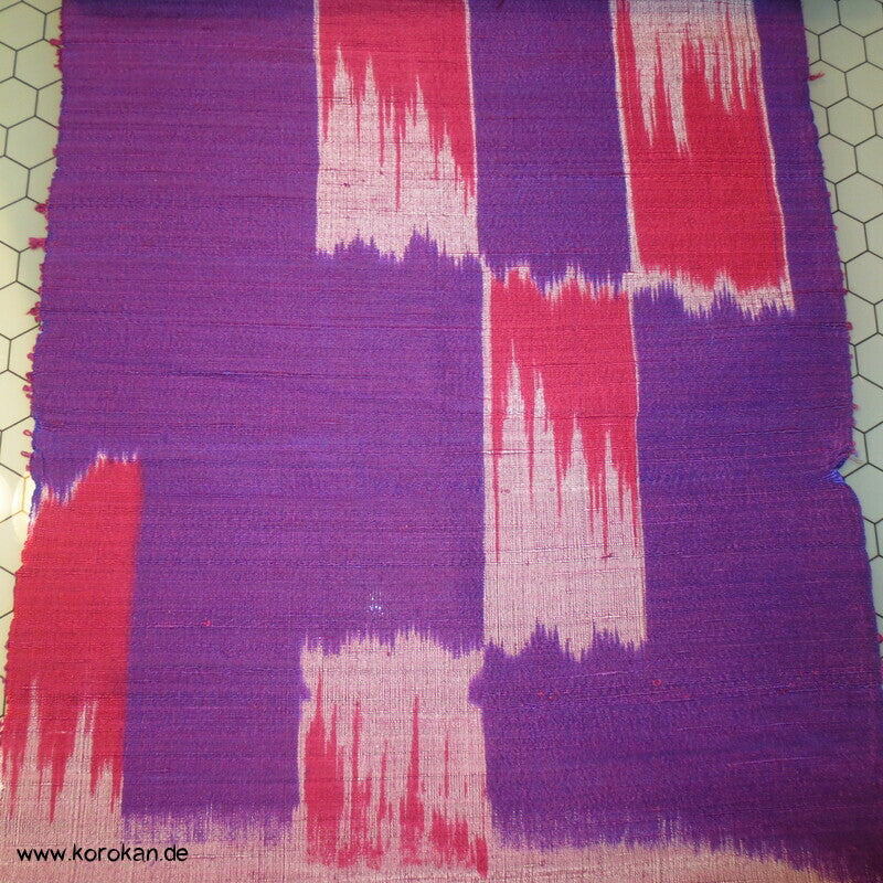 Vintage, eher antike handgesponnen, handgewebte, unbenutzte Ensemble Tanmono Stoffrolle lila rot Kasuri Streifen Tsumugi japanische Kimono Seide, für Haori oder Kimono oder anderes