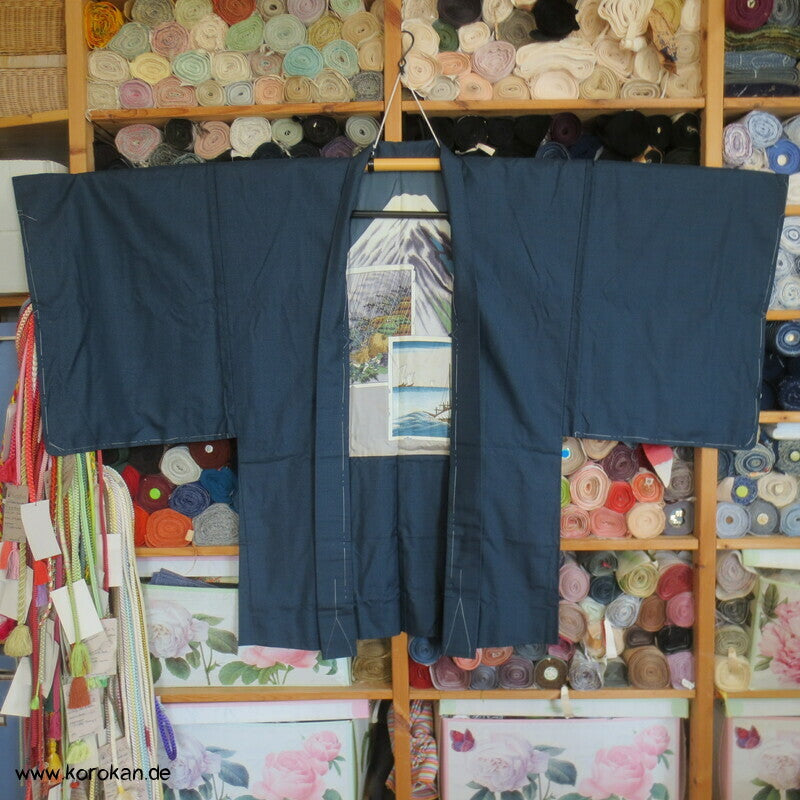 Vintage Set aus Kimono und Haori aus blau - schwarz fein in garngefärbter Kikko Kasuri Technik gemusterter Tsumugi Seide / Wollemischung. Kimono mit klassischem dunkelblauem Seidenfutter, Haori mit Seidenfutter Tokkaido Szenen als Bilder vor Fuji san.