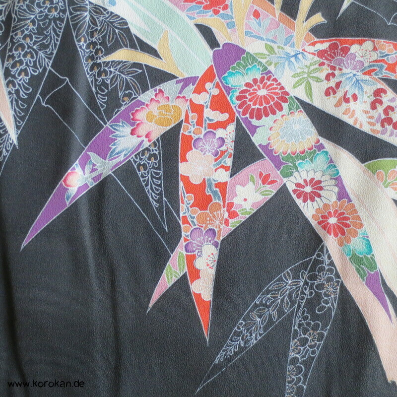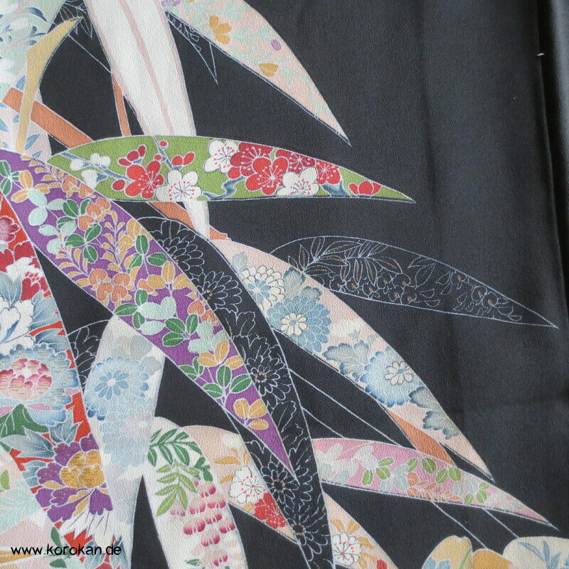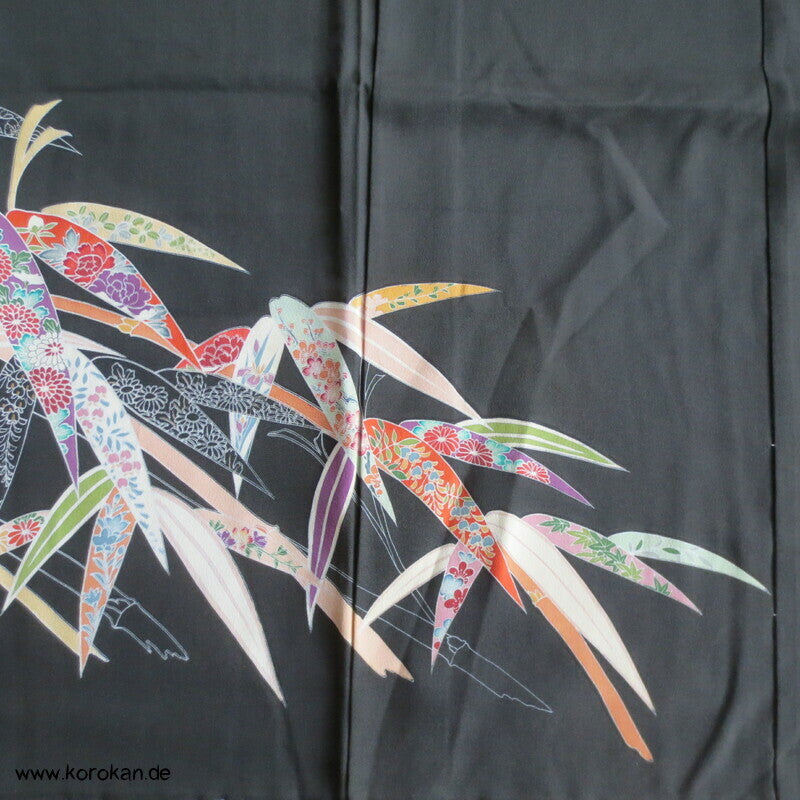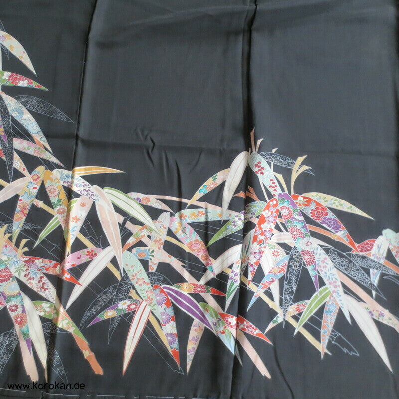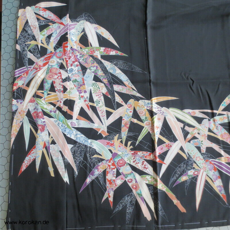 Tomesode, bunt gemusterte Bambusblätter Seiden Karieba