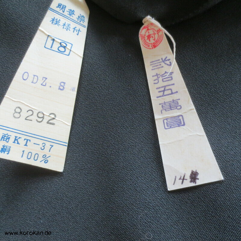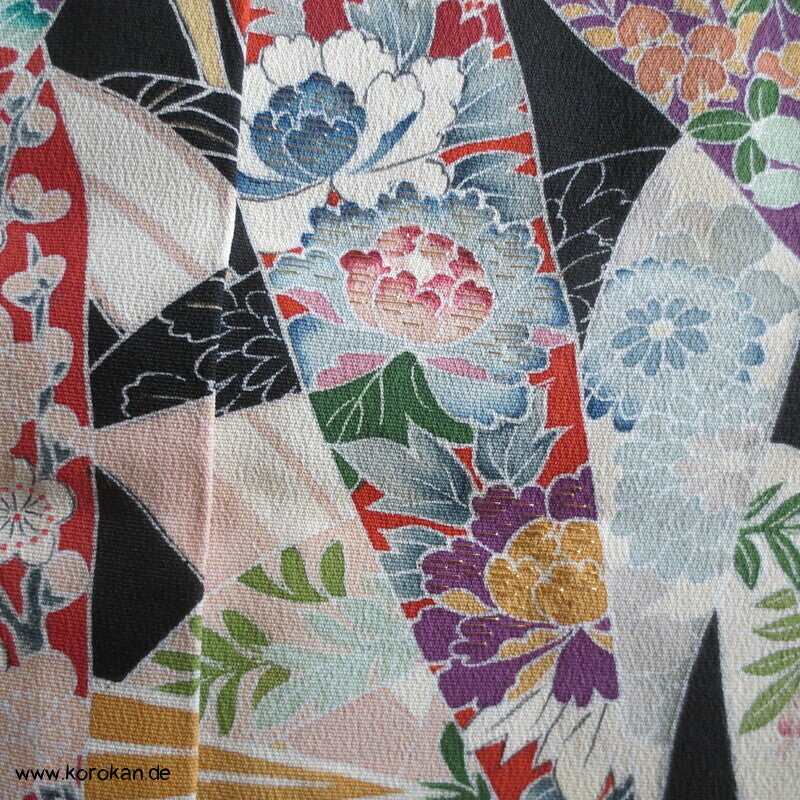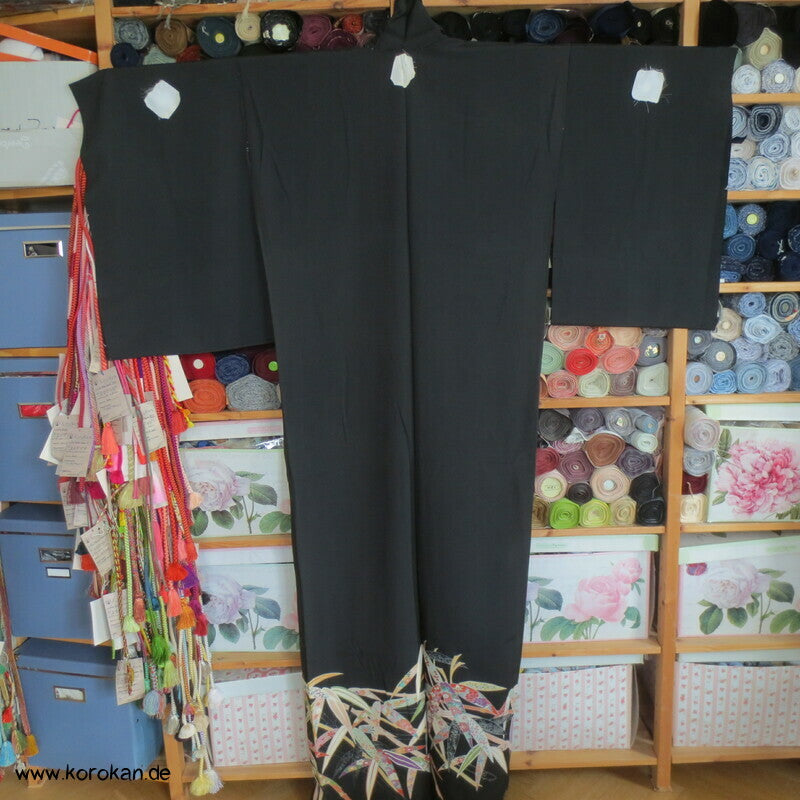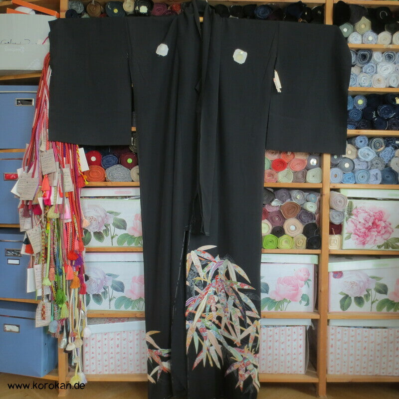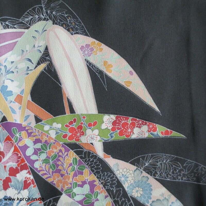 Tomesode, bunt gemusterte Bambusblätter Seiden Karieba