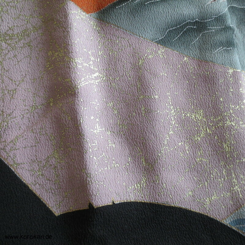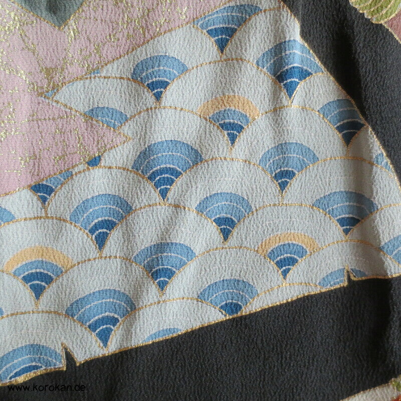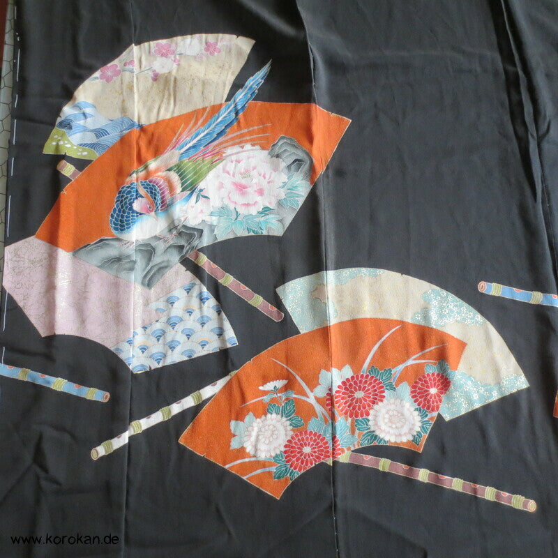 Vintage unbenutzter Karieba Tomesode, geheftet, nicht genäht, Fächer und Vögeln , neuer Stoff, Seide mit Stempeln