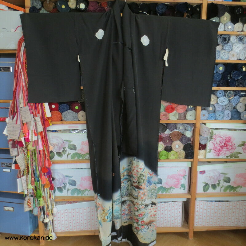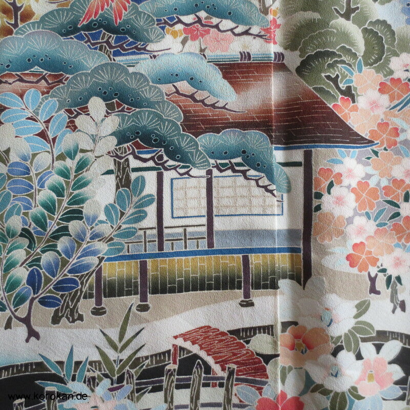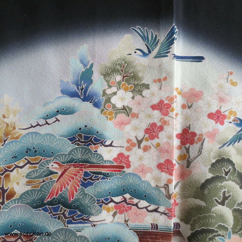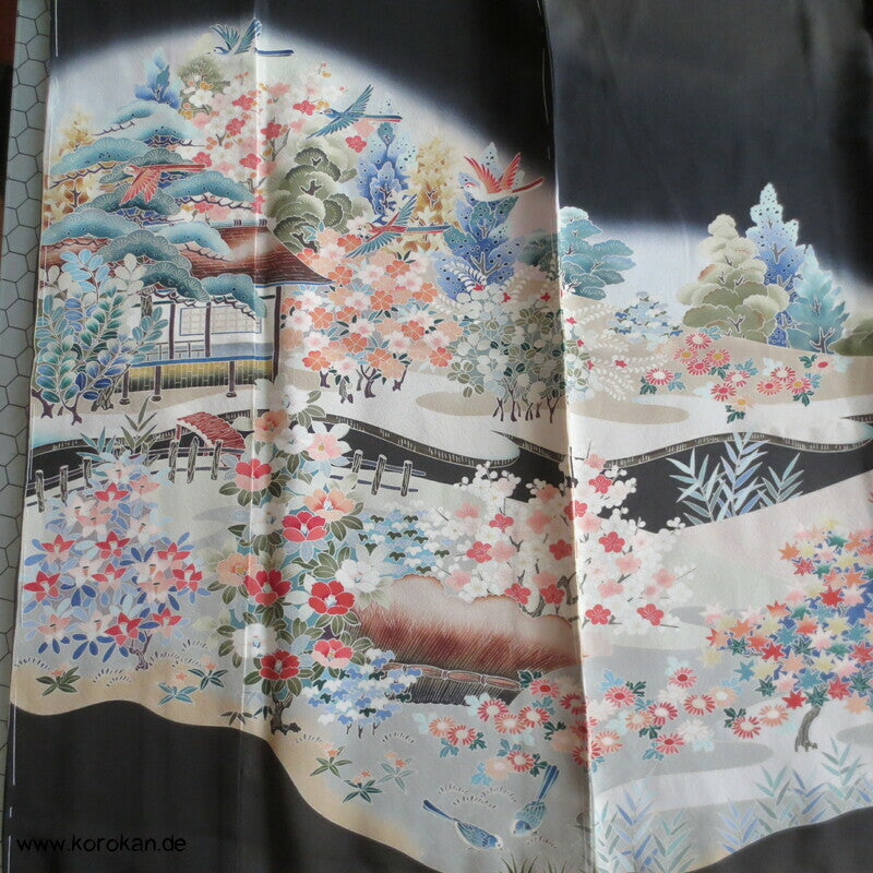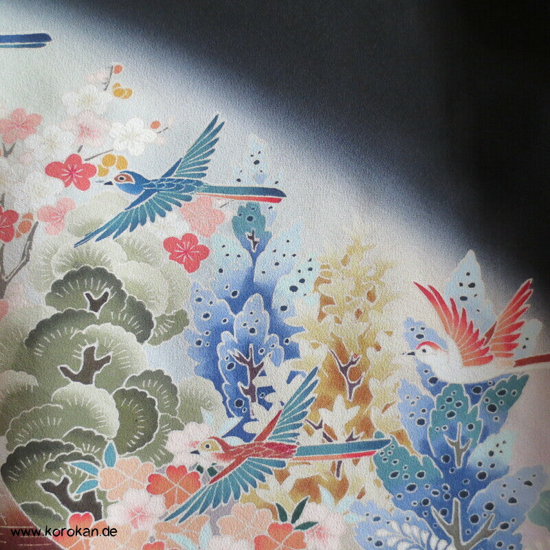 Tomesode, Gartenlandschaft, Vögel Seiden Karieba