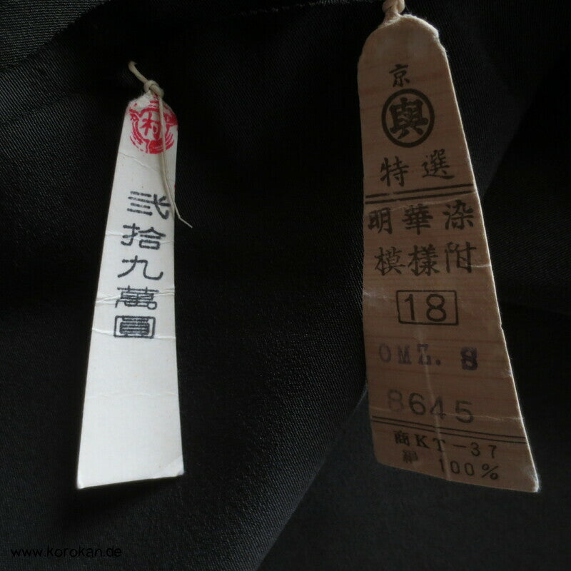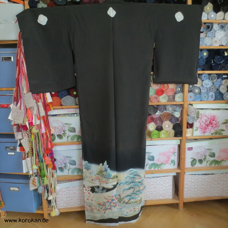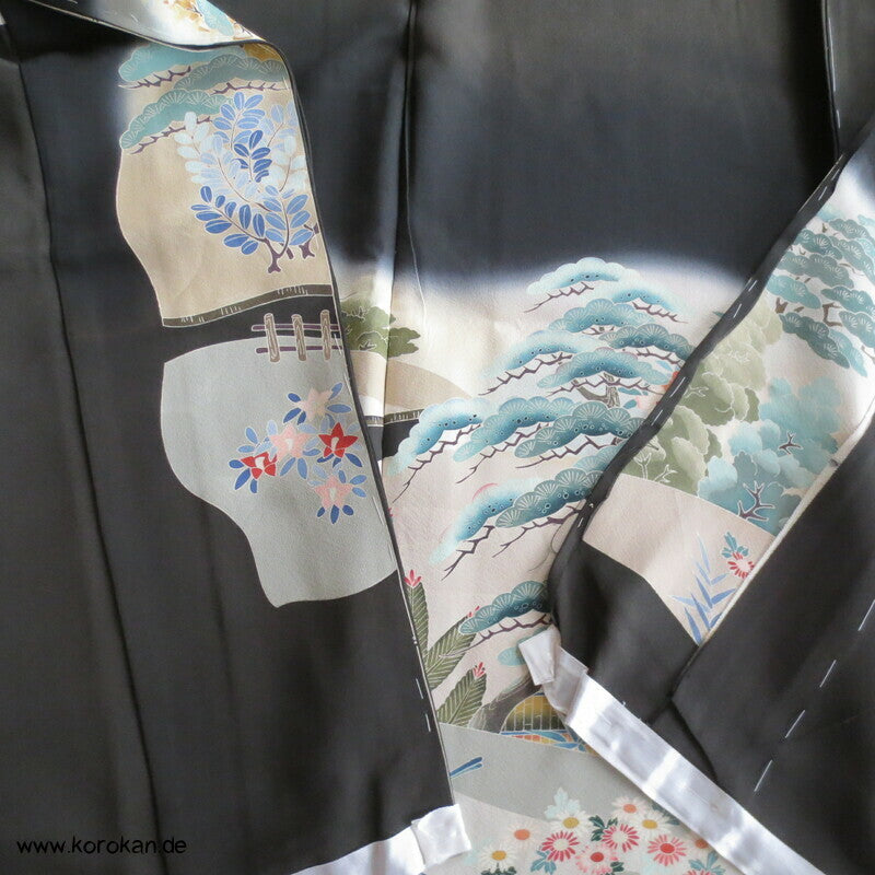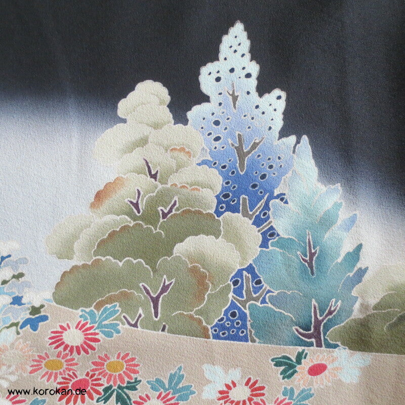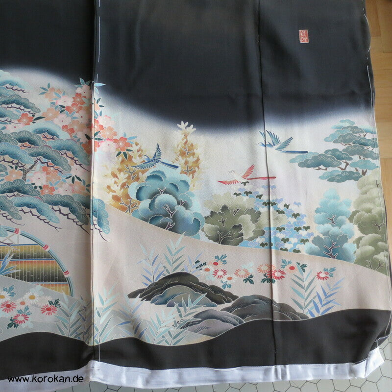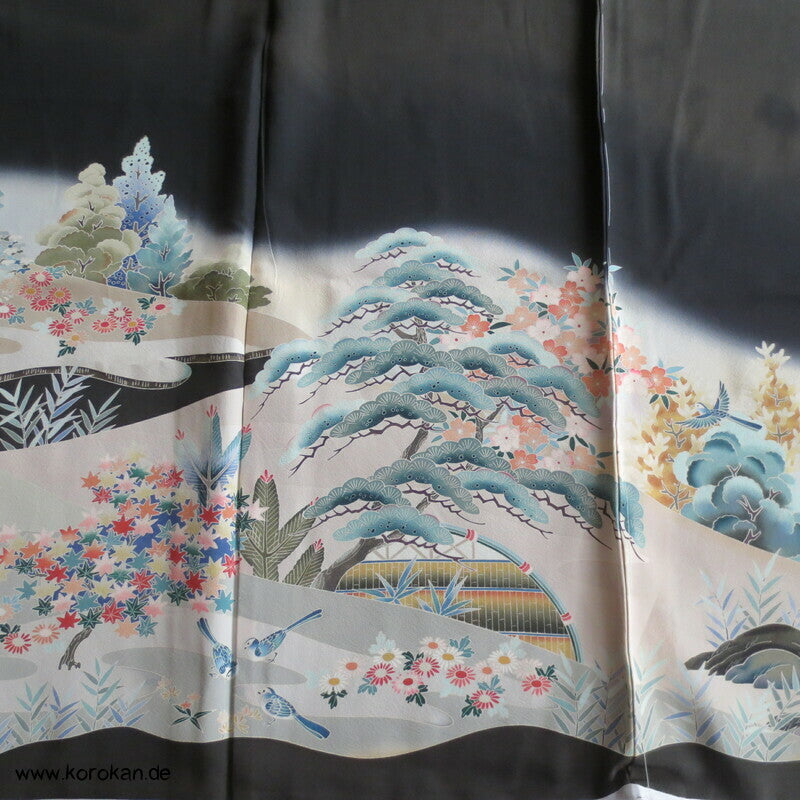 Vintage unbenutzter Karieba Tomesode, geheftet, nicht genäht, Landschaft mit Bäumen und Vögeln, neuer Stoff, etwas verschossen, Seide mit Stempeln