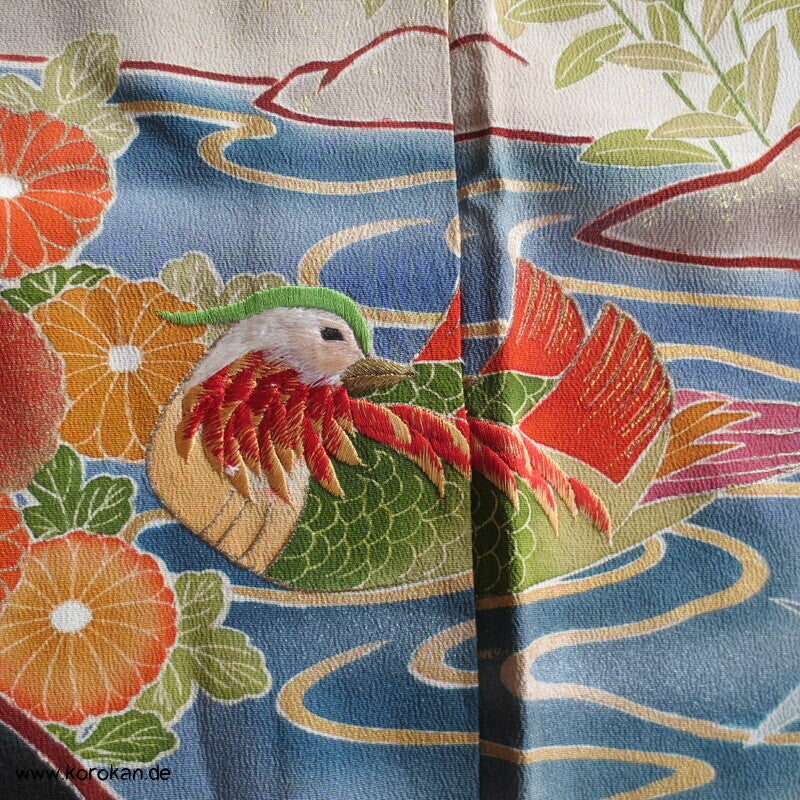 Vintage unbenutzter Karieba Tomesode, geheftet, nicht genäht, Flusslauf mit Blüten und Mandarinenten, teilbestickt, neuer Stoff, Seide mit Stempeln