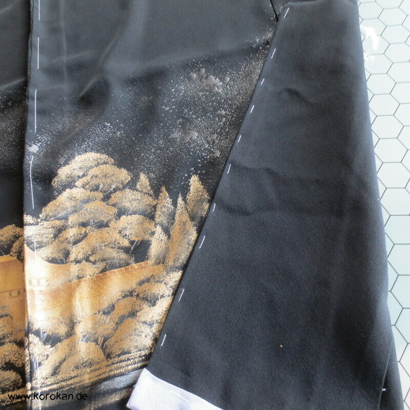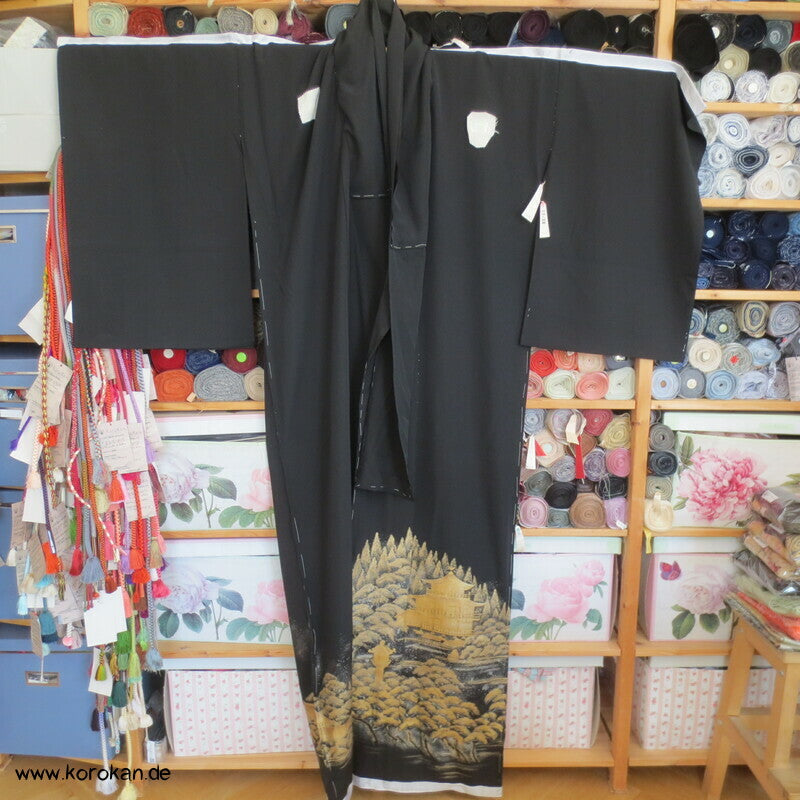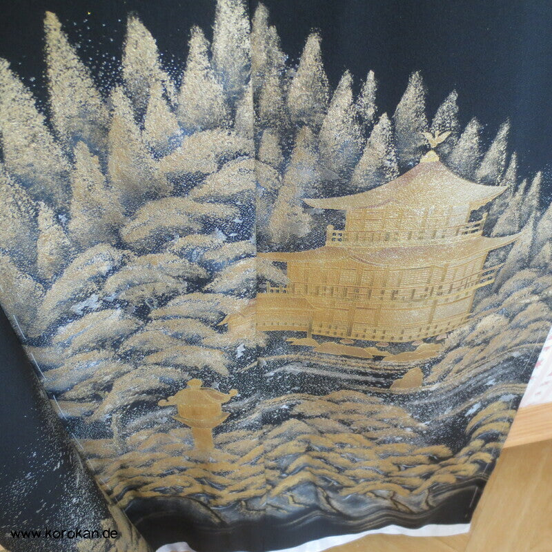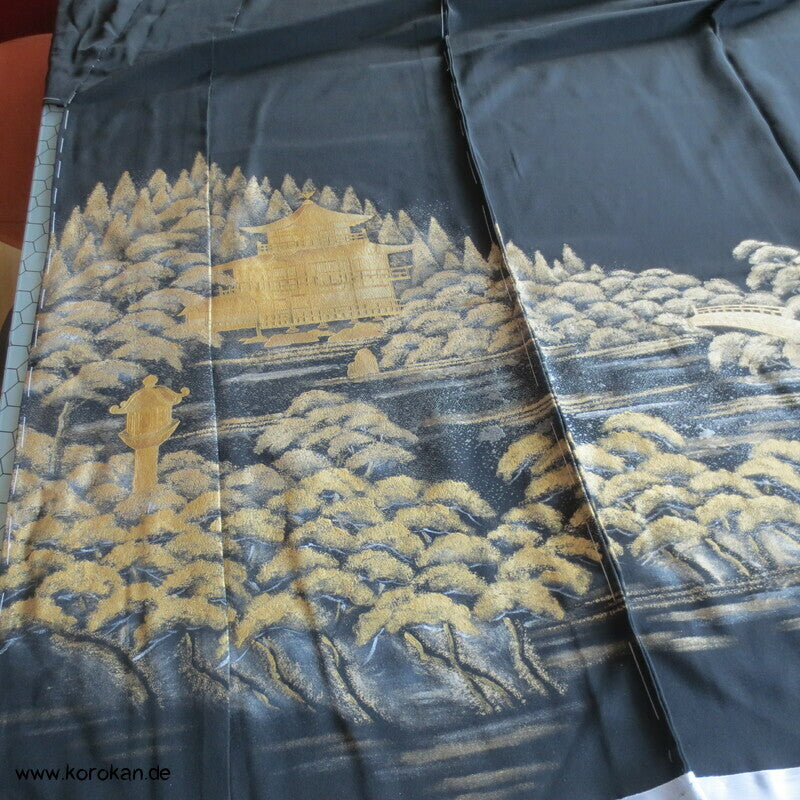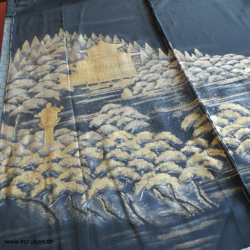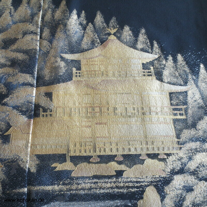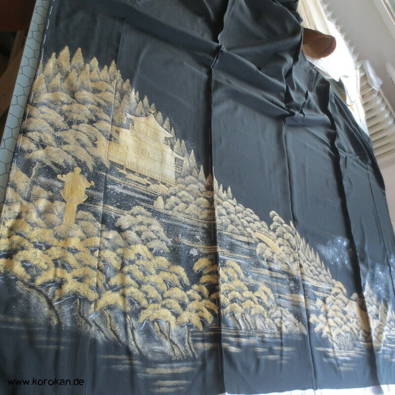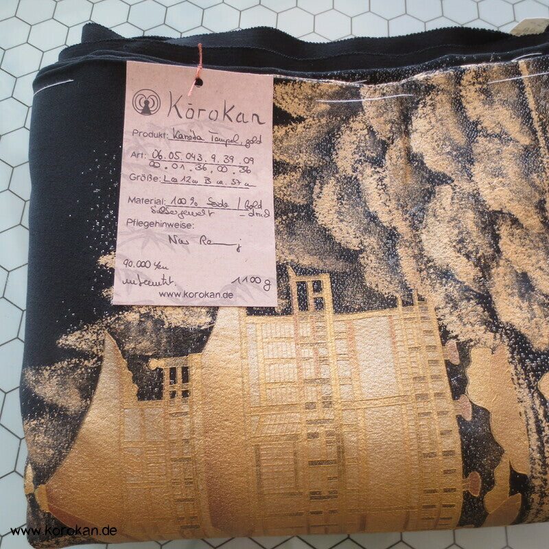 Vintage unbenutzter Karieba Tomesode, geheftet, nicht genäht, goldener Tempel auf goldener Seidencrepebrokat, wie neu