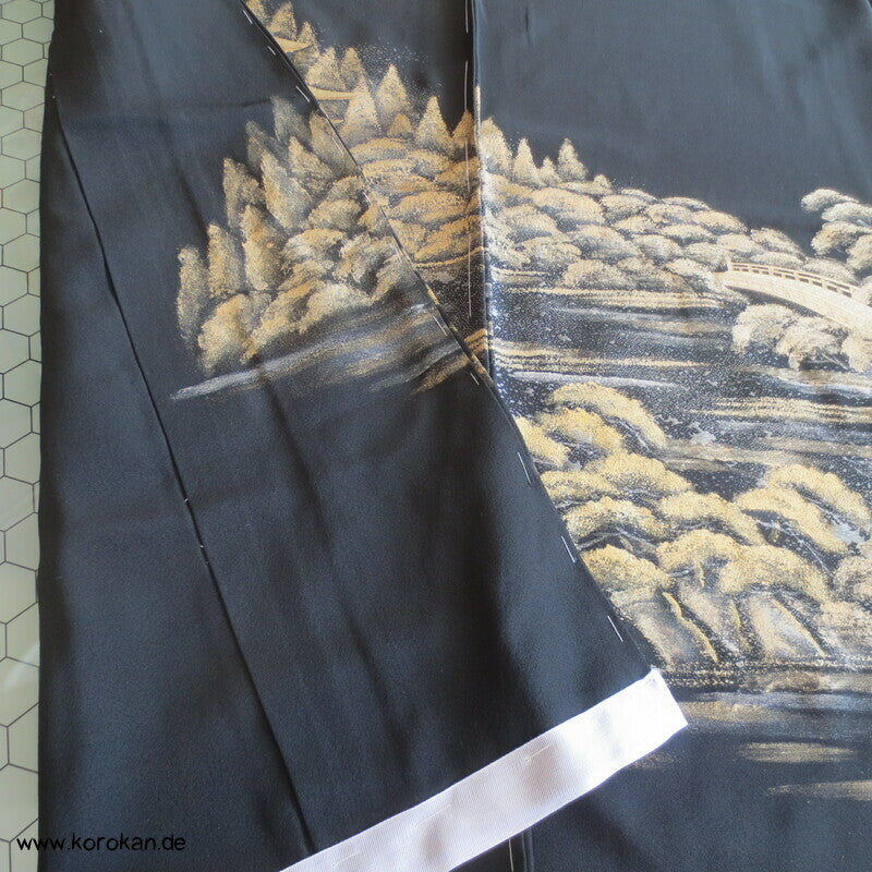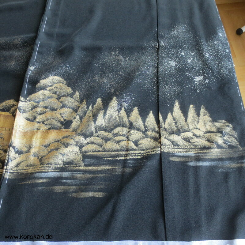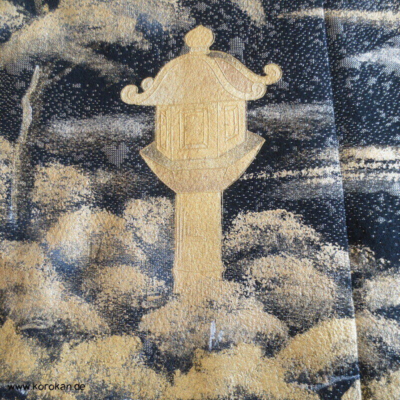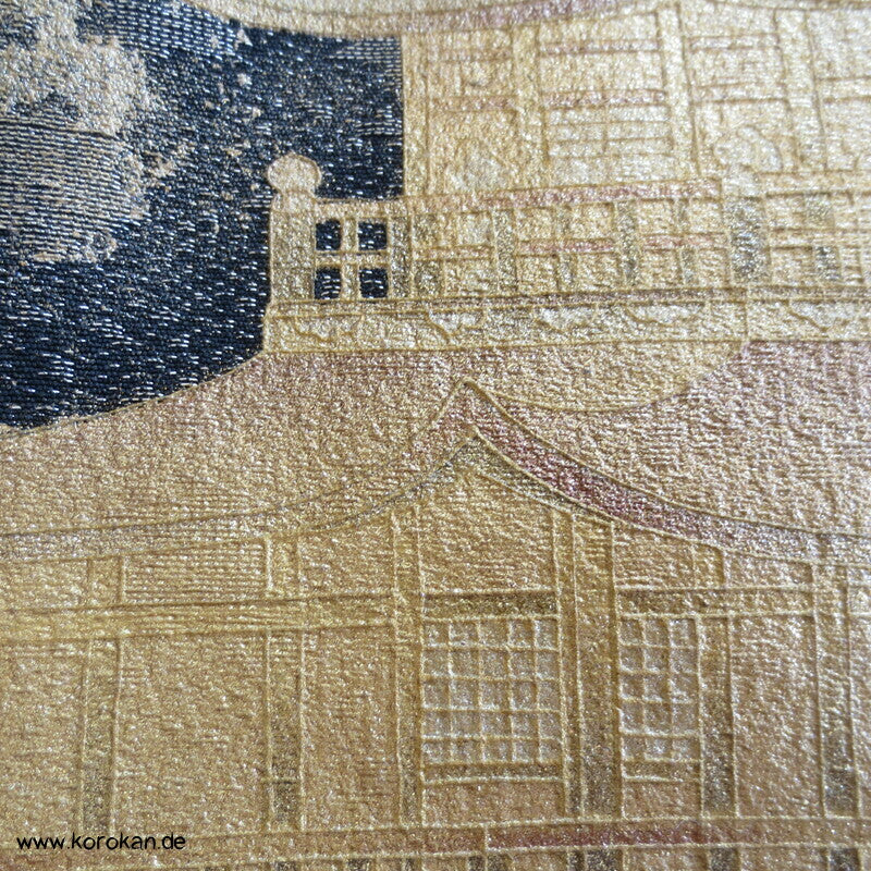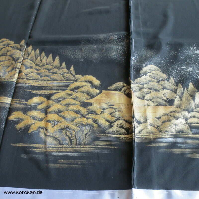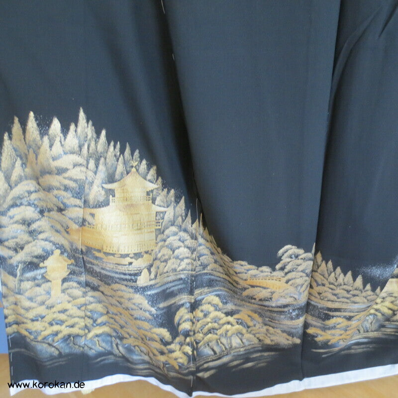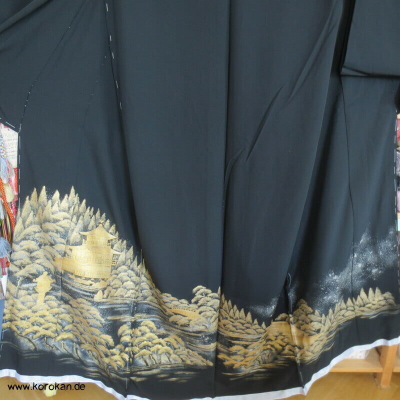 Vintage unbenutzter Karieba Tomesode, geheftet, nicht genäht, goldener Tempel auf goldener Seidencrepebrokat, wie neu