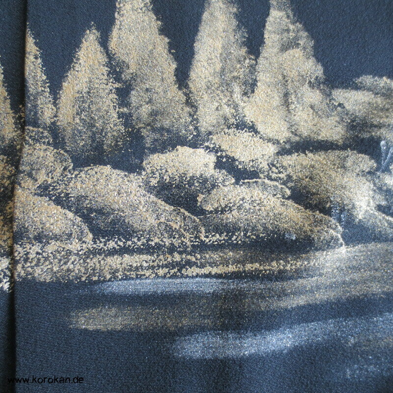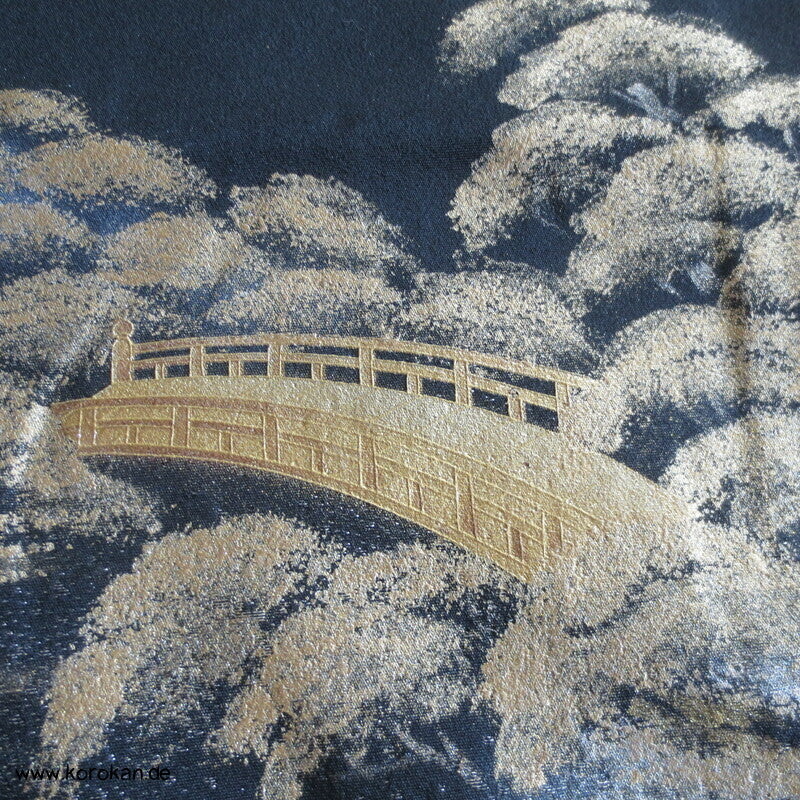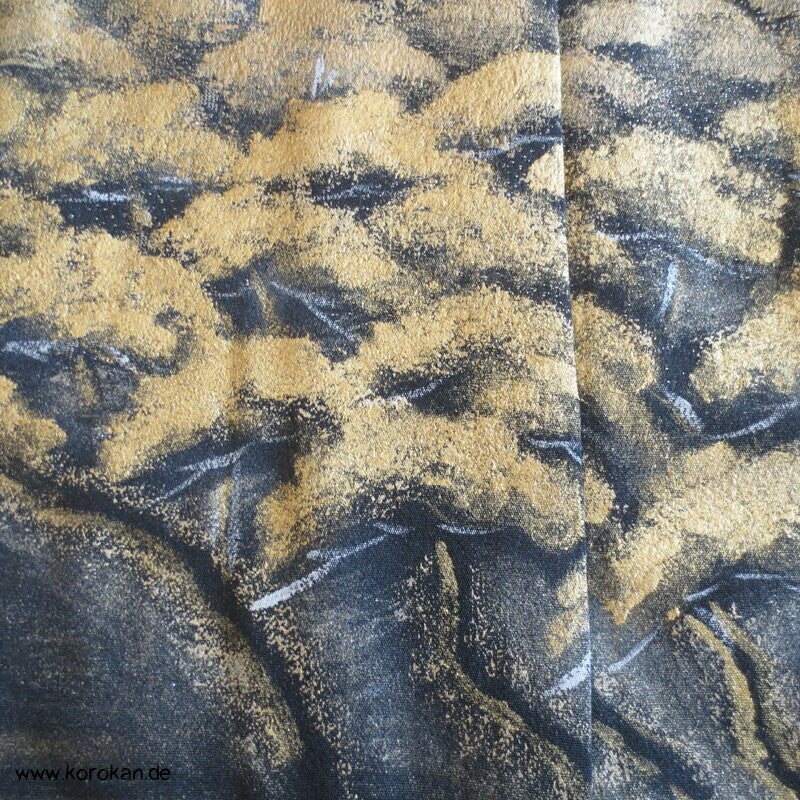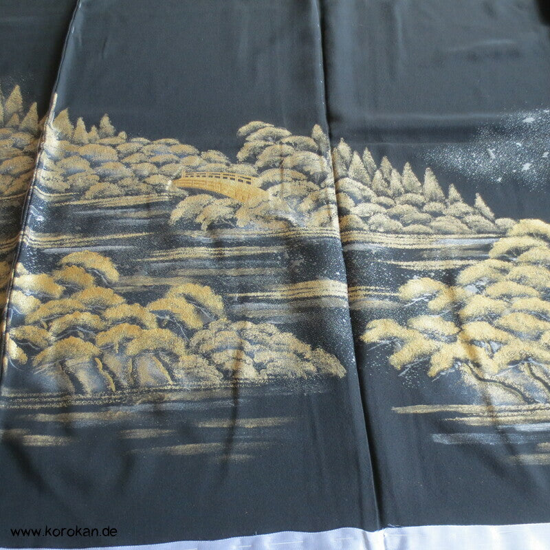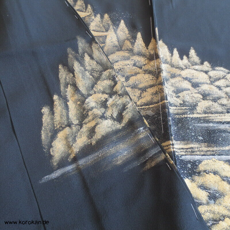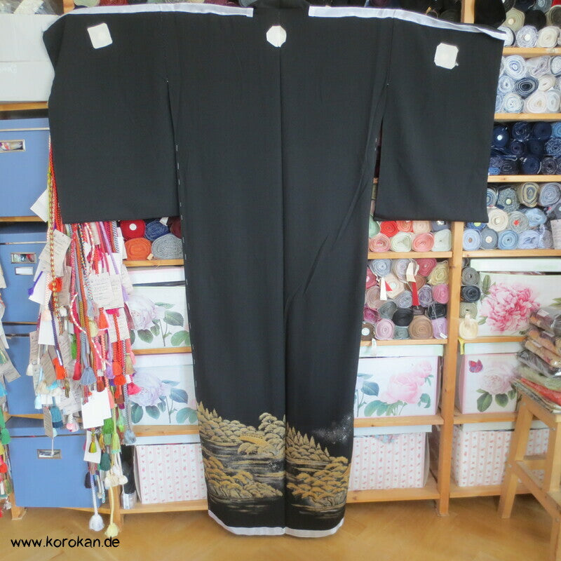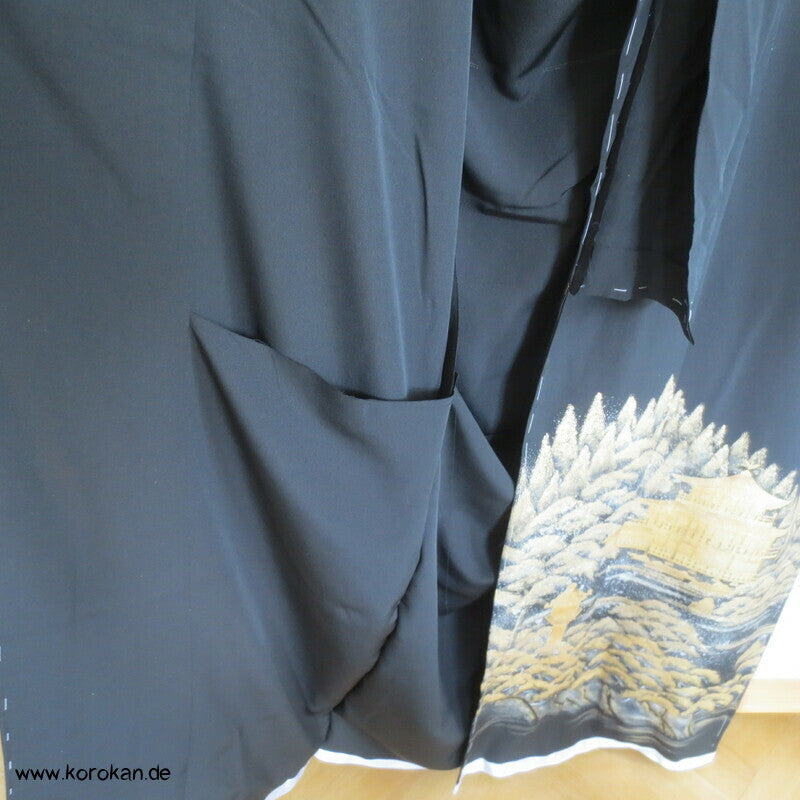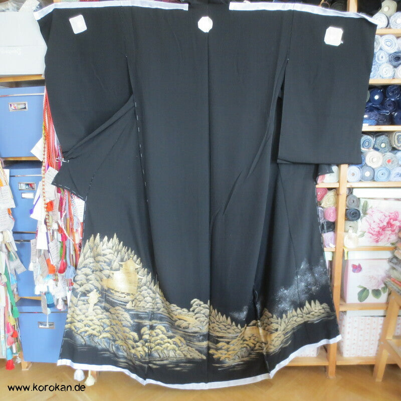 Vintage unbenutzter Karieba Tomesode, geheftet, nicht genäht, goldener Tempel auf goldener Seidencrepebrokat, wie neu