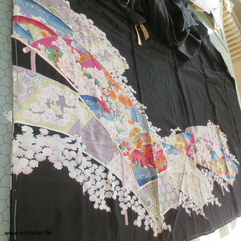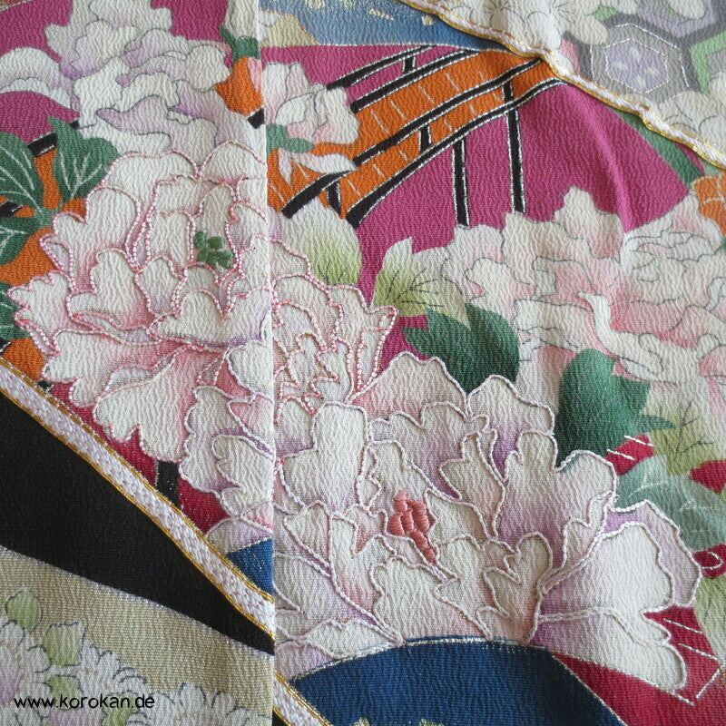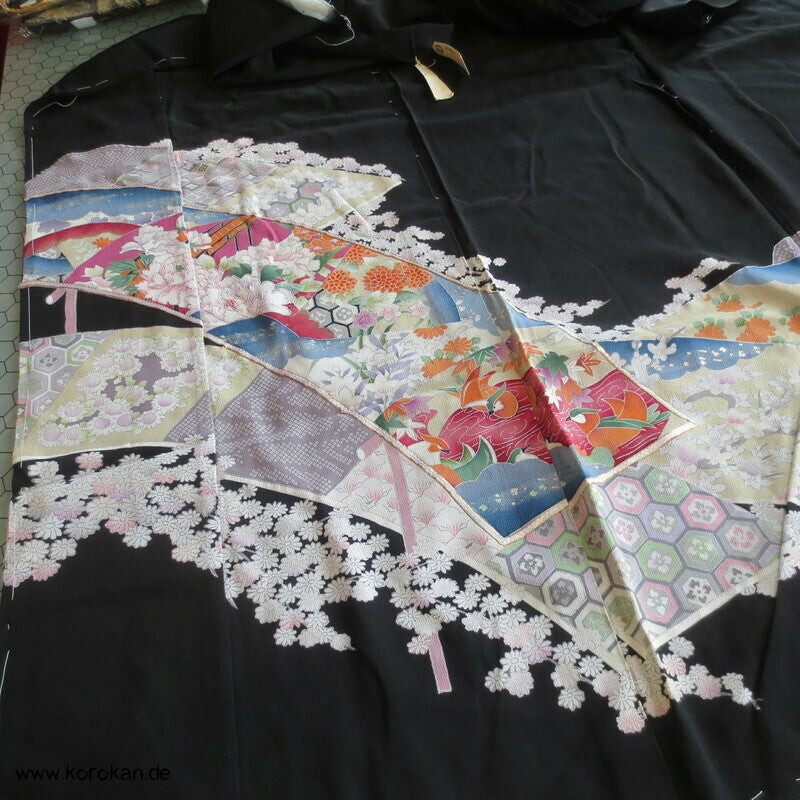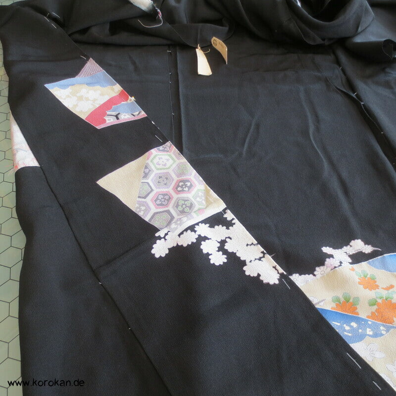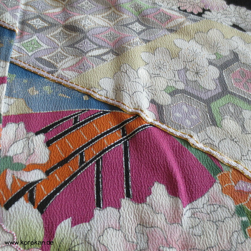 Vintage unbenutzter Karieba Tomesode, geheftet, nicht genäht, bestickte Traumbrücke mit ganz vielen kleinen Mustern, neuer Stoff, Seide mit Stempeln
