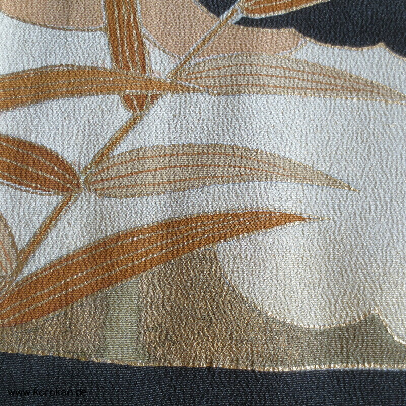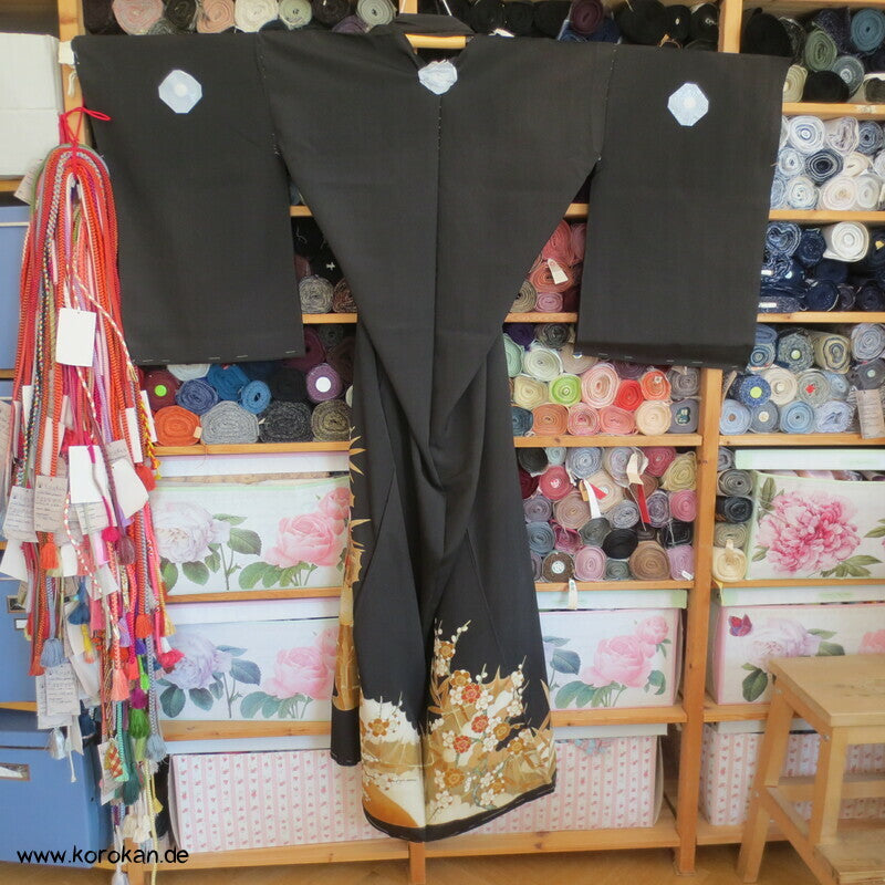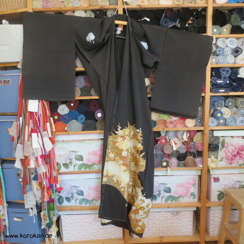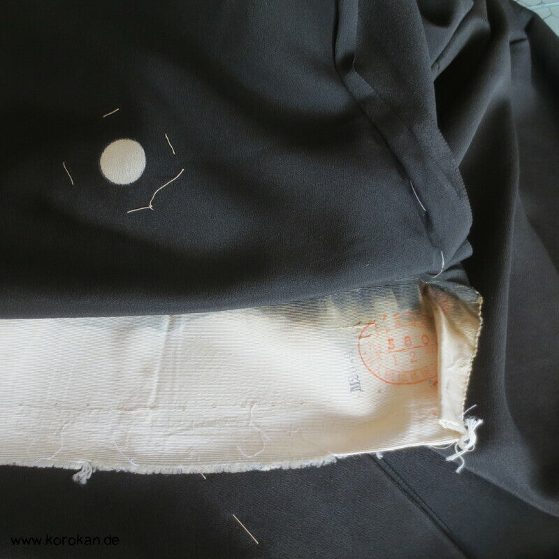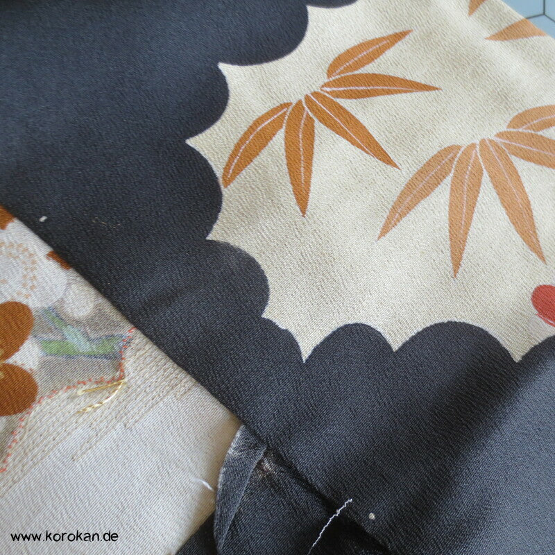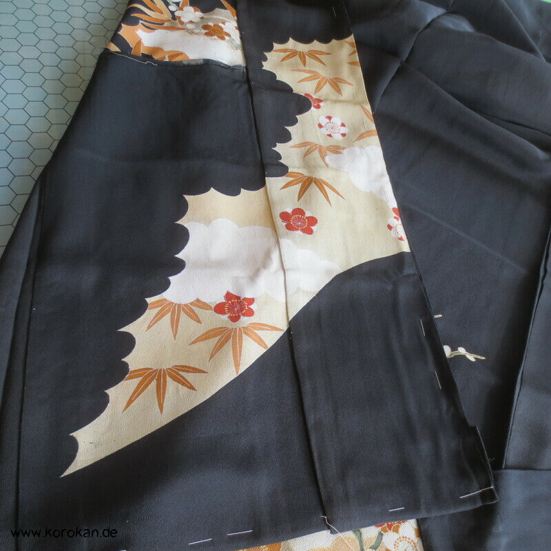 Vintage unbenutzter Karieba Tomesode als Stoffrolle mit den zusammengenähten Stoffstücken die für einen Kimono vorbereitet wurden. Kleine Schadstelle an der Stoffseite, die aber verarbeitet keine Rolle spielt.
