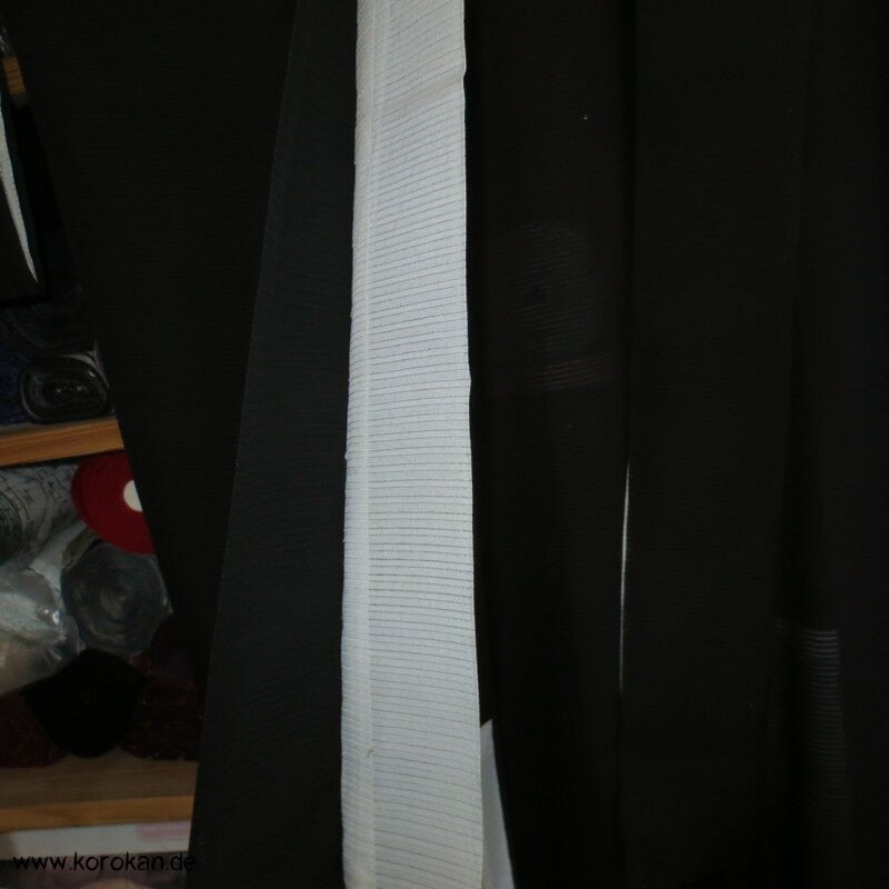 Vintage Tomesode formeller Kimono aus schwarzer Rho Seide Drehergewebe mit tosenden Uferwellen, hellen Belegen auch aus Rho gewebter Seide