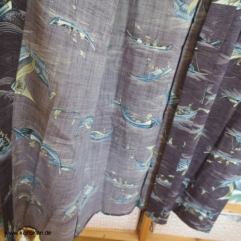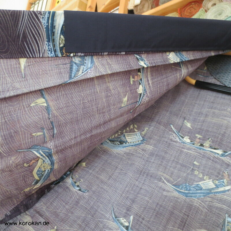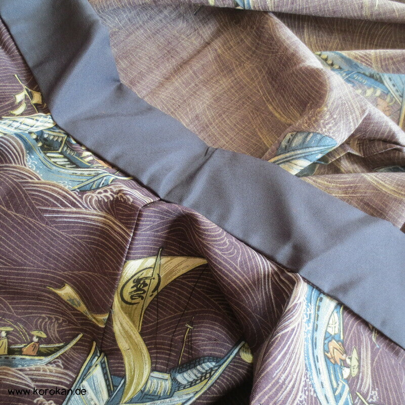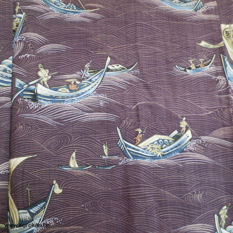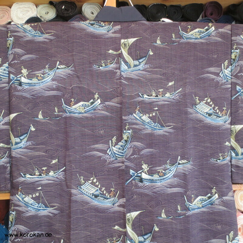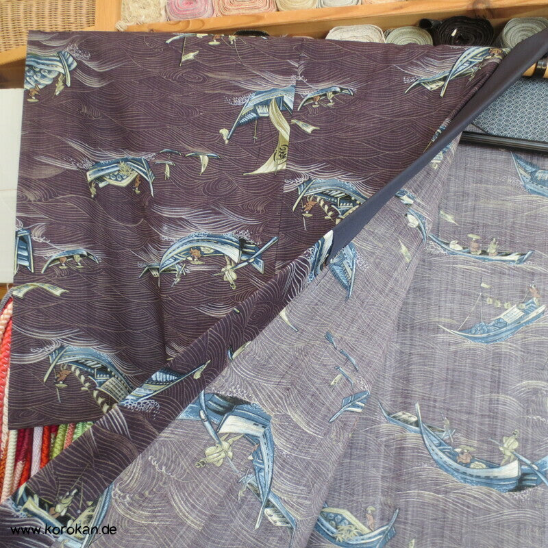 Vintage Männer Juban Unterkimono aus feinem weichen Woll Musselin bedruckt mit Fischerbooten im Meer.