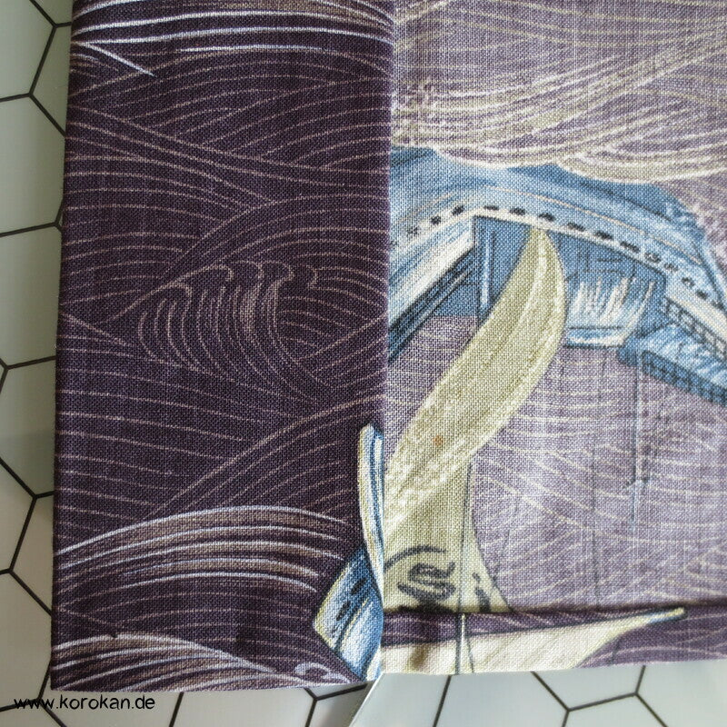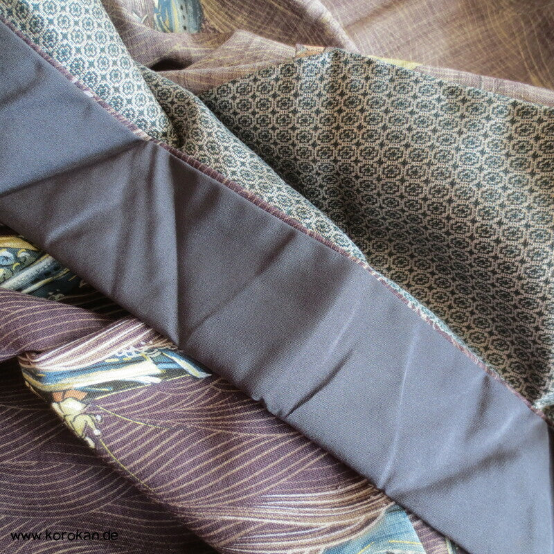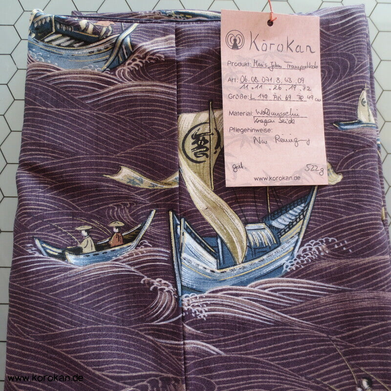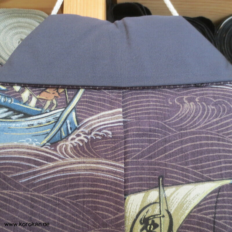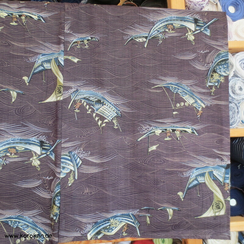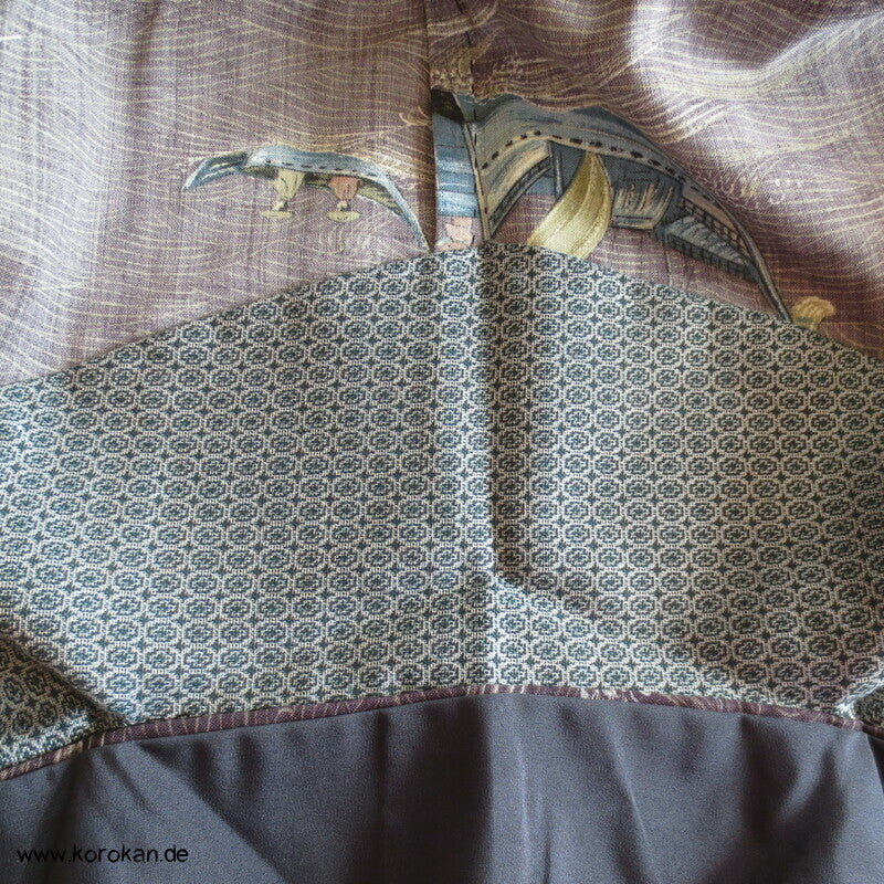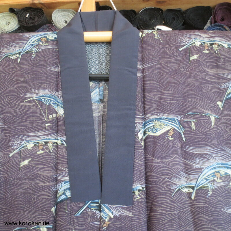 Vintage Männer Juban Unterkimono aus feinem weichen Woll Musselin bedruckt mit Fischerbooten im Meer.