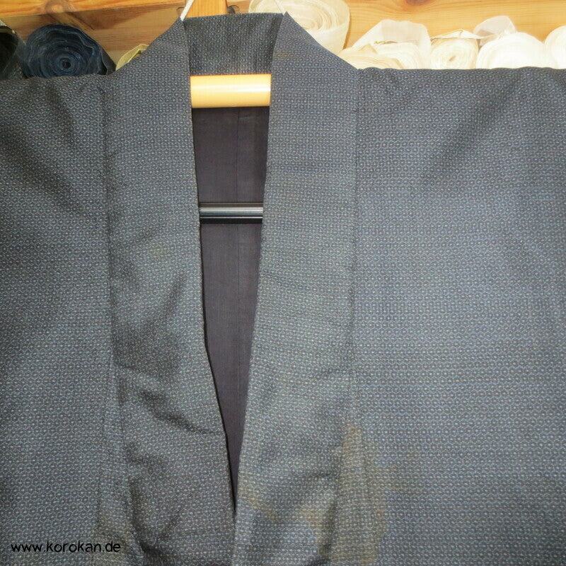 Vintage Männer Tsumugi Seiden blau schwarzer Kikko Kasuri Kimono, mit blauem Baumwoll Chintz Futter. Der Klassiker.