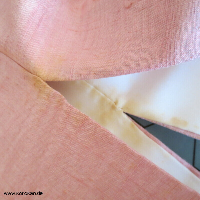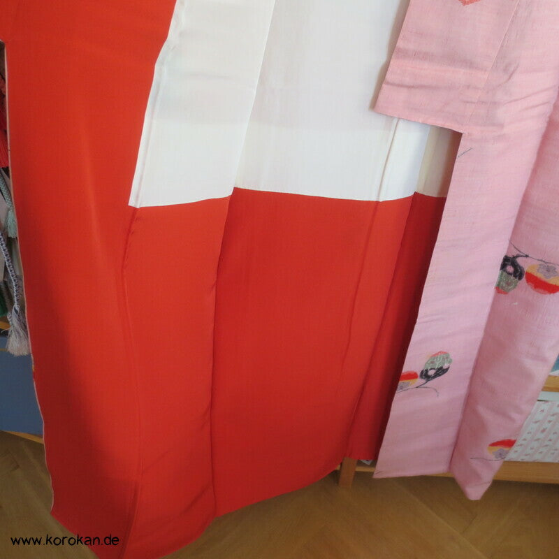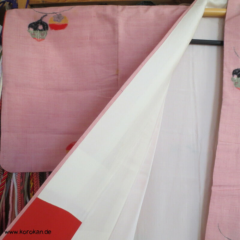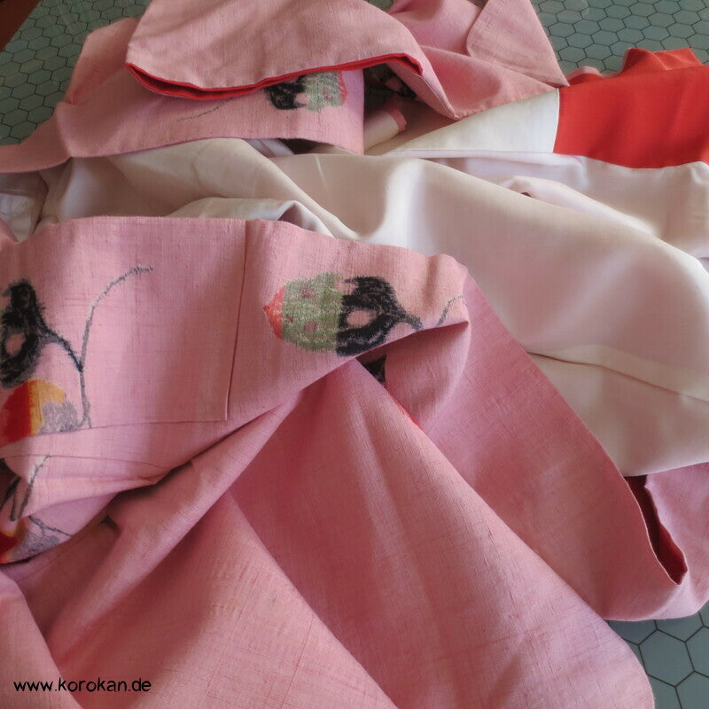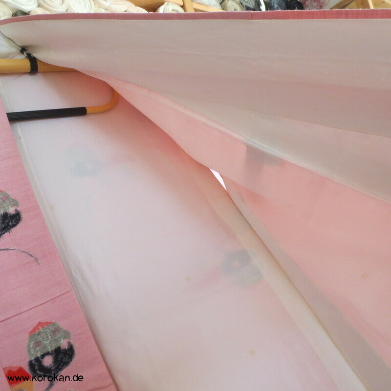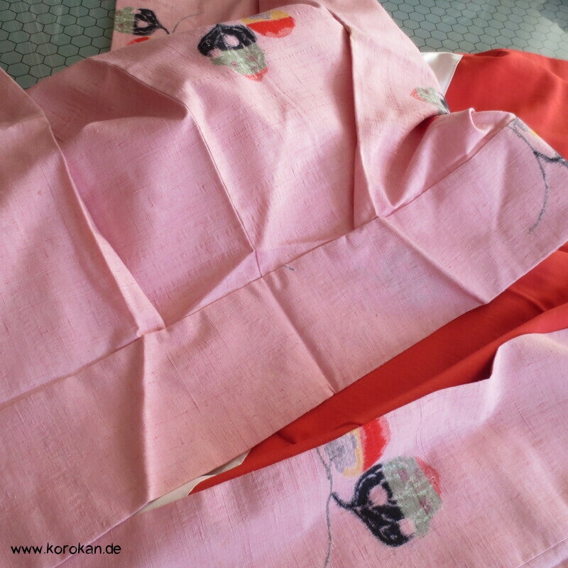 Vintage Tsumugi Seide Komon Kasuri Tachibana Blüten und Blätter in rosa, oberes Futter hell, unteres Hakkake Futter in roter Seide