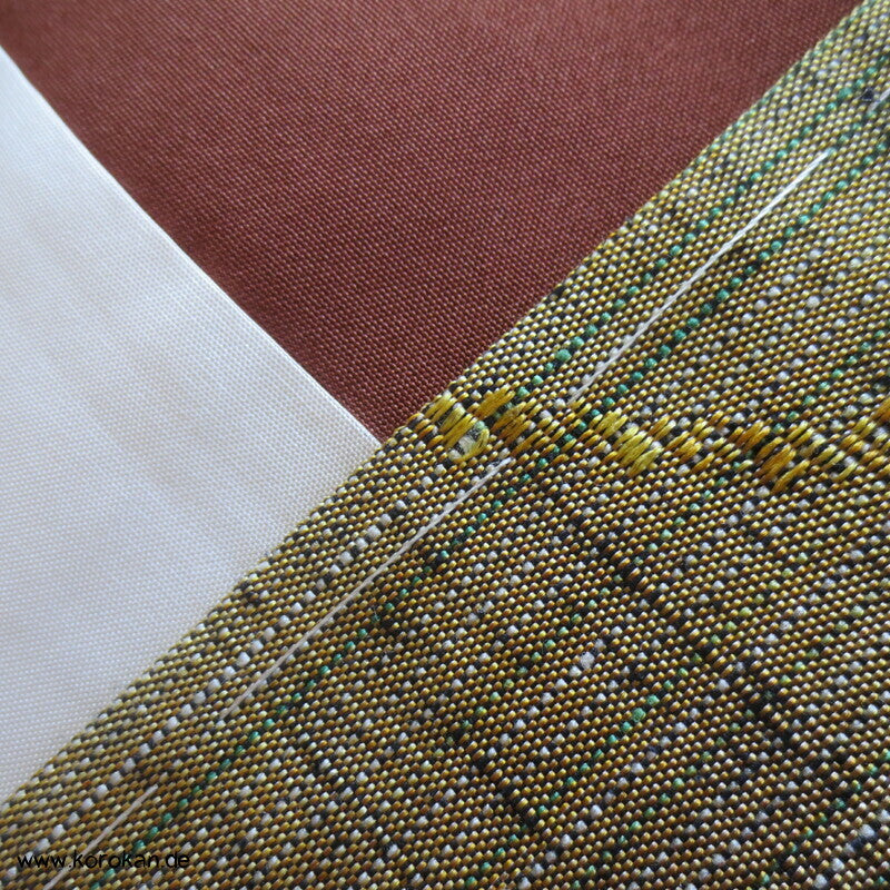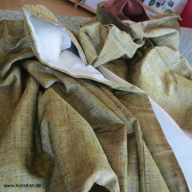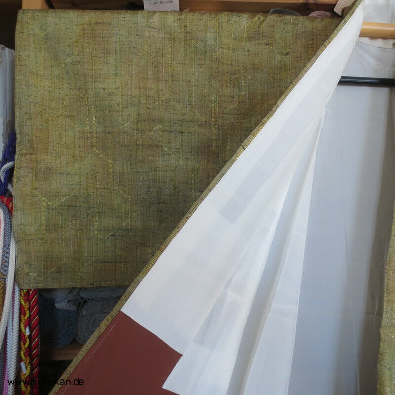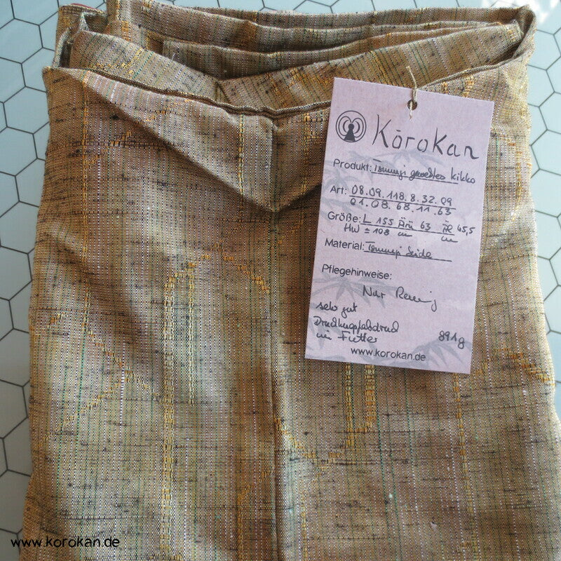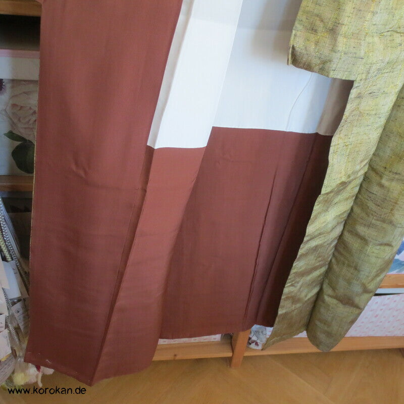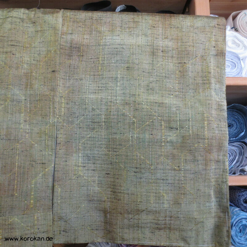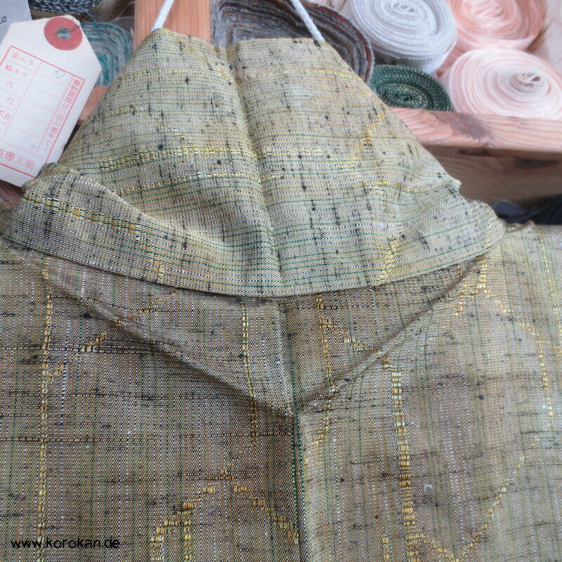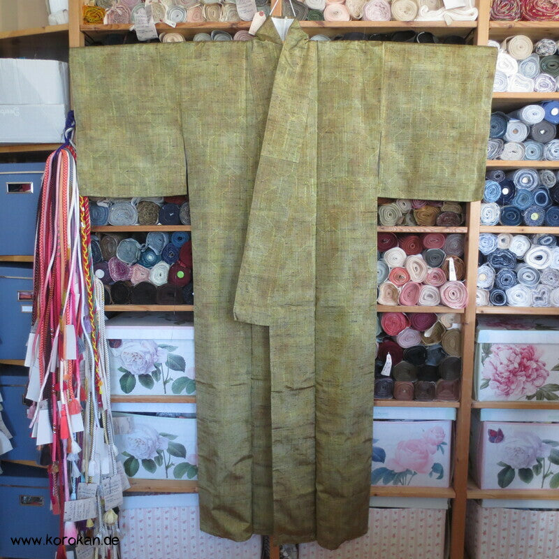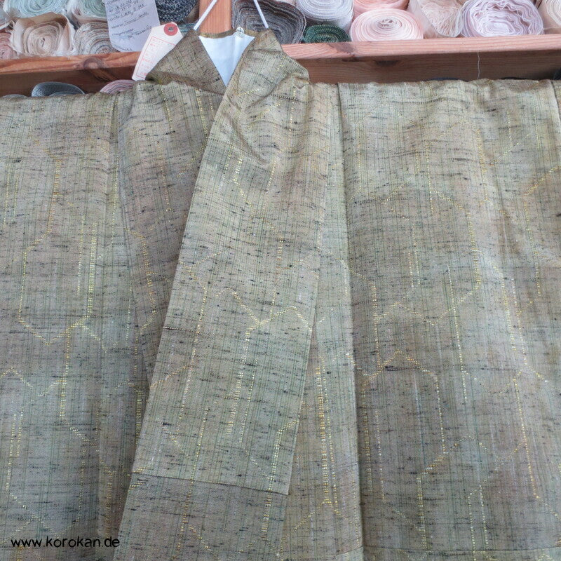 Vintage Tsumugi Seiden Komon Kimono khaki gewebte Kikko Schildkrötenpanzer Sechsecke, oberes Futter helle Seide, unteres Hakkake Futter in brauner Seide.