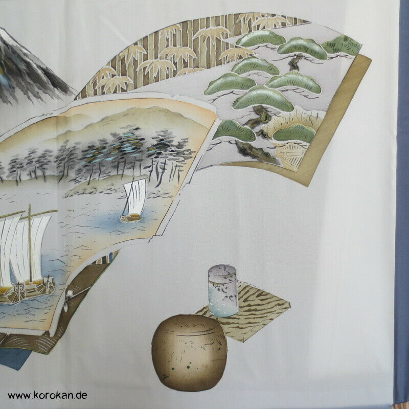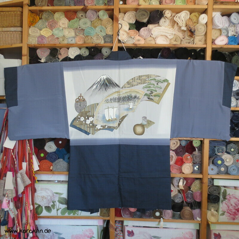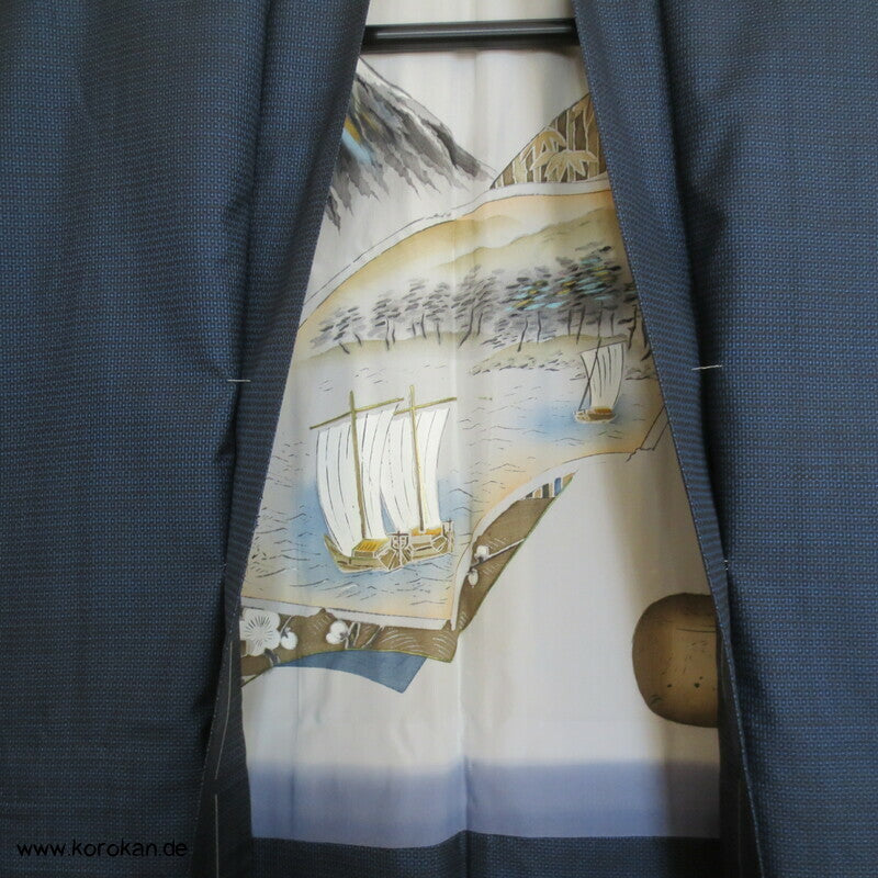 Vintage japanische Männer Haori aus blau - dunkelblauer feiner Kasuri garngefärbter Kikko Tsumugi Seide mit Bildfutter, Fächer mit Motiven, Schiff, Fuji san