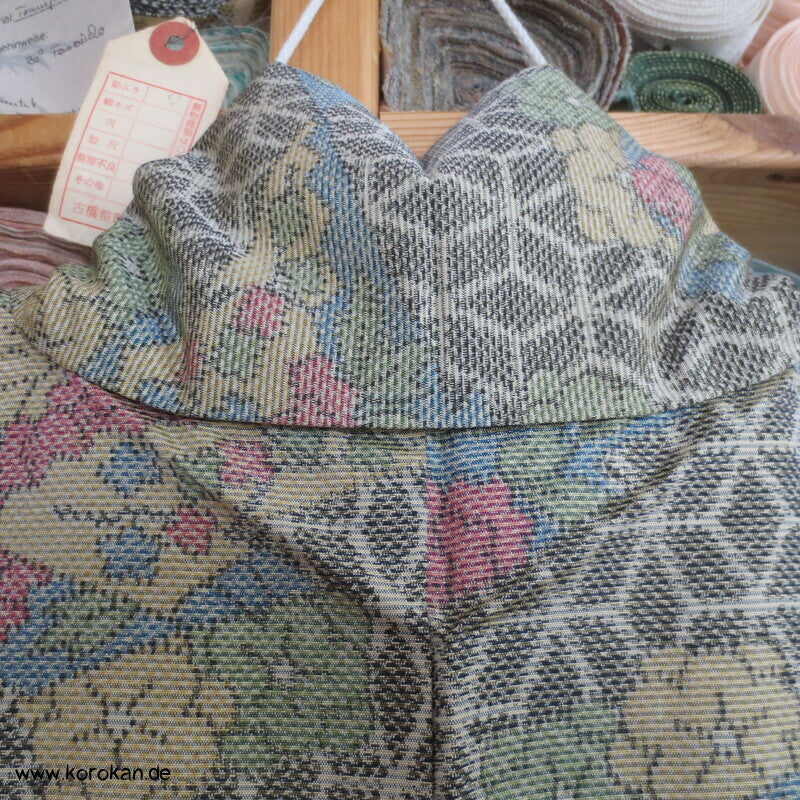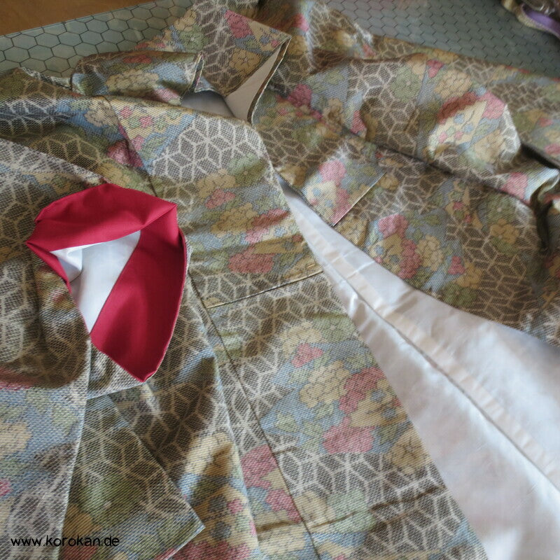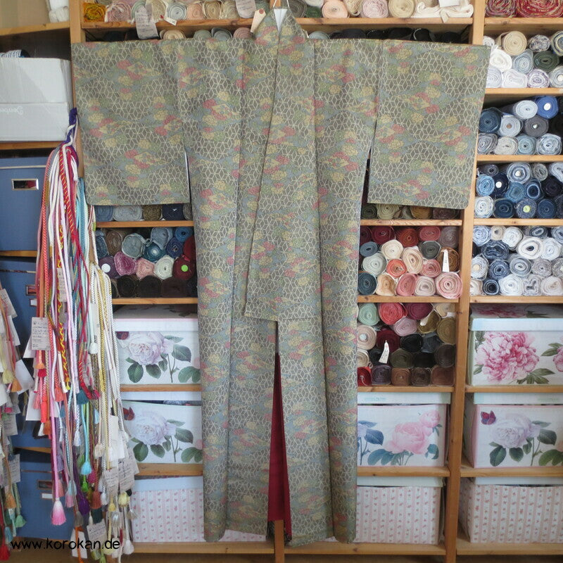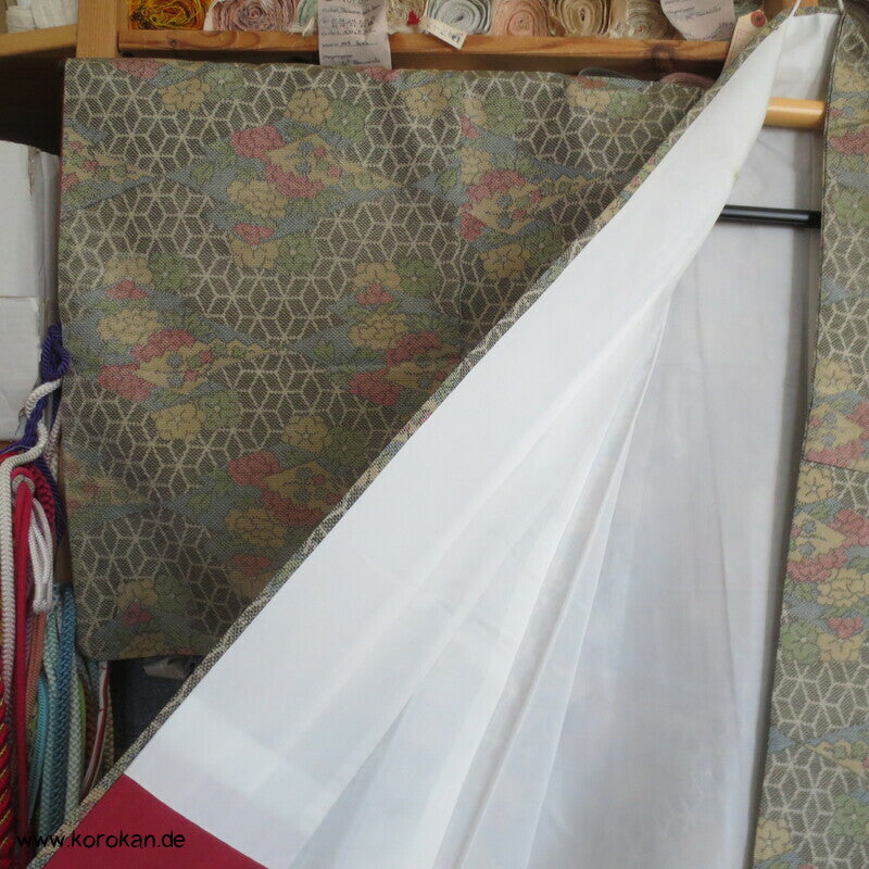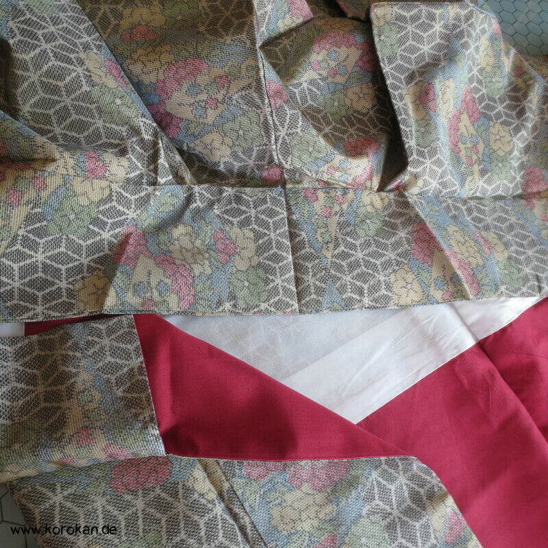 Vintage Tsumugi Seiden Komon Kimono mit Kasuri garngefärbtem Asanoha Muster mit Blüten Matsukawahishi allover, oberes Futter helle Synthetik, unteres Hakkake Futter in dunkelroter Honan Seide.