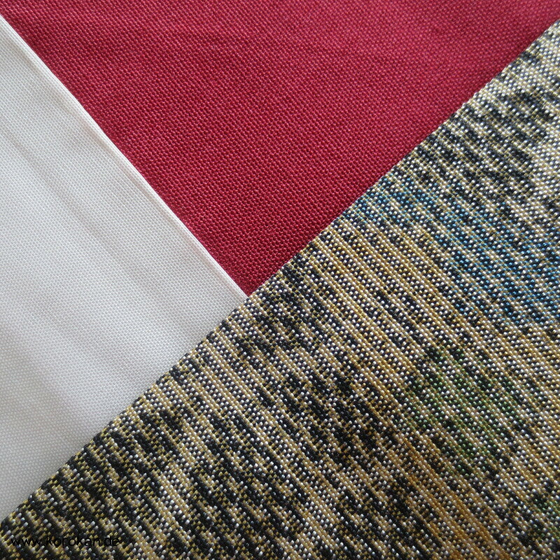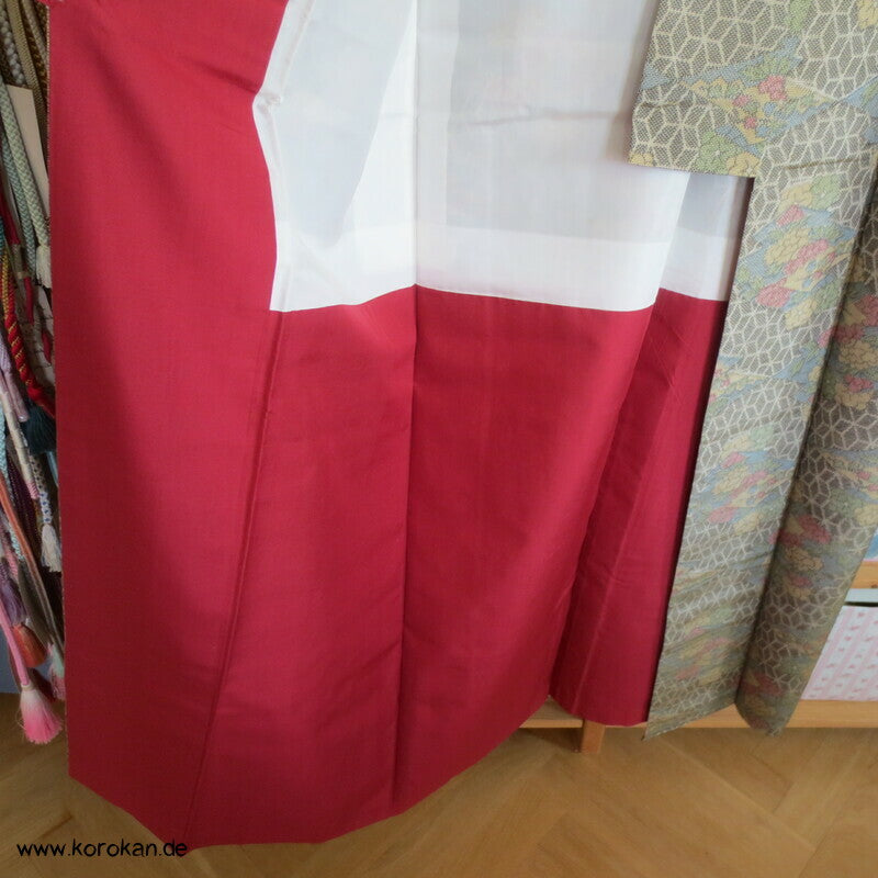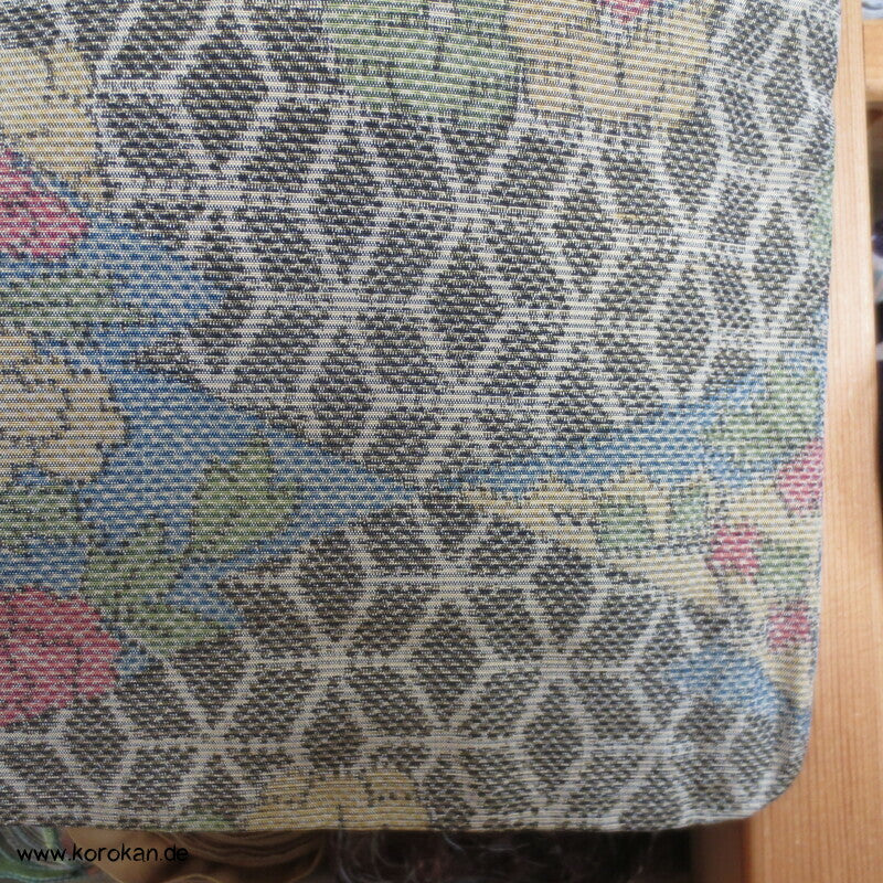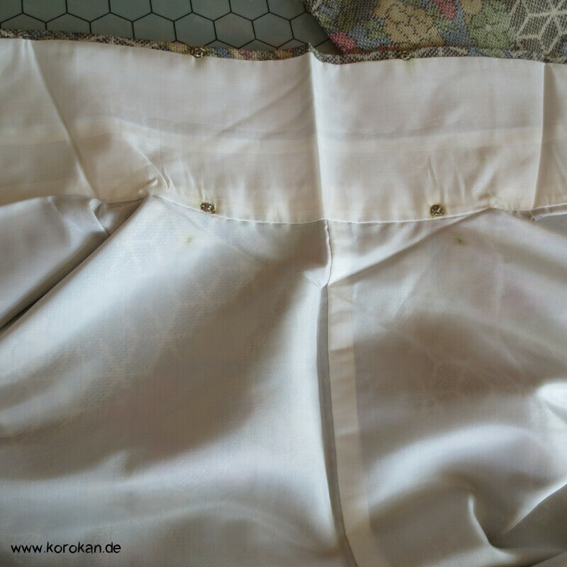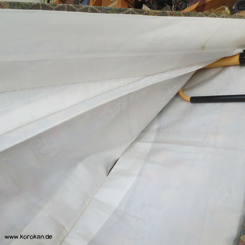 Vintage Tsumugi Seiden Komon Kimono mit Kasuri garngefärbtem Asanoha Muster mit Blüten Matsukawahishi allover, oberes Futter helle Synthetik, unteres Hakkake Futter in dunkelroter Honan Seide.