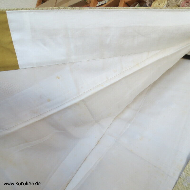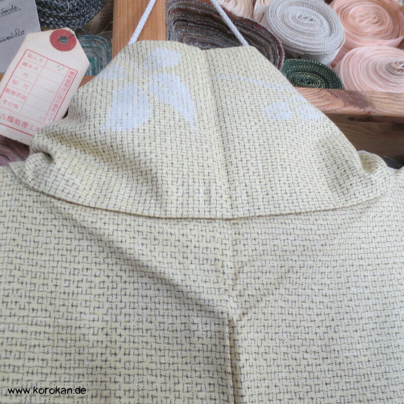 Vintage Tsumugi Seiden Komon Kimono mit Kasuri garngefärbtem Blumen und kleine Kreuze Muster allover, oberes Futter helle Seide, unteres Hakkake Futter in currygelber Honan Seide.