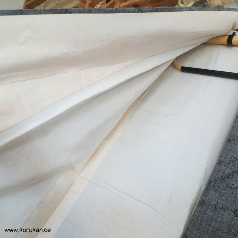 Vintage Tsumugi Seiden Komon Kimono Kasuri zarte schwarze Zweige mit angedeuteten Blüten in grau, oberes Futter hell, unteres Hakkake Futter in mauve Seide