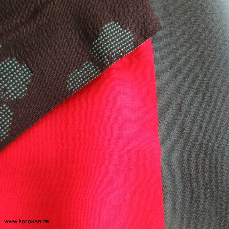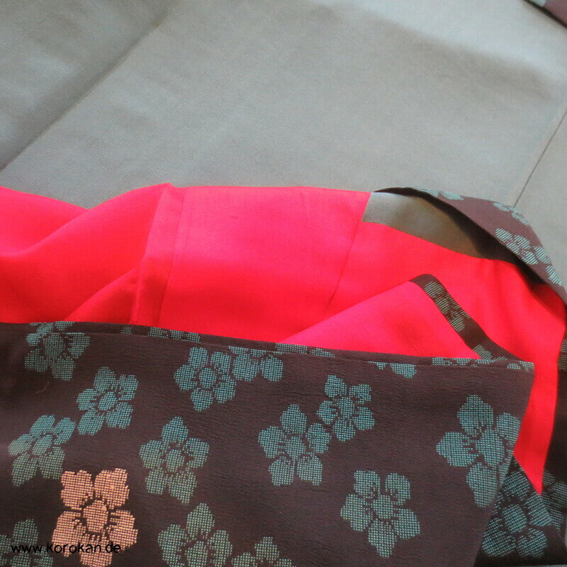 Vintage, eher antiker Komon Kimono glänzende Blüten auf schwarz Seidenbrokat / Jacquard, sehr 1950'er, eventuell früher, oberen roten Seiden Futter und unterem Hakkake Futter in petroltürkis Seide.