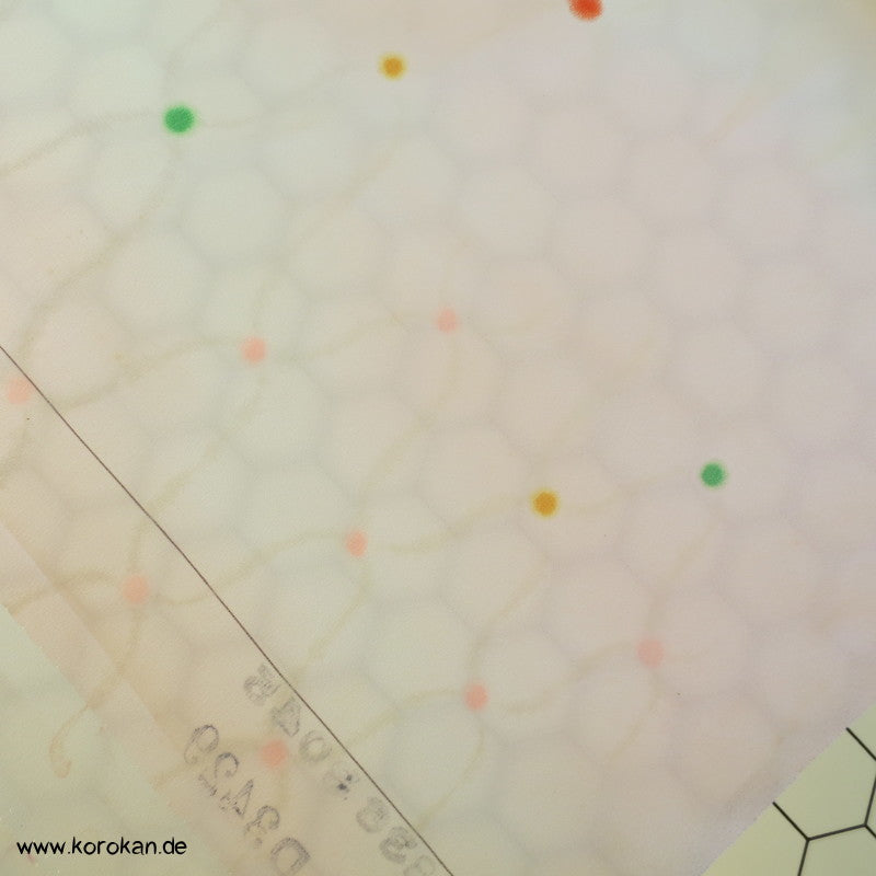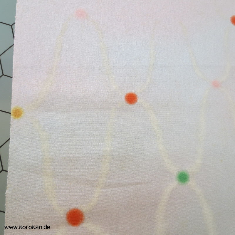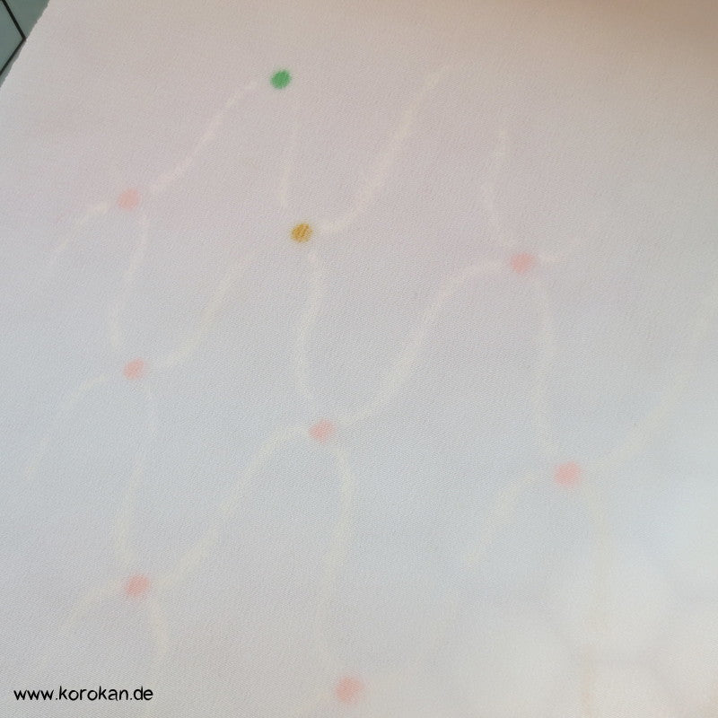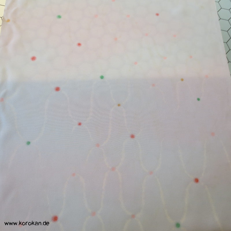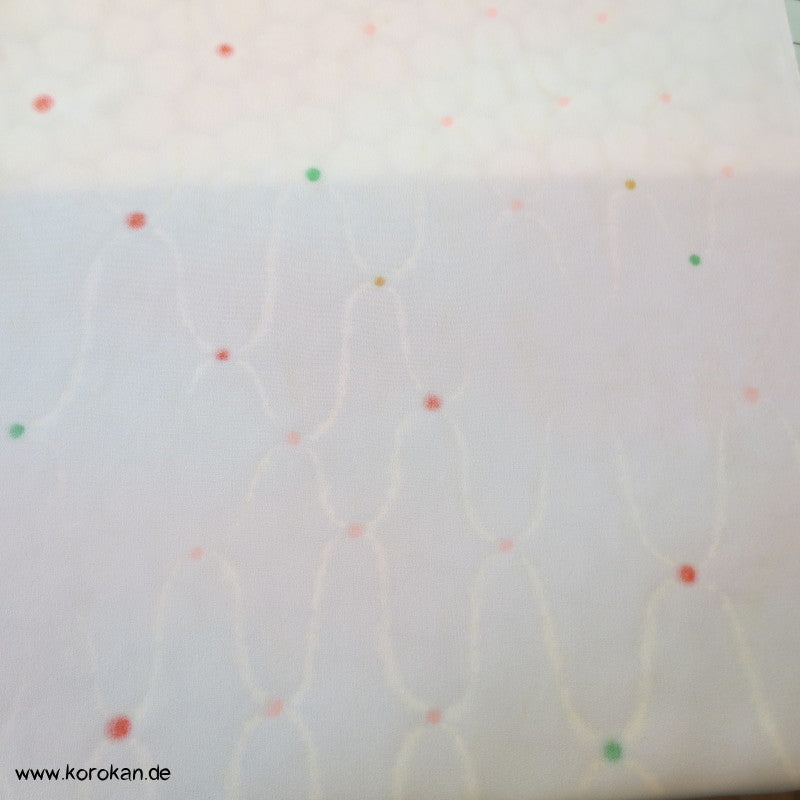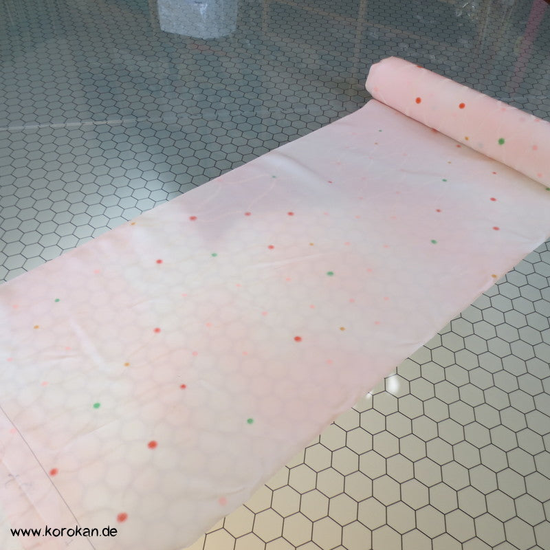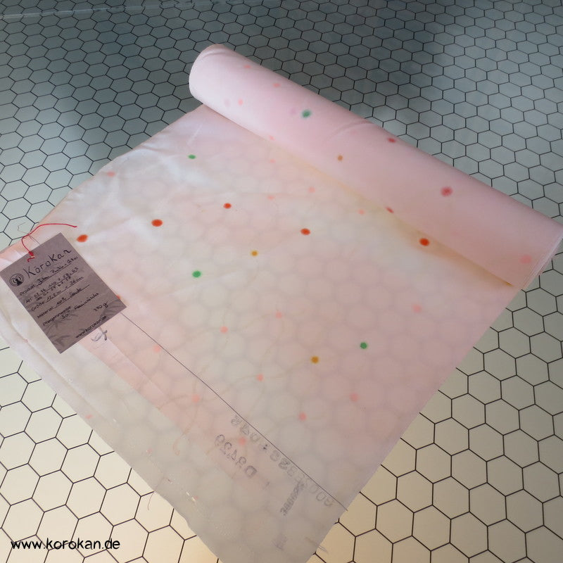 japanische Vintage unbenutzte Tanmono Stoffrolle Seidencrepe blassrosa mit weißem Übernetz und bunten Punkten an den Kreuzungen