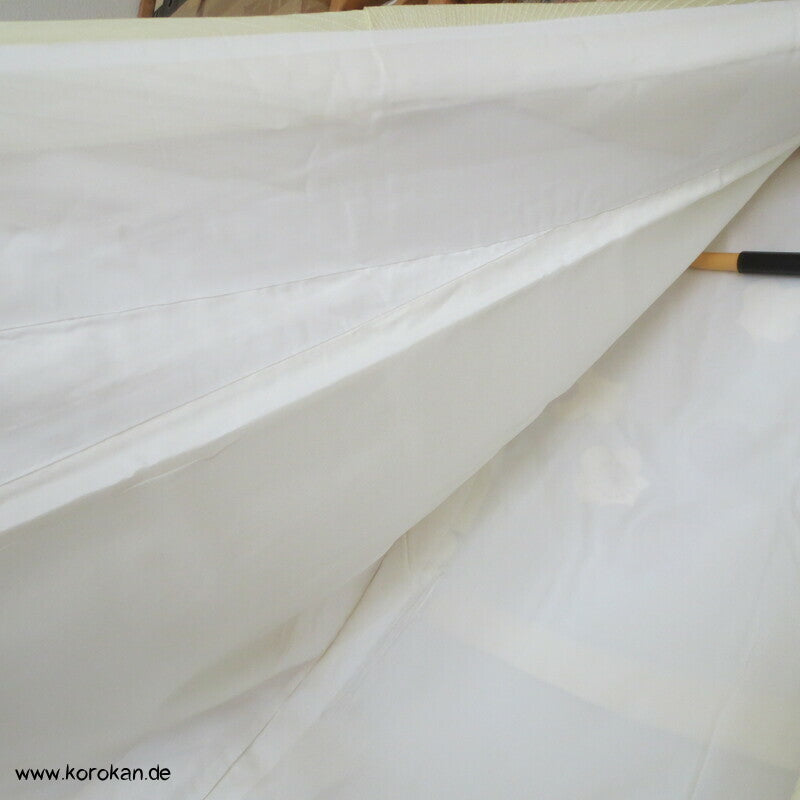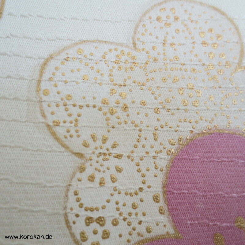 Vintage Homongi Kimono gold umstickte riesige Sakura Blüten auf hellem Seidendamast, feinem oberen hellen Seidenfutter und unterem Hakkake Seidendamast mit Bokashi Verlaufsrand.