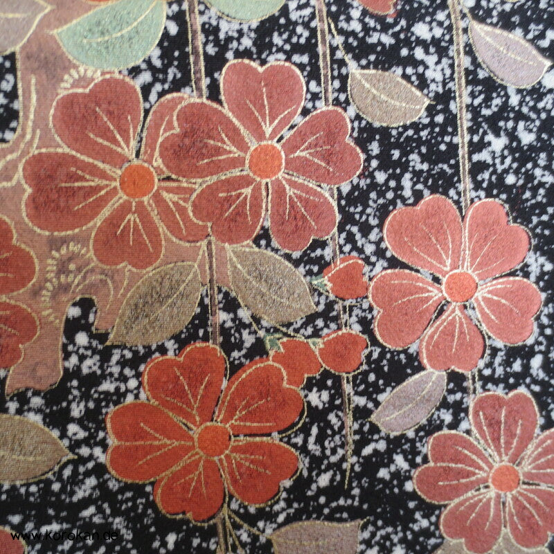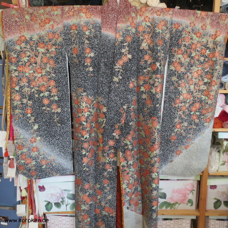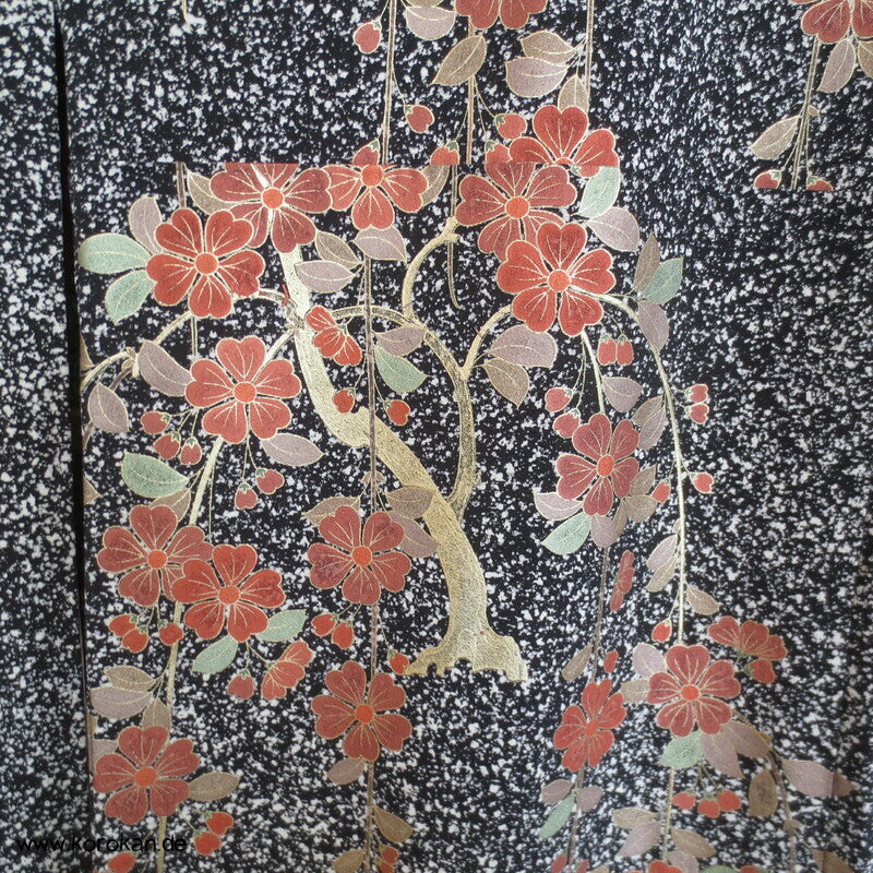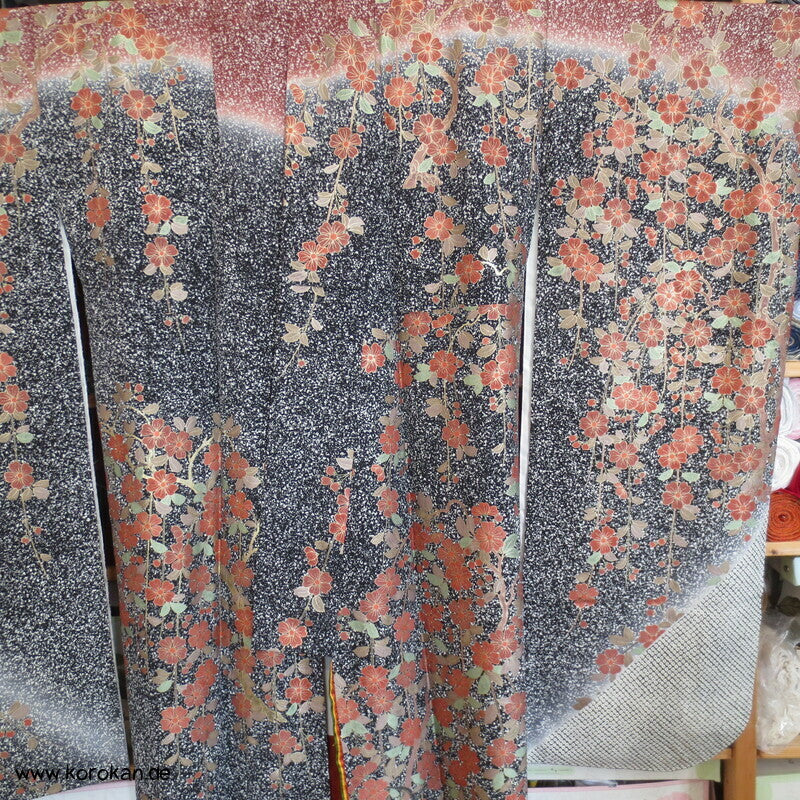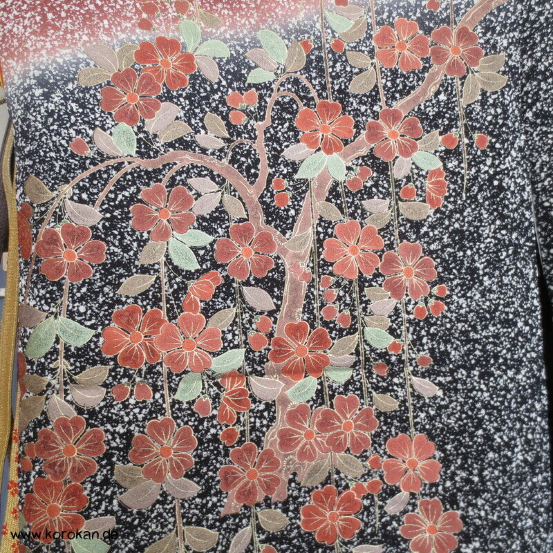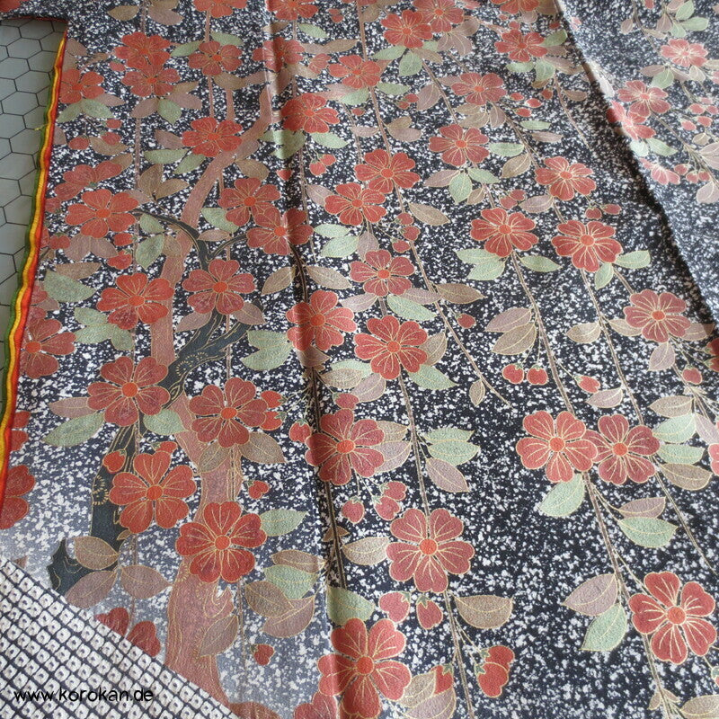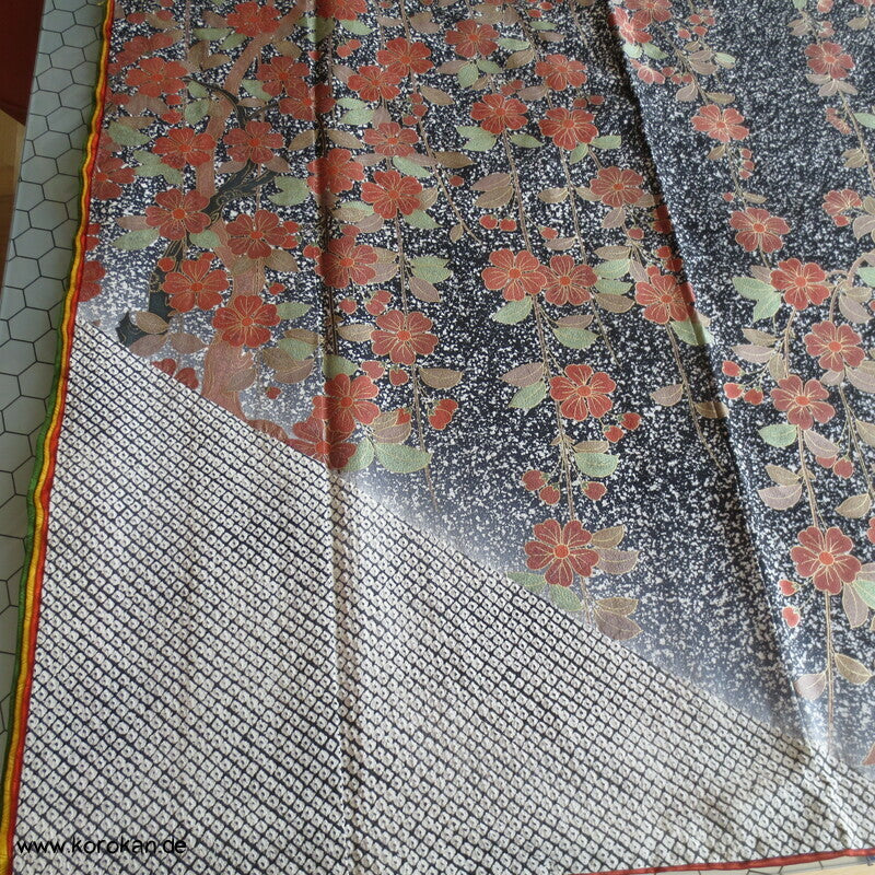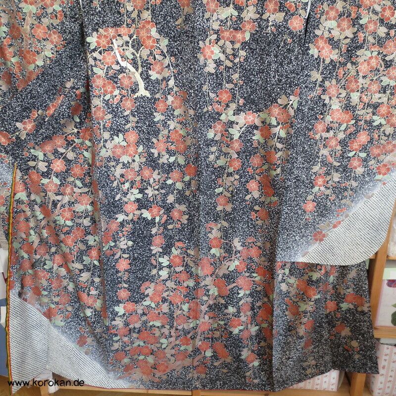 Vintage Furisode Seidencrepe fallende Blütenzweige bei Nacht mit viel Gold
