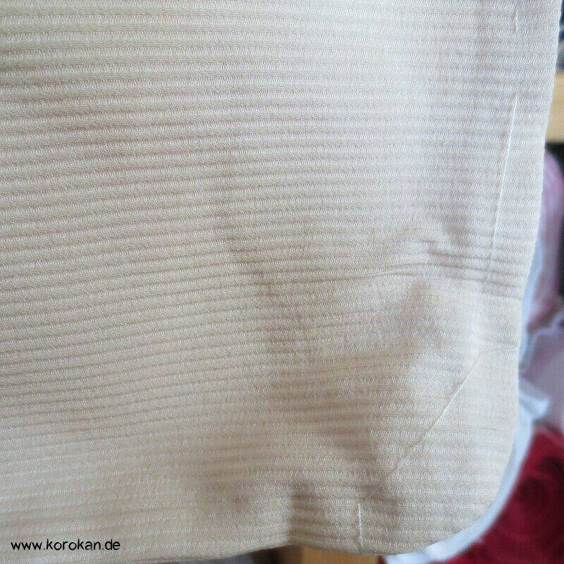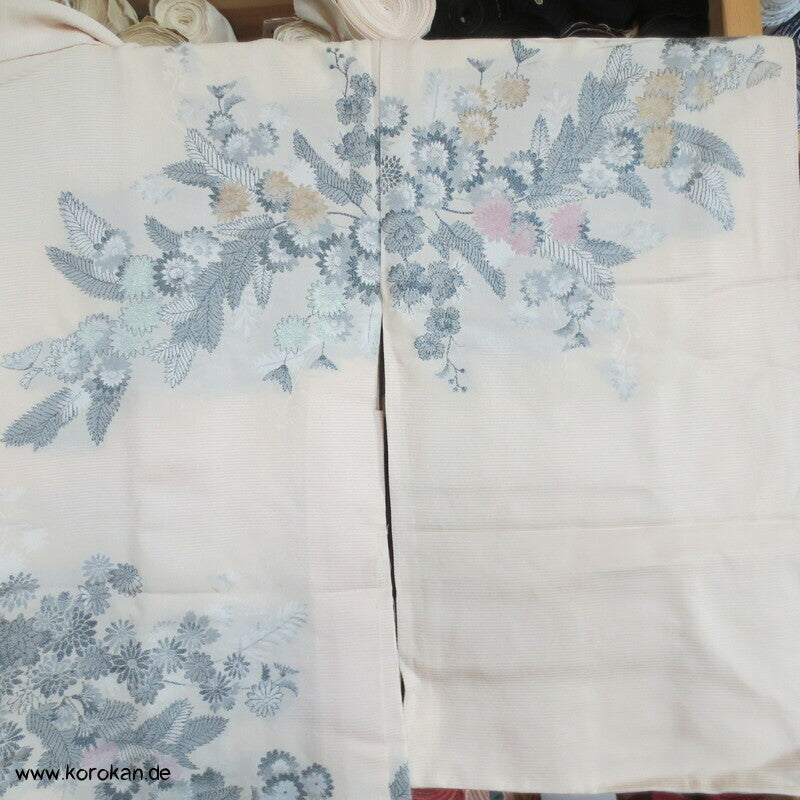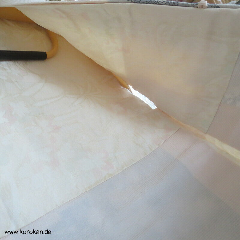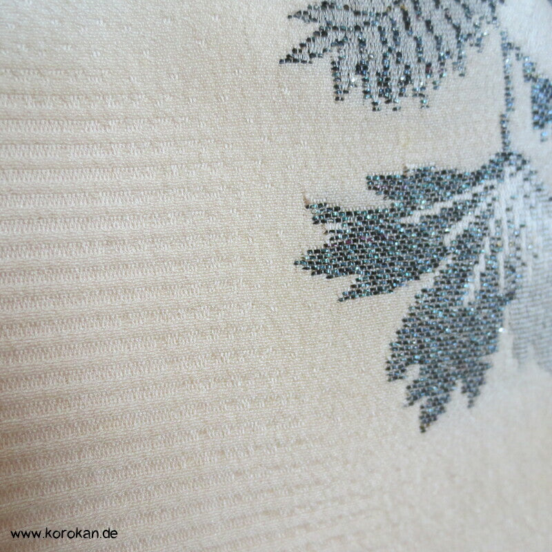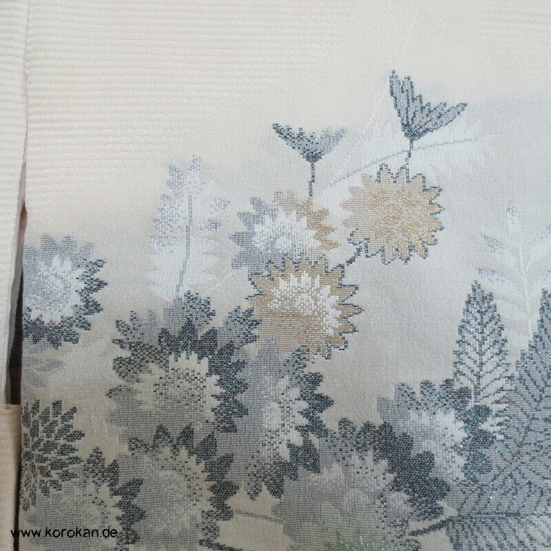 japanische Vintage Haori Kimono Jacke aus feinem, naturfarbenem Seidenbrokat mit eingewebten Chrysanthemen Blüten und hellem Seidenfutter