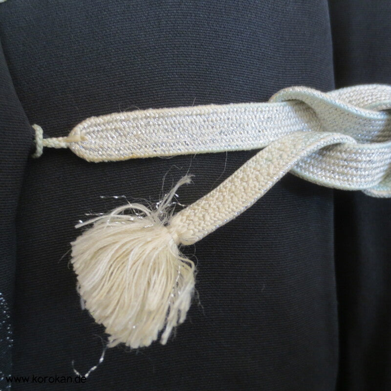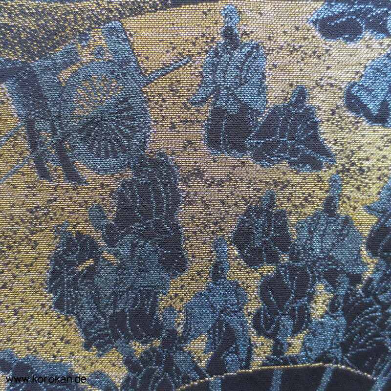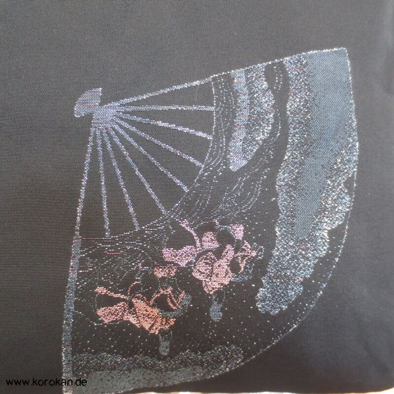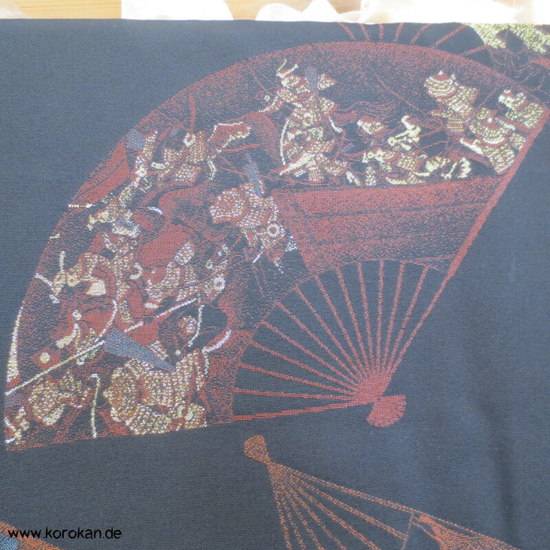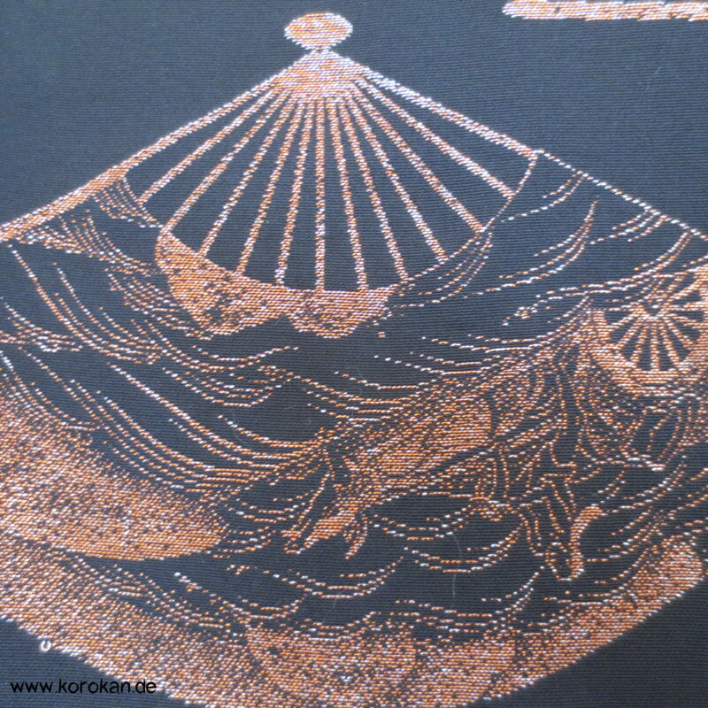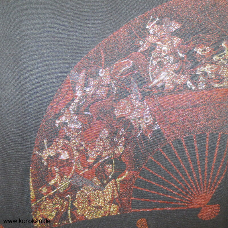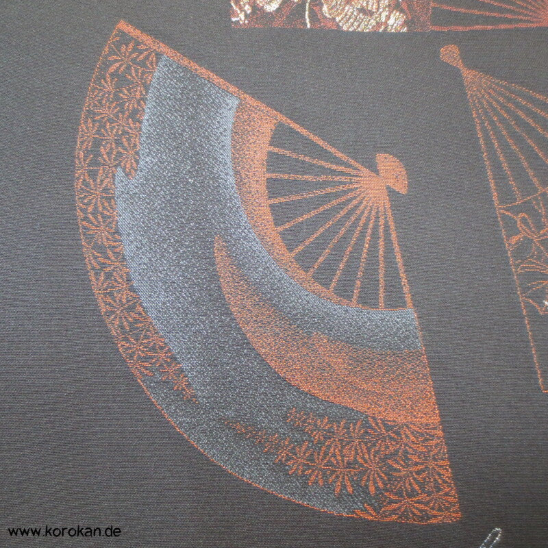 Vintage, antiker Haori Kimono Jacke aus feiner, schwarzer japanischer Seide Brokat mit gewebten Fächern mit Motiven Urushi und Gold, oberem hellen Seidendamastfutter