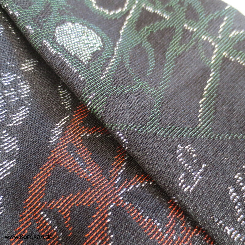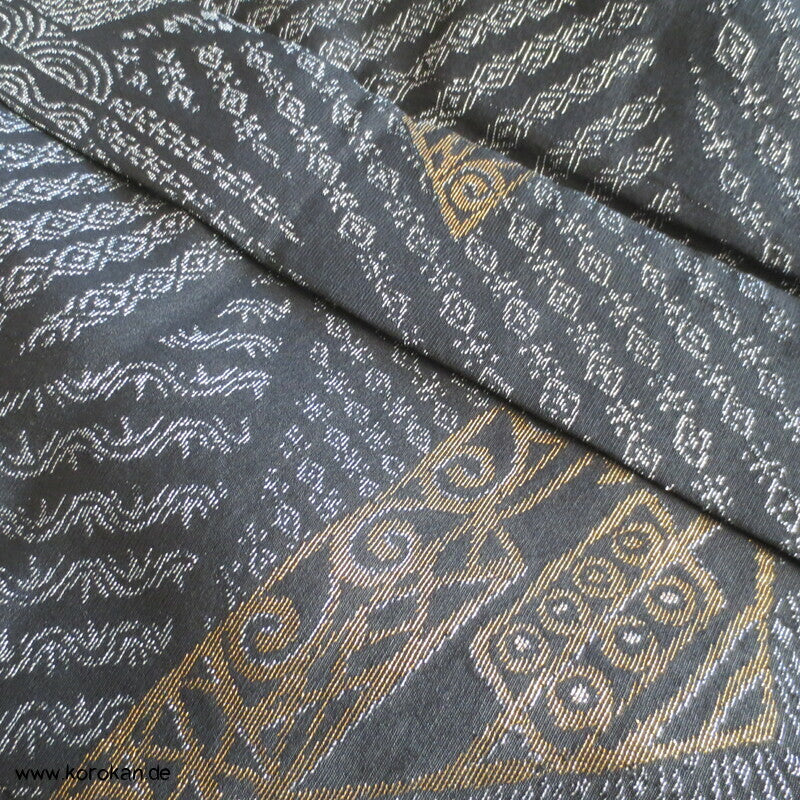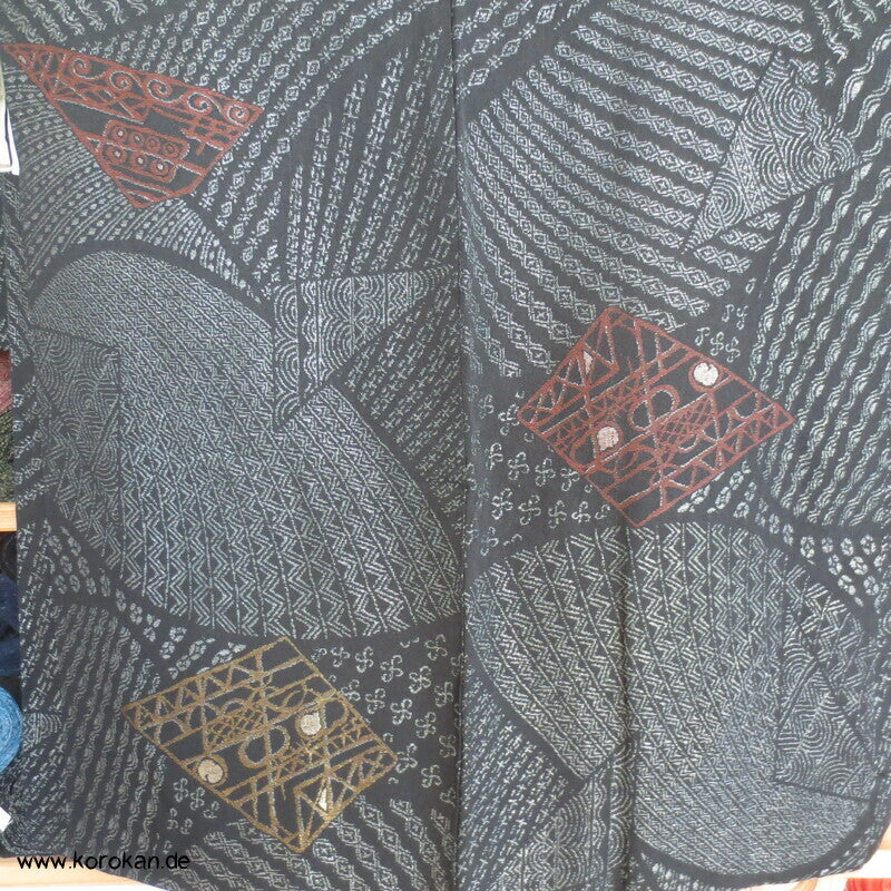 Vintage Haori Kimono Jacke aus feiner, schwarzer japanischer Crepe Seidenbrokat mit eingewebten gold, silber und Urushi Fäden die ein modernes Steinplattenmuster bilden und einem hellen oberen Damast Seidenfutter mit Chrysanthemen.
