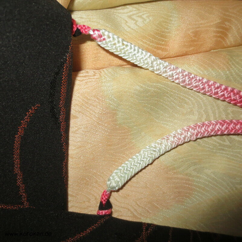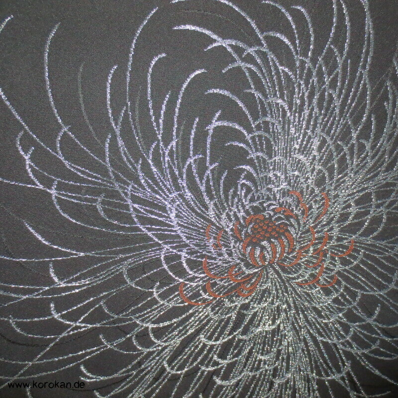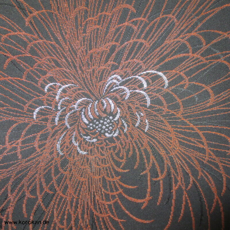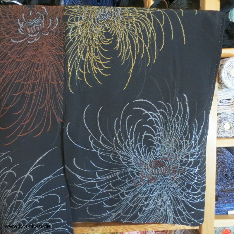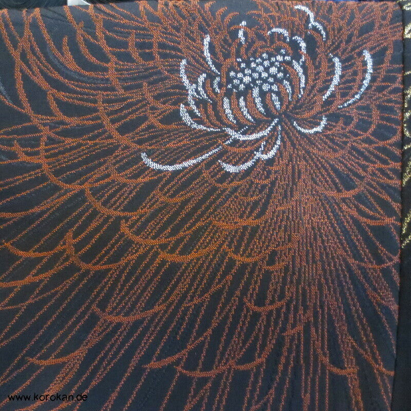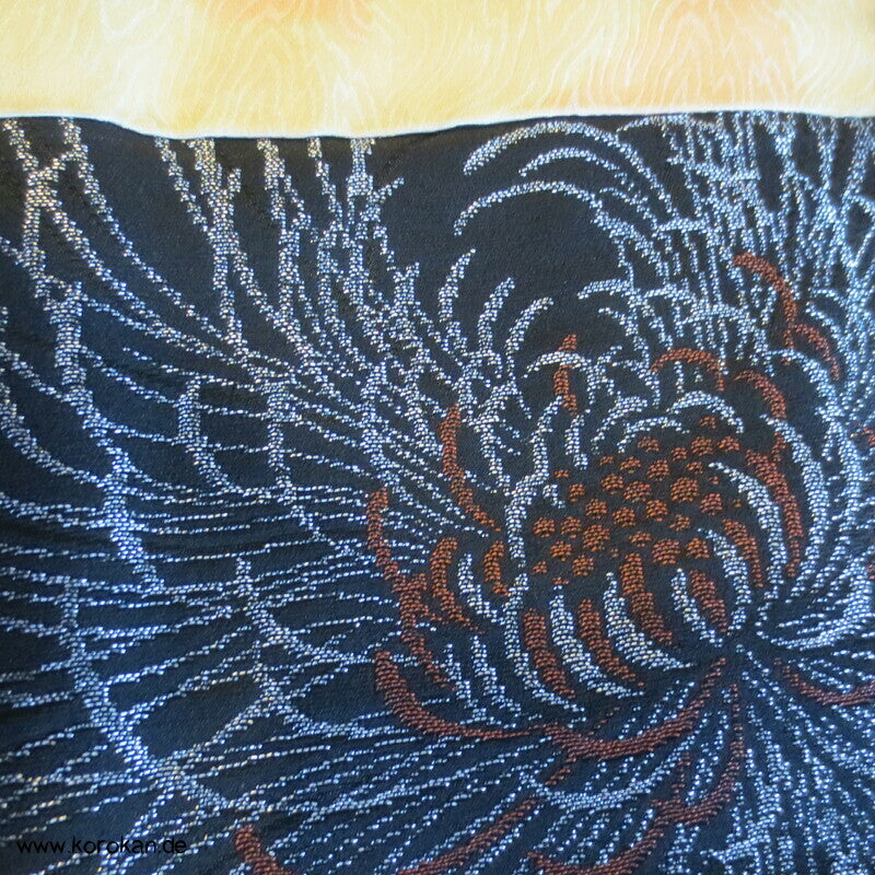 Vintage, antiker Haori Kimono Jacke aus feiner, schwarzer japanischer Seide Brokat mit gewebten riesigen Rangiku Crazy Chrysanthemen Urushi und Gold, oberem hellen Seidenfutter, mit Himo