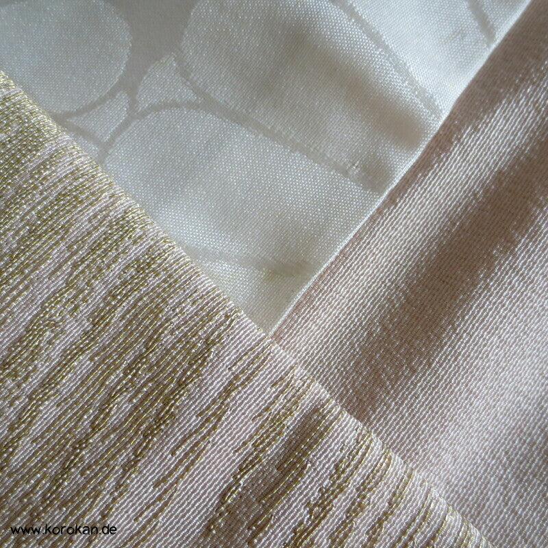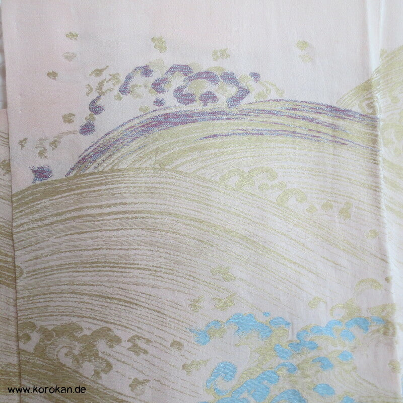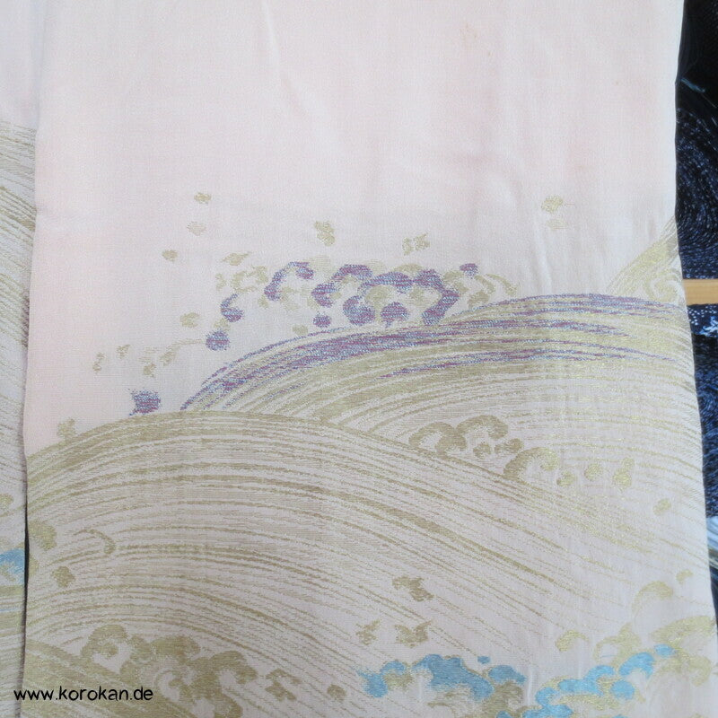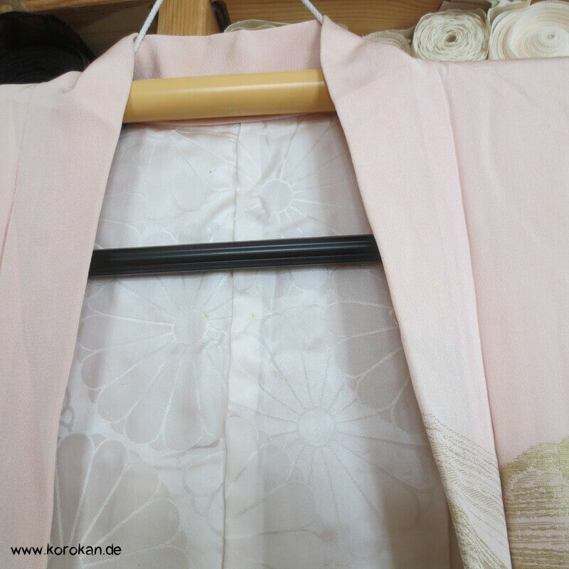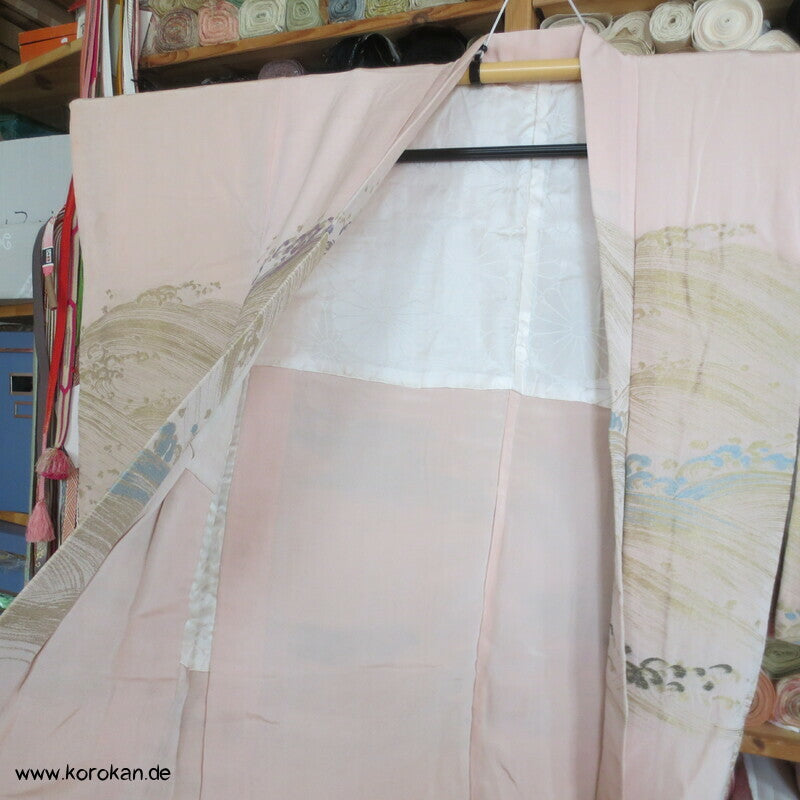 japanische Vintage Haori Kimono Jacke aus feinem, blassrosa Seidenbrokat mit eingewebten Urushi und goldenen Wellen und hellem Seidenfutter