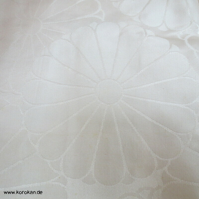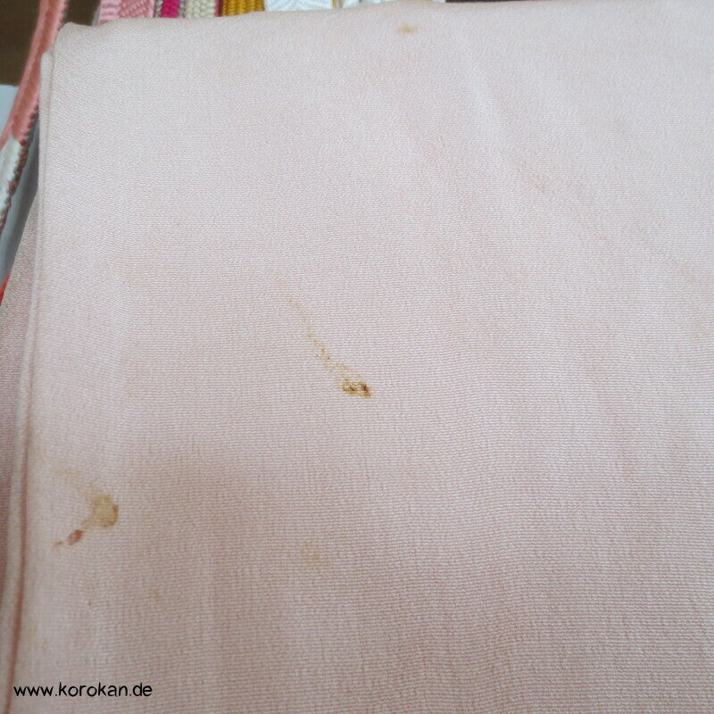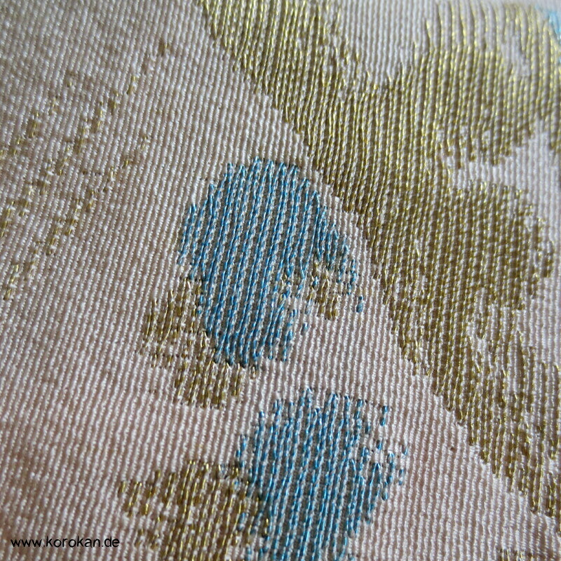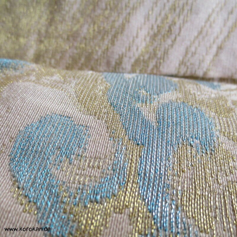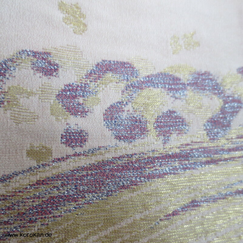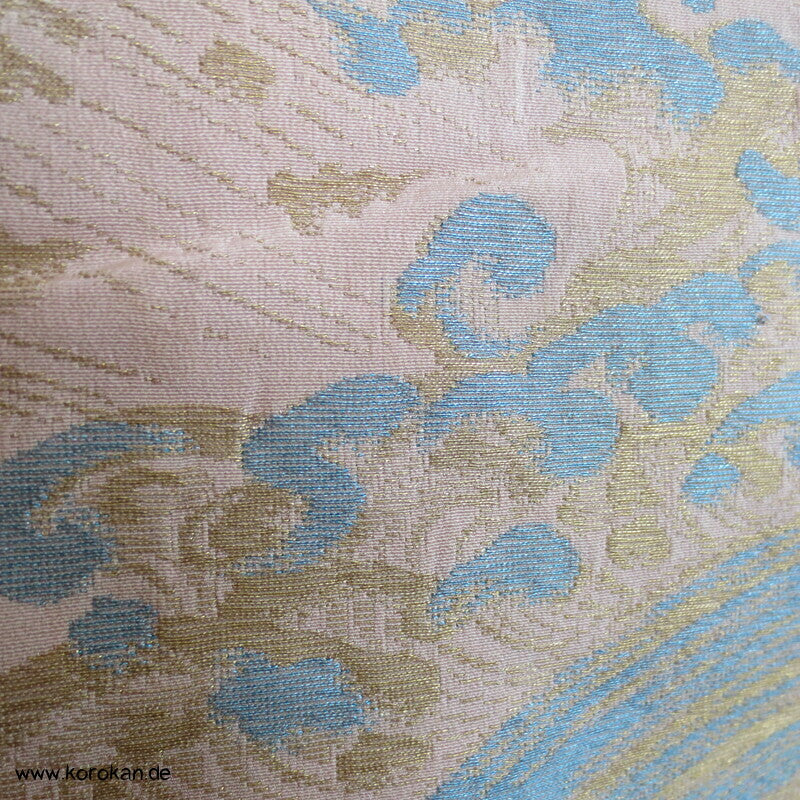 japanische Vintage Haori Kimono Jacke aus feinem, blassrosa Seidenbrokat mit eingewebten Urushi und goldenen Wellen und hellem Seidenfutter