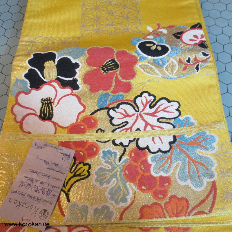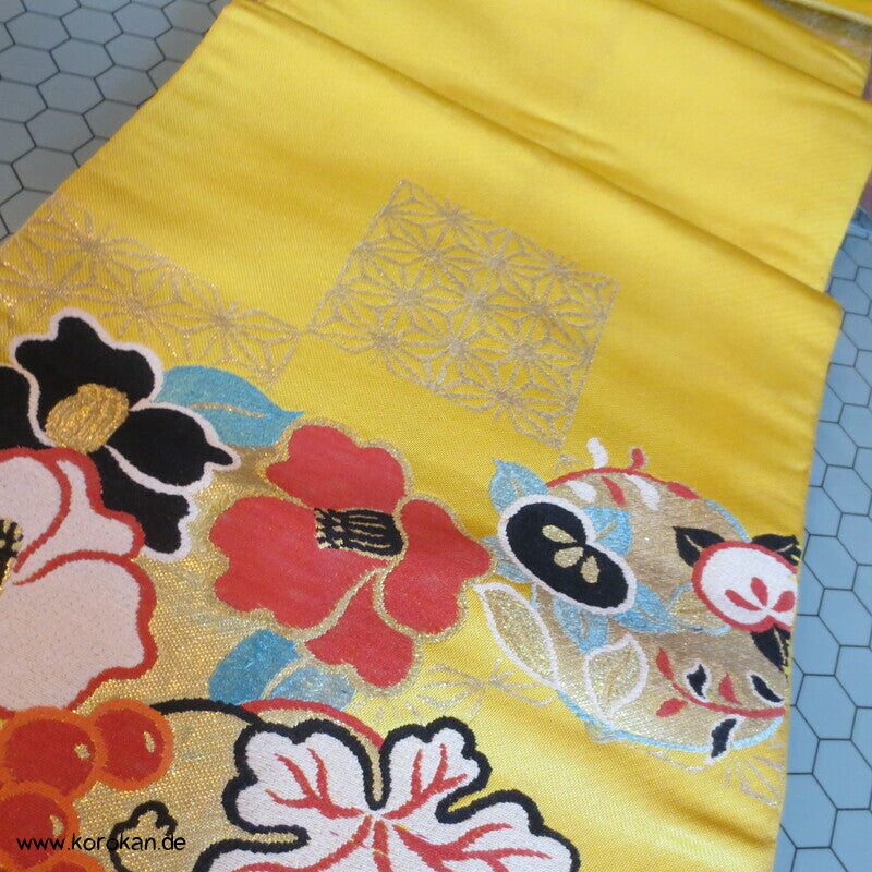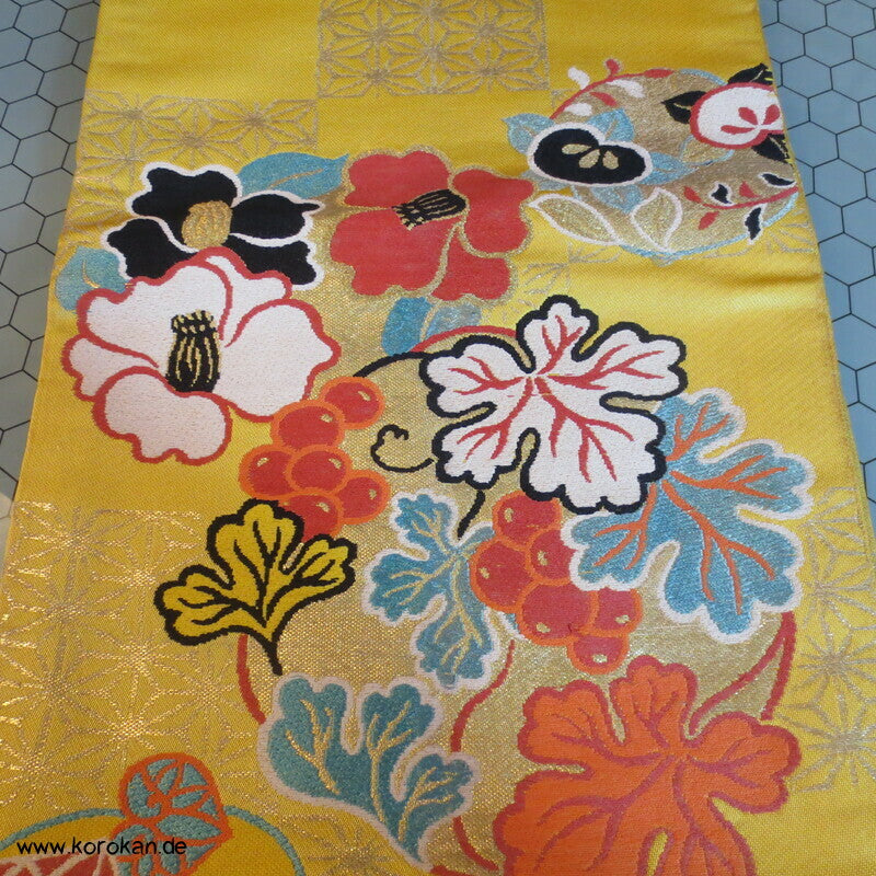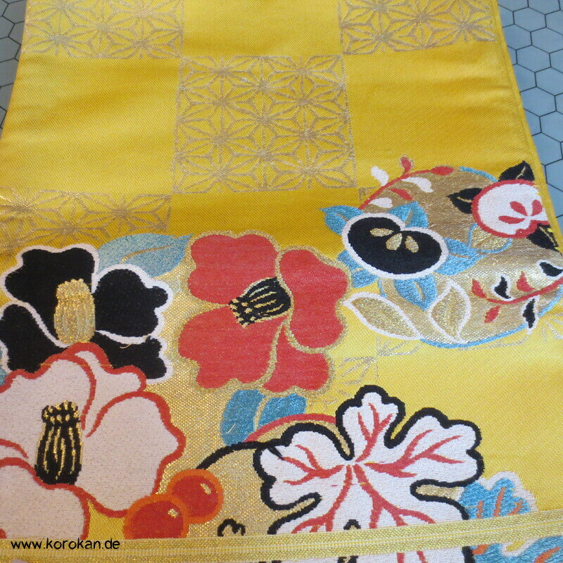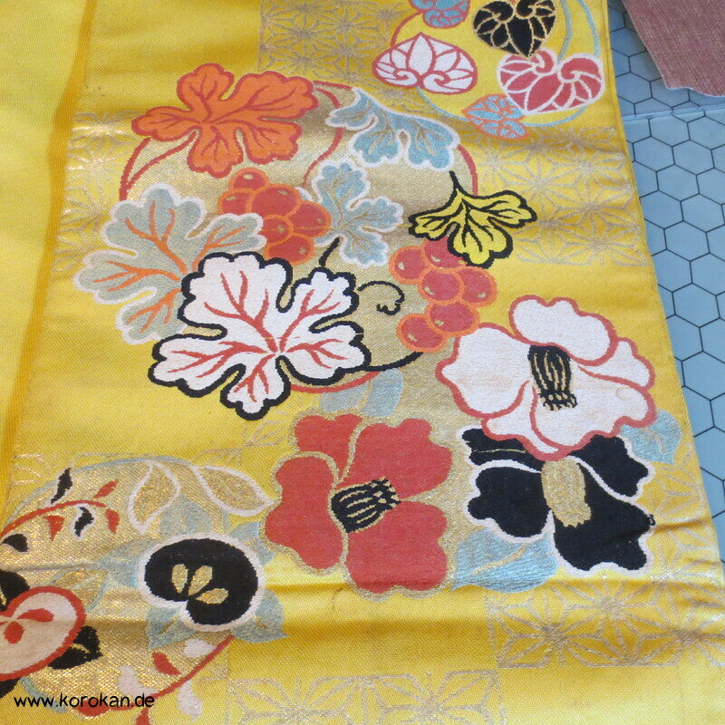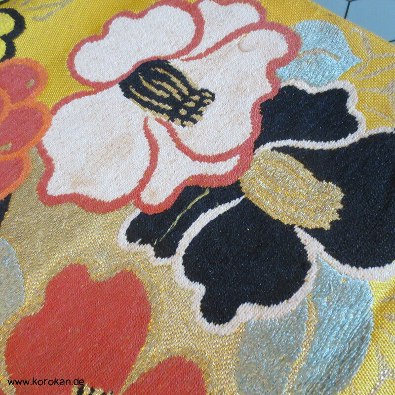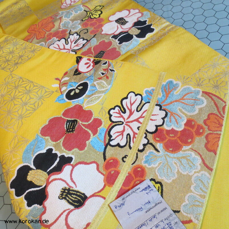 Vintage Fukuro Obi für Kimono Seidenbrokat prächtige Blüten auf Rondellen auf gelb