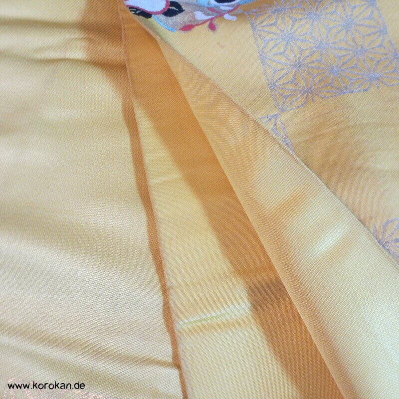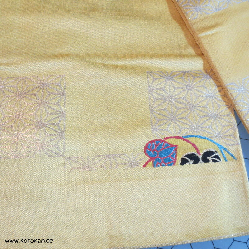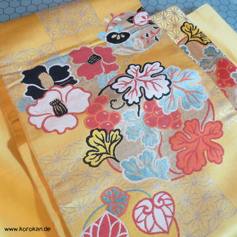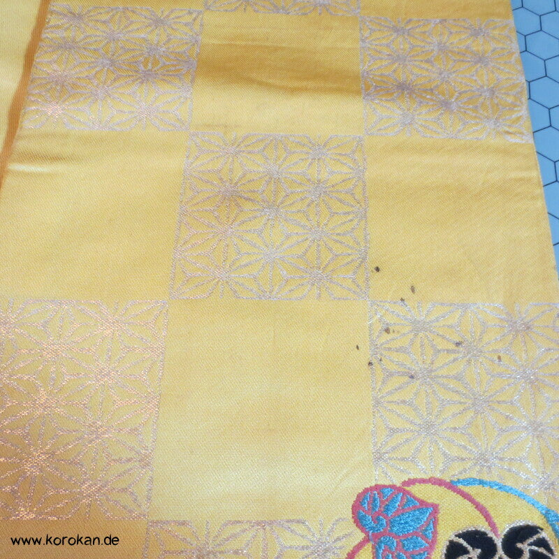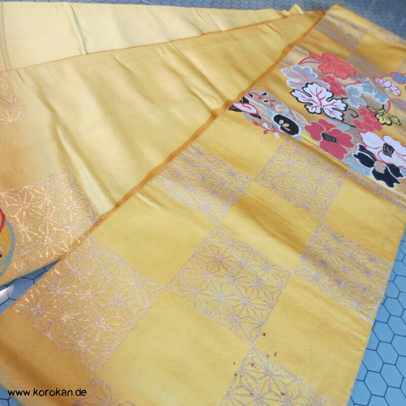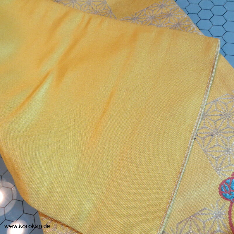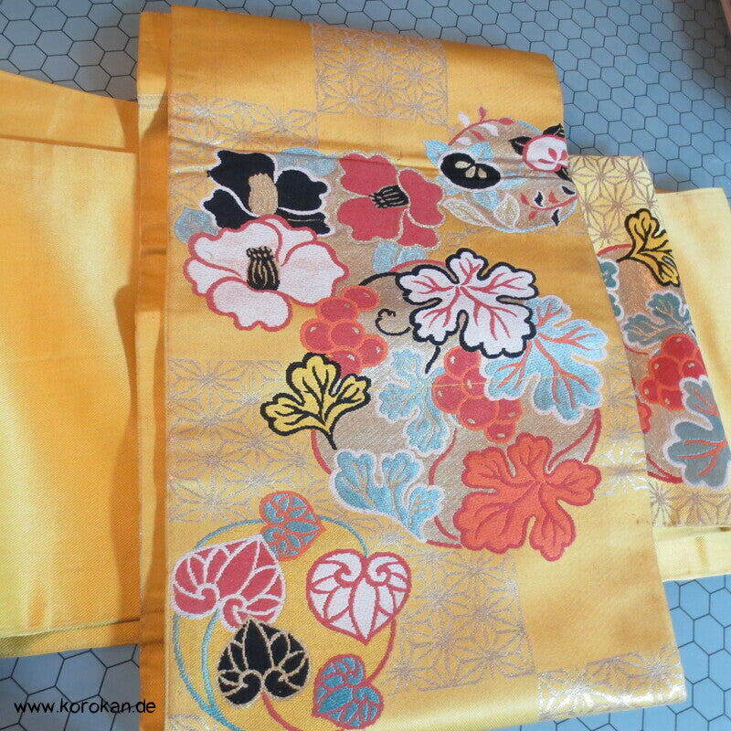 Vintage Fukuro Obi für Kimono Seidenbrokat prächtige Blüten auf Rondellen auf gelb