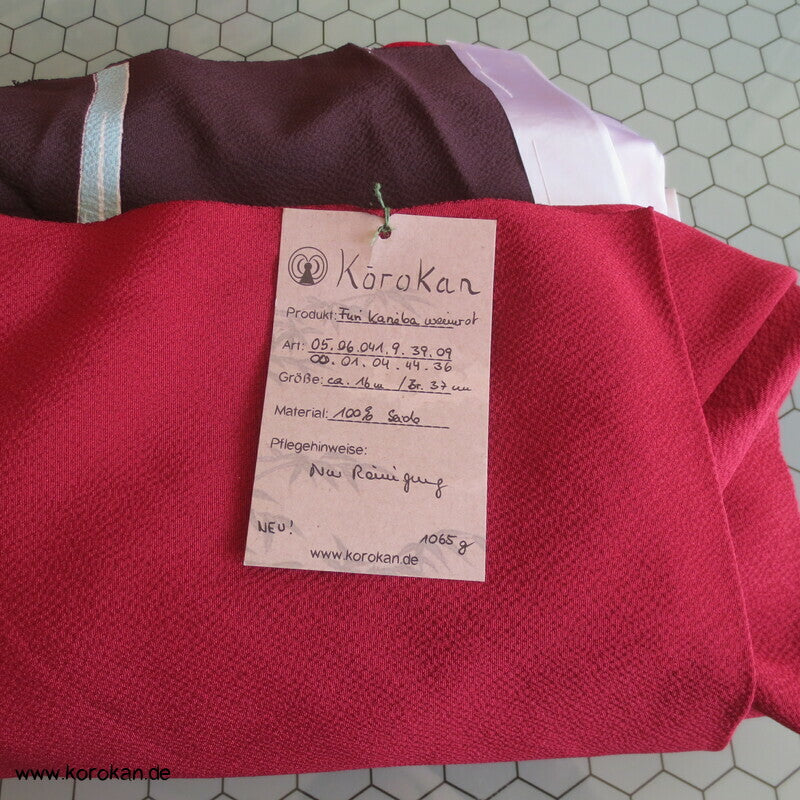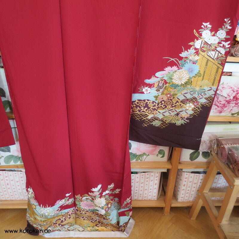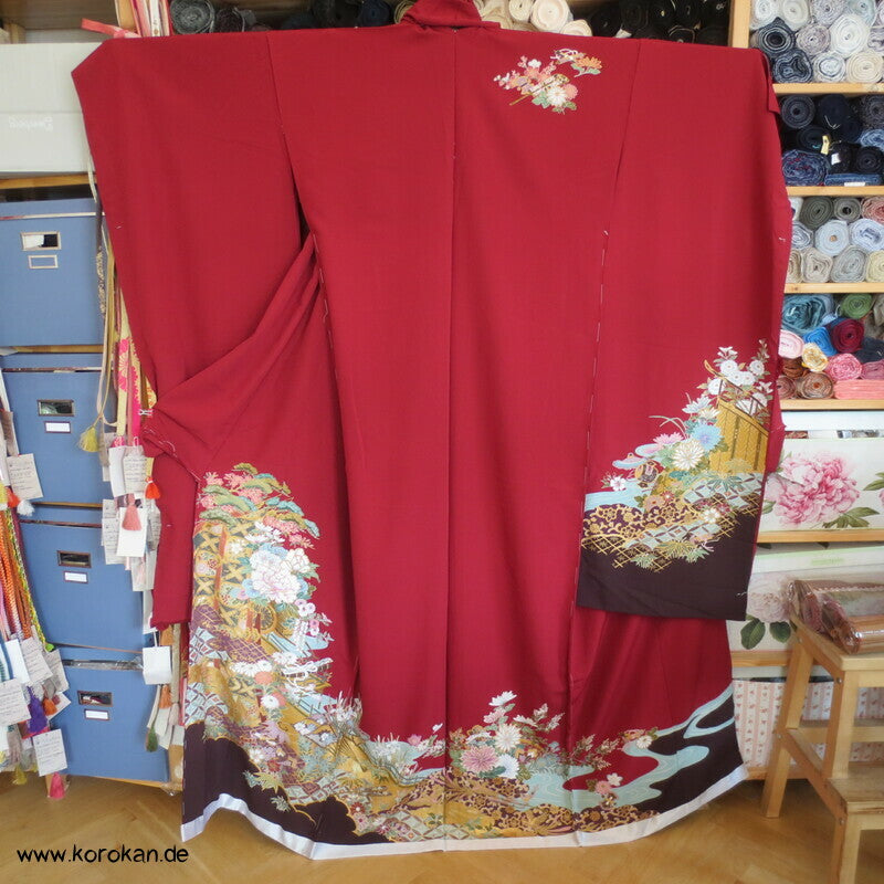 Vintage unbenutzter Karieba Furisode Kimono Seidendamast Stoff klassische japanische Motive auf weinrot