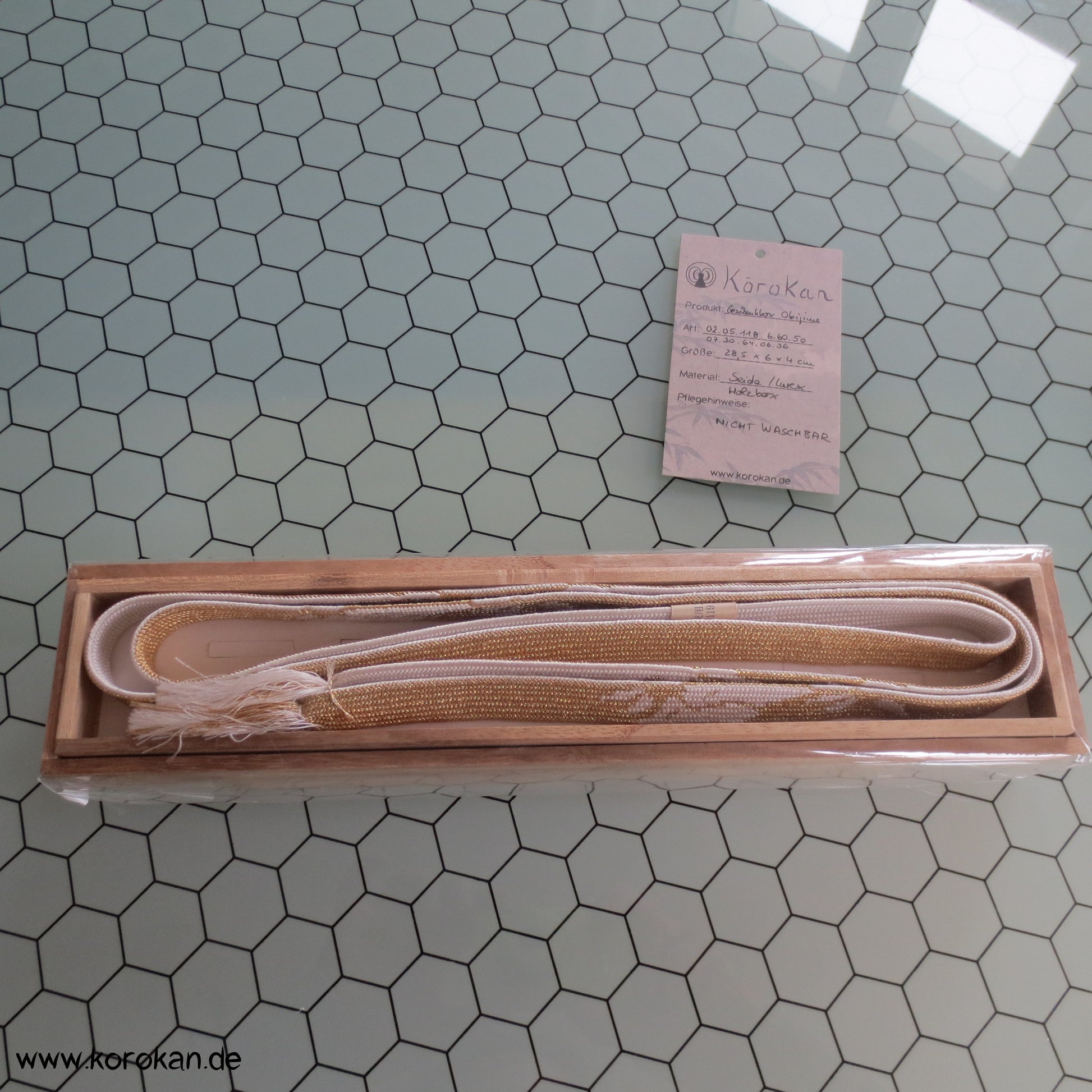 flacher Obijime weiß mit gold, Kranich, Troddeln in Holzbox