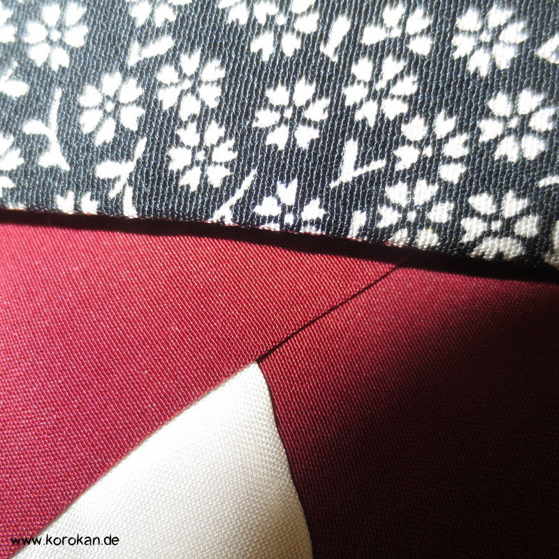 Vintage Komon Kimono Mini Blüten weiß auf schwarz Chirimen Seidencrepe, oberen hellen Seiden Futter und unterem Hakkake Futter blassrote Seide