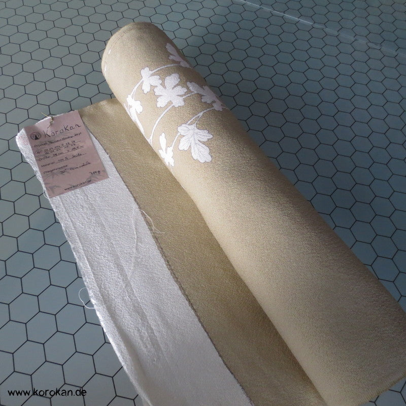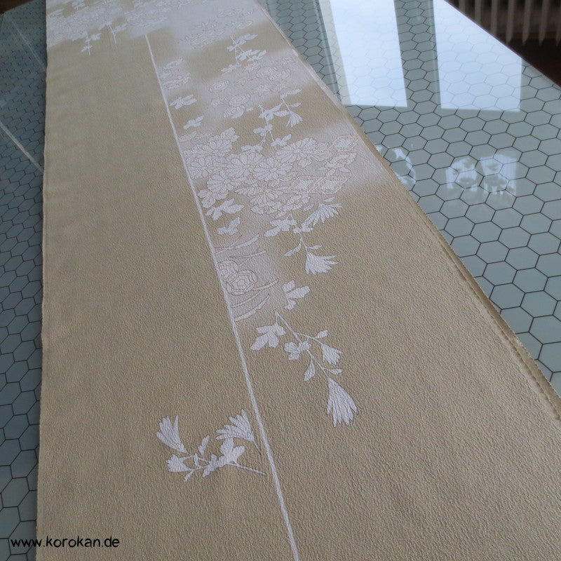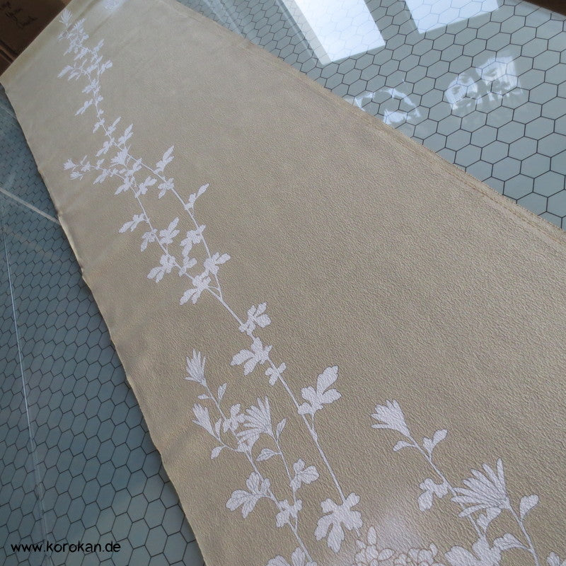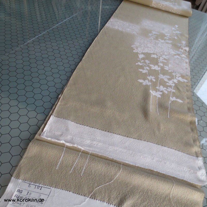 weiße Blüten auf khaki Seidencrepe Homongi Kimono Tanmono Stoffrolle