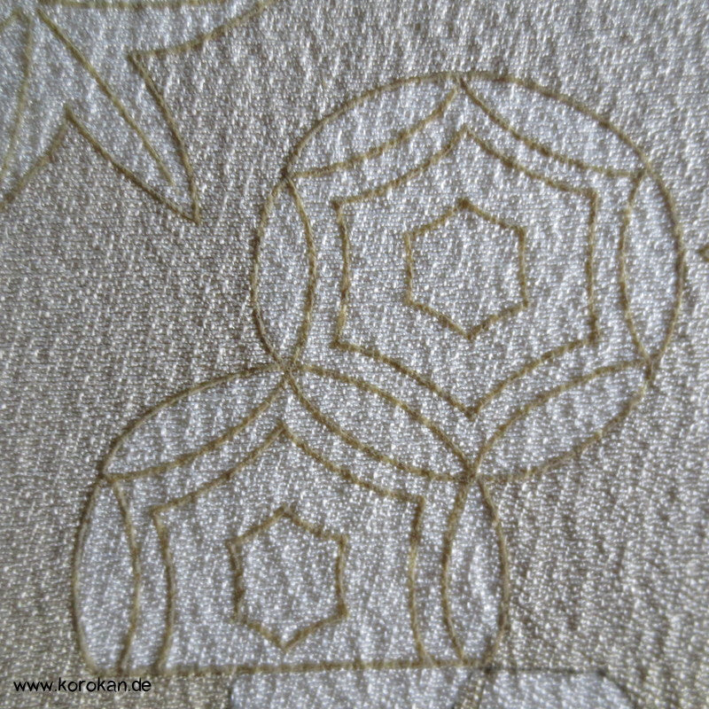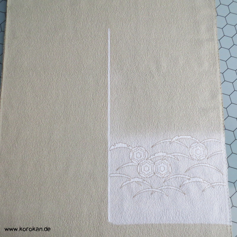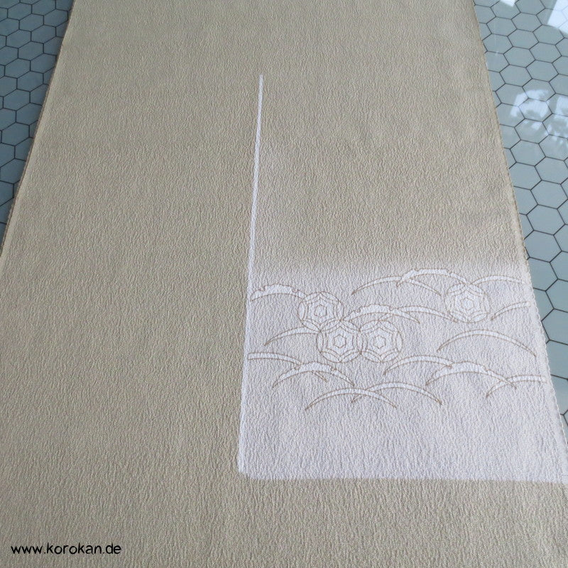 Vintage unbenutzter japanischer Stoffballen Chirimen Crepe Seide, zarte weiße Auslassungen als Muster umrandet mit aufgetragener Gutta Percha auf einem khaki beige für einen ganzen Homongi Kimono. Das Muster ist unregelmäßig im Stoff verteilt und wird erst durch das genaue Zusammensetzen der Bahnen ein ganzes Bild.