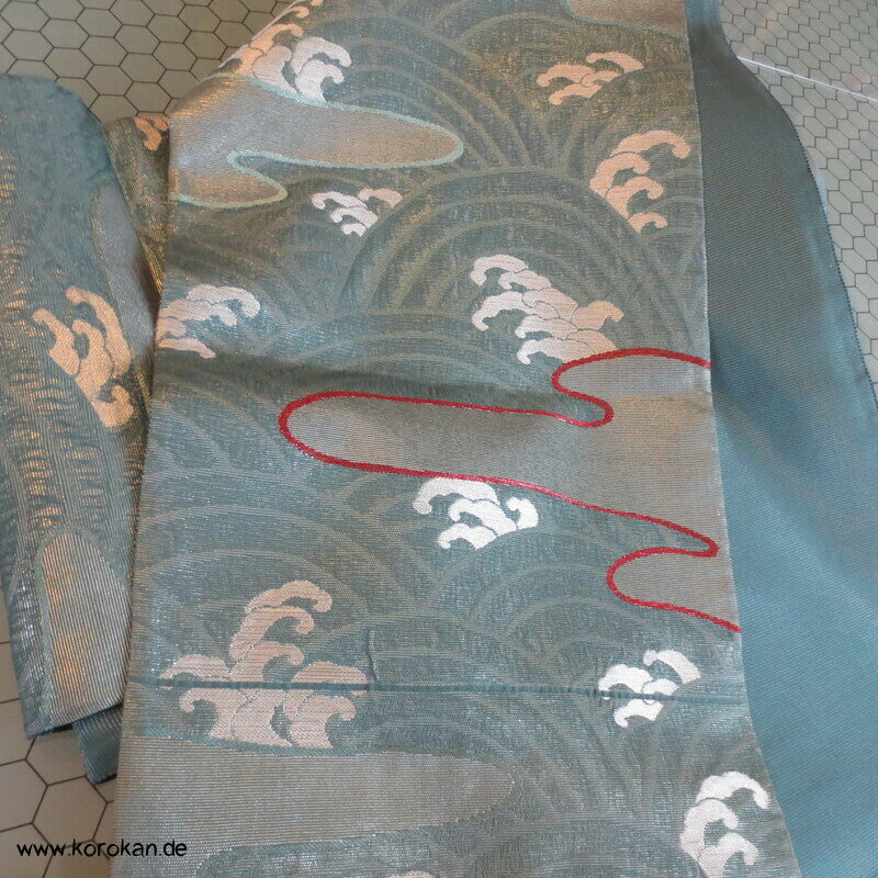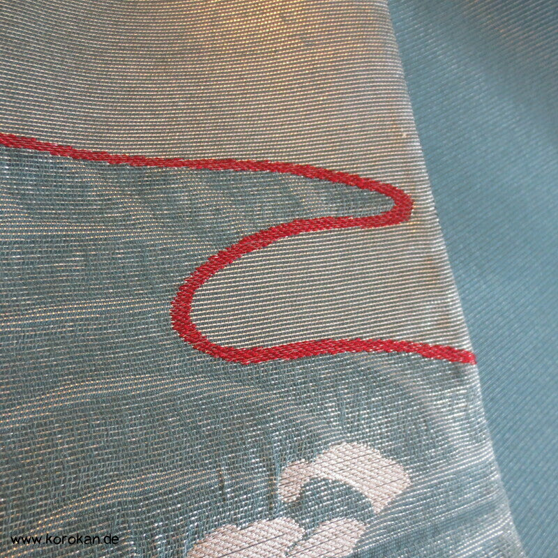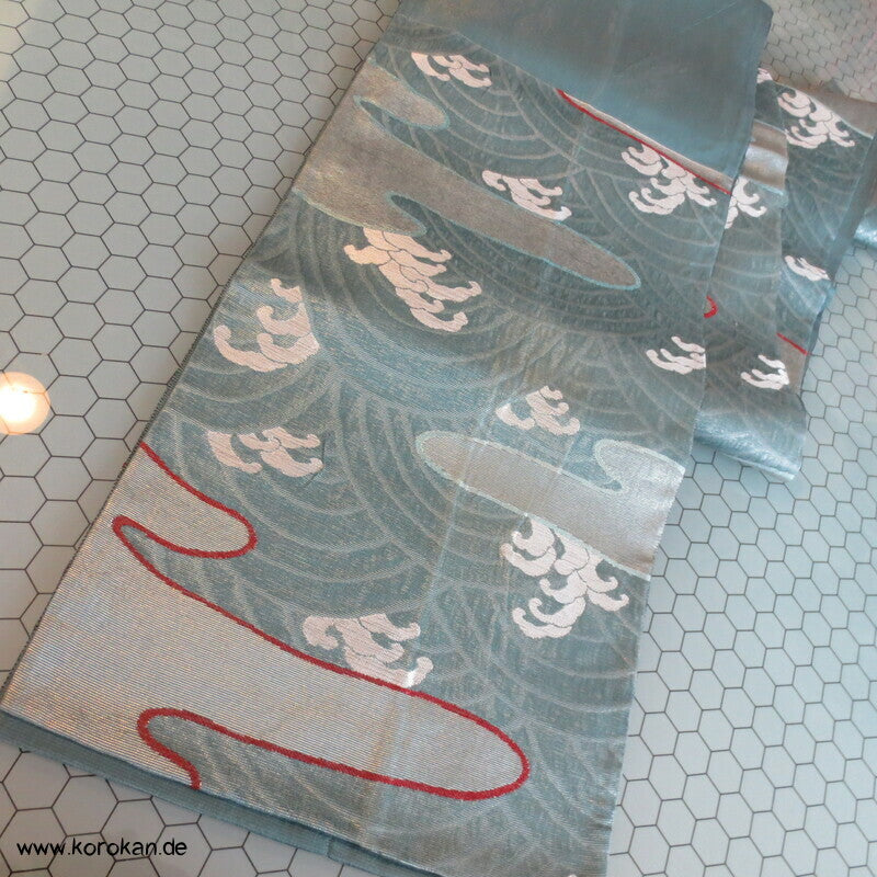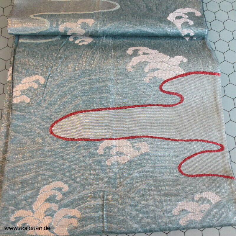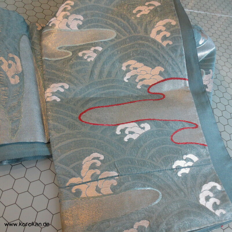 Vintage Fukuro silberweiße Meereswellen eingewebt blaugrau mit rot umrandeten Nebelschwaden