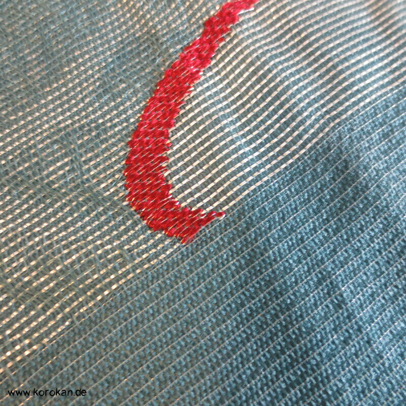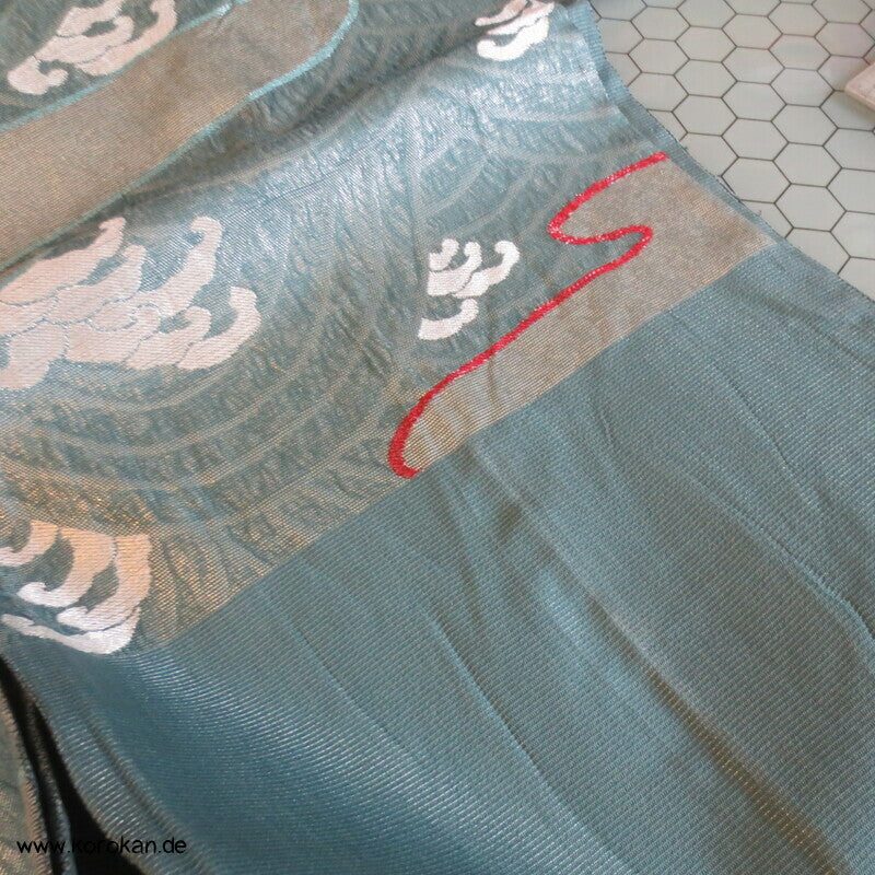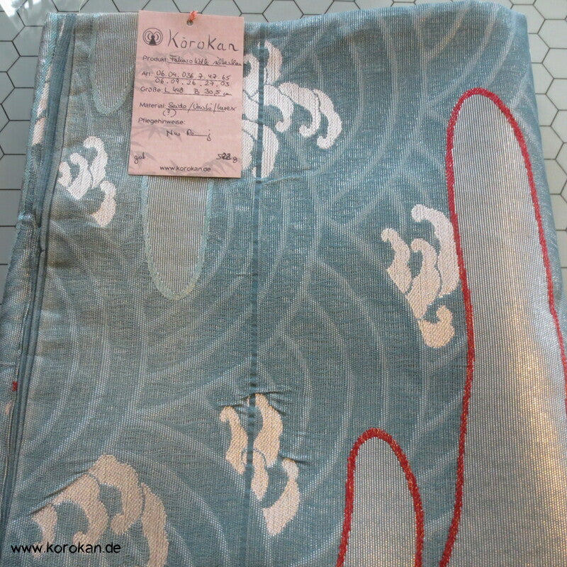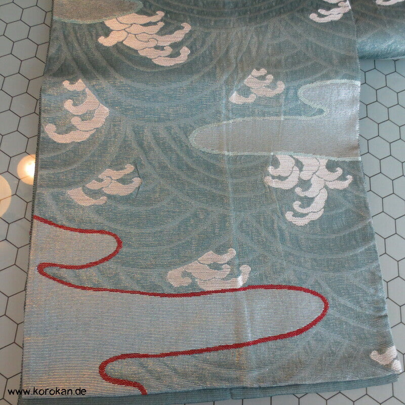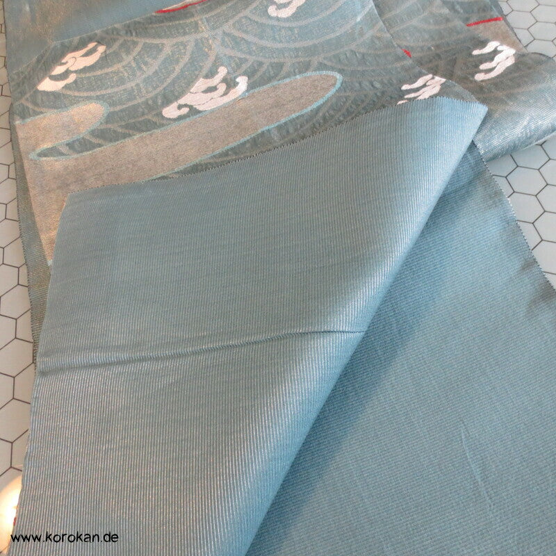 Vintage Fukuro silberweiße Meereswellen eingewebt blaugrau mit rot umrandeten Nebelschwaden